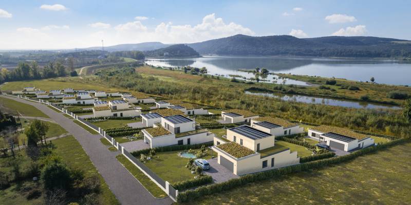 Eladásra kínálunk Székesfehérvár vonzáskörzetében a Fehérvárcsurgói víztározó közvetlen partján, rekreációs vízparti területen, 93m2-es, IKER apartmanházakat.A modern kivitelezésű ikerházak, kedvező energetikai besorolással, magas műszaki tartalommal rendelkeznek.Az új építésű ikerházak kialakítása alaprajz szerint: - előszoba- amerikai konyha + étkező- nappali- 2 hálószoba- 2 fürdőszoba- közlekedő- háztartási helyiség, - garázs- teraszLegfőbb jellemzők: • hőszivattyú• passzív ház szintű szigetelés• automata szellőző rendszer• megújuló zöld energia• gondozásmentes zöld tető• 625 m2-es telek• automata öntöző rendszer, • elektromos kapu és elektromos garázs kapu, video telefon a kapunál• elektromos motoros redőnyök• beépített szúnyoghálók• melegburkolati padló• hidegburkolatokA villapark minden egyes pontjáról a csodálatos panorámát csodálhatjuk.Az ingatlanokat úgy terveztük, hogy funkciójában kiszolgálja egy család minden kényelmét és a praktikumot.Az épülő házakat erdő veszi körül, így a nyugodt, csendes környezet garantált. A csekély gépjárműforgalom miatt ideális választás kisgyermekes családoknak.A villaparktól a Károlyi Kastély néhány percre, a központ egy rövid autóútra található. A tó és környéke kiváló túrázó, horgász- és vadászparadicsom, számos kikapcsolódási és rekreációs lehetőséggel.Aki a csendre, nyugalomra vágyik a zöldövezetben, luxus környezetben szeretne élni, de fontos hogy elérhető távolságra legyen a város nyüzsgése is, annak kiváló választás a Gaia Villa Park.Székesfehérvár 15 percre (16km), Budapest egy óra távolságra (80km), Veszprém negyven percre (45km), a Balaton elérése ötven percet (65km) vesz igénybe. A \"sógorok\" Ausztria (Bécs) két óra (200km) alatt elérhető.Hitelre van szüksége? Az Otthon Centrumnál bankfüggetlen tanácsadó kollégánk, díjmentes bank semleges hitelügyintézéssel áll rendelkezésére.Segítségére lesz az önnek legmegfelelőbb konstrukció kiválasztásában.További információért és megtekintési időpontért hívjon bizalommal a hét bármely napján!