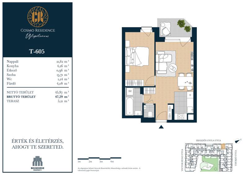 Projekt bemutatásaBudapest egyik legvonzóbb és legkeresettebb városrészében, Újlipótváros szívében egy új, exkluzív lakópark épül: az Cosmo Residence. A Hegedűs Gyula, Visegrádi, Victor Hugo és Thurzó utcák által körülhatárolt területen elhelyezkedő ingatlanfejlesztés a városrész ikonikus, nagypolgári hangulatát ötvözi, modern életstílussal, magas színvonalú építészeti megoldásokkal és első osztályú kényelemmel.A Cosmo Residence nemcsak egy újabb lakópark – hanem egy életstílus, amely a belvárosi pezsgést és a nyugodt, zöld környezetet egyaránt biztosítja lakóinak. Az ingatlan 2027. első felére készül el, és összesen 230 változatos méretű és elrendezésű lakást kínál, a 32 m2-es stúdiólakásoktól kezdve egészen a tágas, 125 m2-es, nappali + három hálószobás lakásokig. A legtöbb lakás erkéllyel rendelkezik, a legfelső szinten pedig exkluzív penthouse lakások várják azokat, akik a privát tetőterasz nyújtotta különleges panorámát szeretnék élvezni.A lakások tervezésekor több mint 4000 vevői visszajelzést vettünk figyelembe, így a terek és elrendezések maximálisan alkalmazkodnak a mai modern élet igényeihez. A belső kialakítások során lehetőség van egyedi igények figyelembevételére is, amit belsőépítészeti kollekciók segítenek. A 8 szintes épületben változatos méretű üzlethelyiségek is kialakításra kerülnek, melyek a földszinten kapnak helyet, további kényelmet biztosítva a lakók számára.A Biggeorge Property legújabb fejlesztése, a Cosmo Residence Budapest 13. kerületének közkedvelt helyszínén, Újlipótváros szívében épül, a Hegedűs Gyula, Visegrádi, Victor Hugo és Thurzó utca által határolt területen. A környék hangulatát tükröző épület 230 energiahatékony otthont kínál, amelyek megfelelnek a legújabb környezettudatos elvárásoknak. A fejlesztés részeként üzletek, tárolók és gépkocsi-beállók is kialakításra kerülnek, amelyek tovább növelik az épület lakóinak kényelmét.