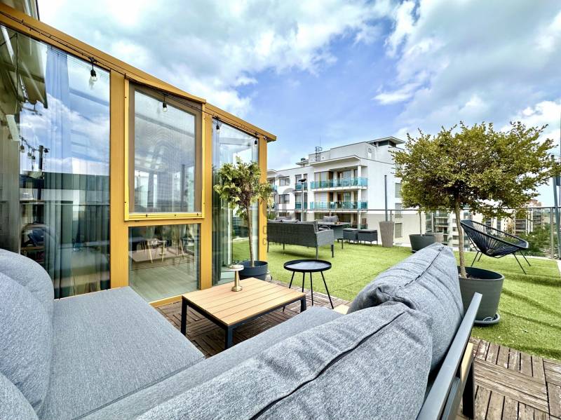 A XIII. kerület legnépszerűbb lakónegyedében, a Marina parton, a Duna terasz prémiumban keresi új tulajdonosát egy amerikai konyhás nappali + hálószobás, 70 m2-es privát terasszal és egy 14 m2-es erkéllyel rendelkező napfényes lakás! Ha különleges és értékálló ingatlant keres a Foka öböl közelében, ami a modern életstílust az otthonos, családias hangulattal ötvözi, akkor ezt feltétlenül nézze meg!MIÉRT IDEÁLIS A LAKÁS?- 8. emeleti, 49 m2-es, 2 szobás, 70 m2-es privát terasszal, 16 m2-es télikerttel és 14 m2-es erkéllyel rendelkező ingatlan.- Felosztása: előtér, amerikai konyhás nappali és étkező, hálószoba, kádas fürdőszoba, WC, terasz télikerttel, erkély.- A különleges saroklakás kialakítása modern, elosztása logikus, a szobák körbe napozottak.- A tágas nappaliból a télikerten keresztül juthatunk a privát teraszra, a hálószobából pedig kijárat van a nagy erkélyre. – A 16 m2-es télikert egyedileg méretre készült, teljesen téliesített, hűtő-fűtő klímával és külső motoros napellenző árnyékolóval felszerelt. - A lakás magas minőségű és esztétikus anyagokkal, igényes burkolatokkal, prémium Jika szaniterekkel, Kludi csaptelepekkel készült.- A szobákat és az előteret laminált padlóval a fürdőszobát modern színvilágú járólappal burkolták.- Nyílászárók műanyagok, ablakai hő és hangszigetelt 2 rétegű üveggel szereltek, az élettér kifejezetten világos.- Fűtéséről házközponti rendszer gondoskodik radiátoros hőleadással, a hűtést légkondicionáló berendezések biztosítják.- A lakás egyedi hőmennyiség mérővel, vízórával, illetve elektromos mérőórával felszerelt, energetikai besorolása A++– Közös költsége 44.000 Ft/hó, a fűtés és melegvíz költség kb. 10.000,-Ft/hó.- Az ingatlan okosotthon rendszerrel, videós kaputelefonnal és elektromos redőnnyel felszerelt.- A vételár tartalmazza az egyedileg készített beépített bútorzatot , a konyhabútort háztartási gépekkel felszerelve, illetve a LED-es lámpatesteket.- A lakás könnyen kiadható, átlagosnál magasabb megtérülést biztosíthat.- 2 db teremgarázs beálló hely kötelezően vásárlandó az ingatlanhoz, egy elektromos töltővel 9 millió Ft-ért és egy normál beálló 8,5 millió Ft-ért.AMIT A HÁZRÓL TUDNI KELL:- 2019-ben átadott, 9 szintes, 322 lakásos, tudatosan tervezett, letisztult épület.- A lakópark a modern városi élethez igazodó építészeti stílust képviselve kínál magas minőséget.- A társasház vasbeton monolit szerkezetű, 30 cm-es Porotherm téglából álló külső kitöltő falakkal és 15 cm-es dryvit szigeteléssel.- A lakásokat 30 cm-es Szilka tégla fal választja el.- A homlokzat és a lépcsőház modern vonalvezetésű, igényes megjelenésű.- A pinceszinten és a földszinten teremgarázs beállók és tárolók, valami modern liftek biztosítják a lakók kényelmét.- Műszaki tartalma magas minőségű, innovatív megoldásokkal felhasználással készült.KÖRNYÉK ÉS KÖZLEKEDÉS:- XIII. kerület, Vizafogó városrész, Marina part, Sólyatér utca.- Kiváló infrastruktúrával és tömegközlekedéssel rendelkező, folyamatosan fejlődő terület, természetközeli környezet.- A Gyöngyös utcai M3-as metrómegálló és a Duna Plaza, 5 perc sétatávolságra van.- A 15-ös busz megállója 50 m távolságra van, a 950-es és a 950A éjszakai buszjáratok 20 percenként közlekednek.- 500 méteren belül gyalogosan elérhető minden, ami a hétköznapokhoz szükséges.- Karnyújtásnyira van gyógyszertár, orvosi rendelő, edzőtermek, mozi, éttermek és szolgáltatók sokszínű választéka.- A közelben van hajókikötő, Duna parti sétány, kerékpárút, a Dagály fürdő, és az Aréna uszoda.- A nagyobb budapesti egyetemek tömegközlekedéssel maximum 15 perc alatt elérhetők.- Az autóval közlekedők a Váci úton érhetik el Buda és Pest főbb csomópontjait, valamint az M0-ás és M2-es autópályákat.- A környék kifejezetten vonzó a fiatalok és a kozmopolita életet kedvelők számára.FINANSZÍROZÁSBAN ONLINE ÜGYINTÉZÉSSEL IS SEGÍTÜNK!- Többszörösen díjnyertes irodánk hitelszakértői 20 éves szakmai tapasztalattal várják, előre egyeztetett időpontban akár normál munkaidőn kívül is.- Bank-független Hitel Centerünk díjmentesen versenyezteti minden bank és hitelintézet kínálatát, hogy önnek a legmegfelelőbb konstrukciót megtaláljuk.- Egyedi igényekre szabott, csak nálunk elérhető egyedi ajánlatokkal, fogyasztóbarát lakáshitelekkel, babaváró hitellel, teljes körű CSOK PLUSZ ügyintézéssel állunk rendelkezésére.EGYEDI LEHETŐSÉG, ne maradjon le róla!VÁROM HÍVÁSÁT a hét minden napján!