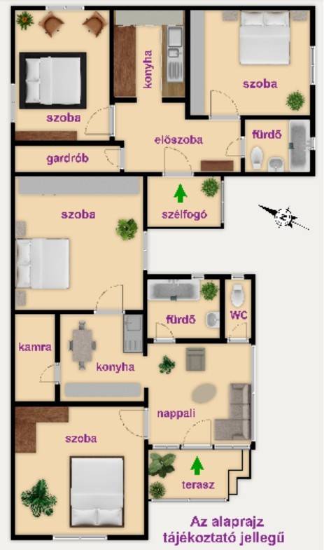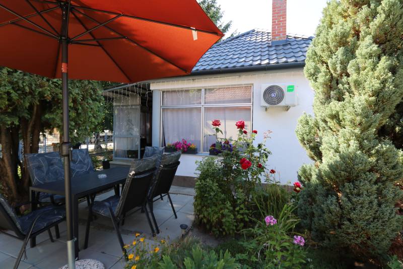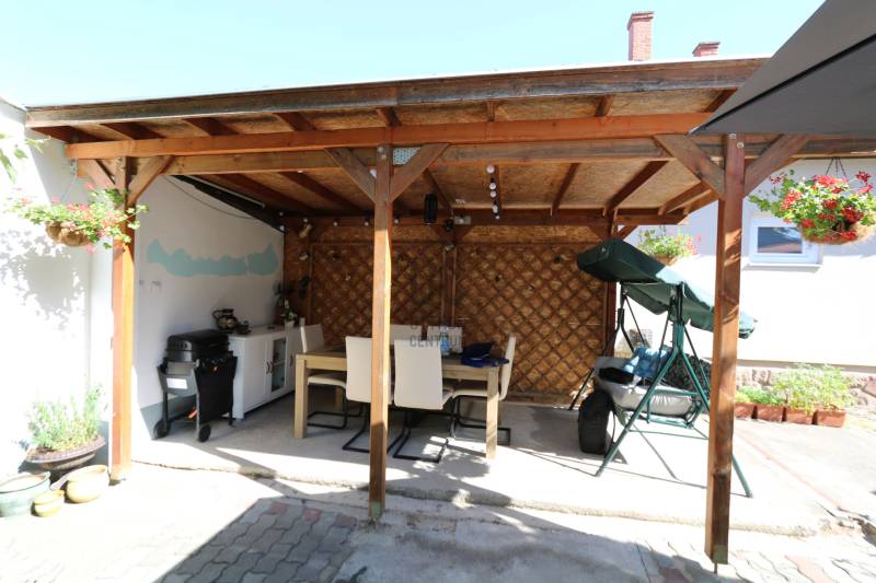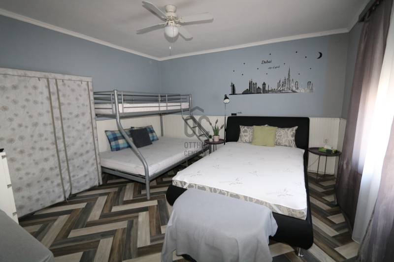 Irodánk eladásra kínál Siófok belvárosában egy 137 nm-es hasznos alapterületű (bruttó 197 nm) felújított ingatlant. A ház két külön bejáratú egységből áll, melyek közül az első kb. a 70-es években épült, hasznos alapterülete 61 nm, melyet egy fedett és három oldalról zárt 5,92 nm-es teraszon keresztül lehet megközelíteni, belépve egy 9,98 nm-es nappaliban találjuk magunkat, ahonnan balra egy 16 nm-es szoba nyílik, előre egy fürdő és külön WC található, ugyancsak balra egy 7,5 nm-es konyha, amiből a második szoba nyílik, ami 15,76 nm-es. Ennek az épületrésznek a fűtése gázkonvektorral van megoldva, valamint egy hűtő-fűtő klíma is be van szerelve. A hátsó rész 2000-ben épült, melybe egy szélfogón át lépünk be egy 6,65 nm-es előszobába, jobbra egy fürdőt találunk WC-vel, jobbra előre egy 12,94 nm-es szobát előre egy 6,56 nm-es konyhát, balra előre egy 13,16 nm-es szobát találunk. A bejárattól rögtön balra van a 3,39 nm-es gardrób. Ennek az egységnek a fűtése gáz cirkóval van megoldva, valamint ide is be van szerelve egy hűtő-fűtő klíma.A hátsó épületrész egybeépült az elsővel, de jelenleg nem átjárható, azonban össze lehet nyitni a két részt, régen is volt egy ajtó. A tető nemrég divatos antracit színű cserepes lemez héjazatot kapott. Falazata tégla, részben szigetelt, tört fehér nemes vakolattal. A nyílászárók egy része fa (geréb tokos), egy része pedig hőszigetelt műanyag.A 826 nm-es telken két melléképület is áll, melyek egyikében eredetileg egy nyári konyha található, de a jelenlegi tulajdonos egy teljes értékű szobának rendezte be. Ezen kívül rengeteg pakolásra alkalmas raktár található, valamint egy boltíves tégla falazatú hangulatos pince. Eredetileg bor tárolására használták, a telken több tő szőlő van, aki a bort szereti, itt kedvére borászkodhat. Az udvaron fúrt kút található, melyre szivattyú van kötve, ez biztosítja a kert üdeségét.Ez az ingatlan egyaránt alkalmas két generáció békés együttélésére, vagy nagy családnak (egybe nyitva), de hosszú, vagy rövidtávú kiadásra hasznosítható. Ráadásul a város nagyon jó részén található, egy kedvelt csendes kis utcában. A Fő tér 1000 m-re, a Plázs 1700 m-re található.Kérdésével, vagy megtekintési igényével kapcsolatban keressen valamelyik elérhetőségemen, akár hétvégén is.