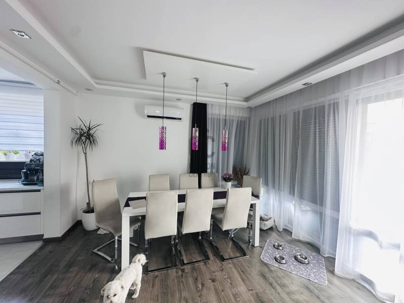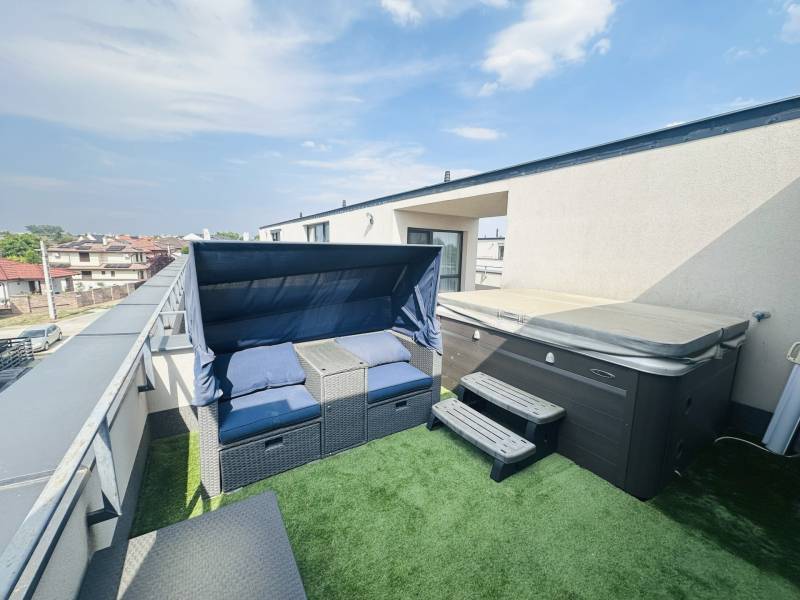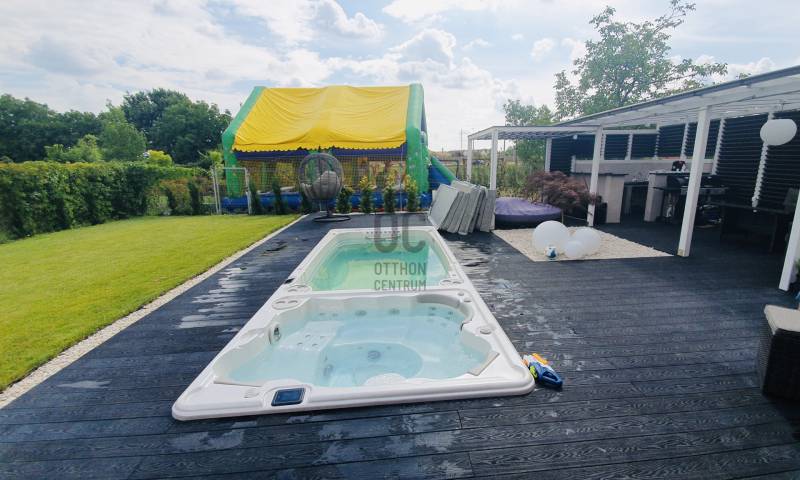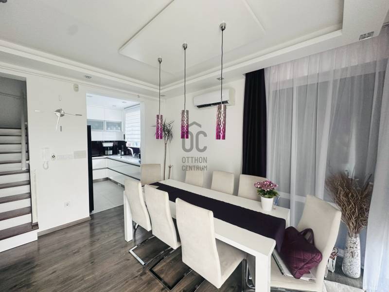Debrecen egyik legkeresettebb kertvárosi részén, a Hatvan utcai-kertben, egy különleges adottságú ingatlan várja új tulajdonosát! A 2018-ban épült, háromszintes, nappali + 5 szobás sorházi ingatlan közel 300 m² saját kerttel rendelkezik, amely a nappaliból és az utcáról is könnyedén megközelíthető.Jellemzők:- nettó 153nm alapterület- nappali+ 5 szoba- gázcirkó fűtés padló/radiátor- Bosch tárolós gázkazán- Bosch beépített konyha gépek- minden szoba klímatizált- központi porszívó- elektromos redőnyök- 266nm saját kert- kerti konyha, filagória- Hidropool medence- tetőterasz- minőségi burkolatok/beépített bútorokA ház társasházzá van nyilvánítva, és a hozzá tartozó hatalmas közös kert (kb. 2500 m²) csodás zöld környezetet biztosít, amelyet egy kertész folyamatosan gondoz.Ha felkeltette érdeklődését, kérem hívjon bátran, és szívesen bemutatom Önnek ezt a valóban egyedi lehetőséget!