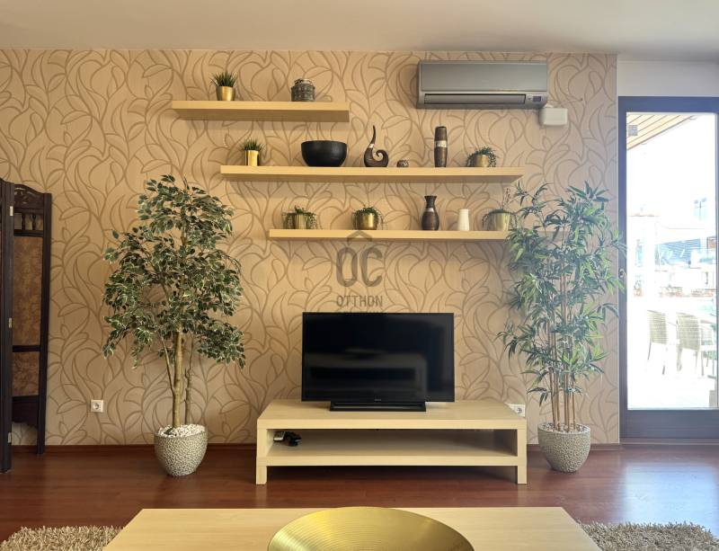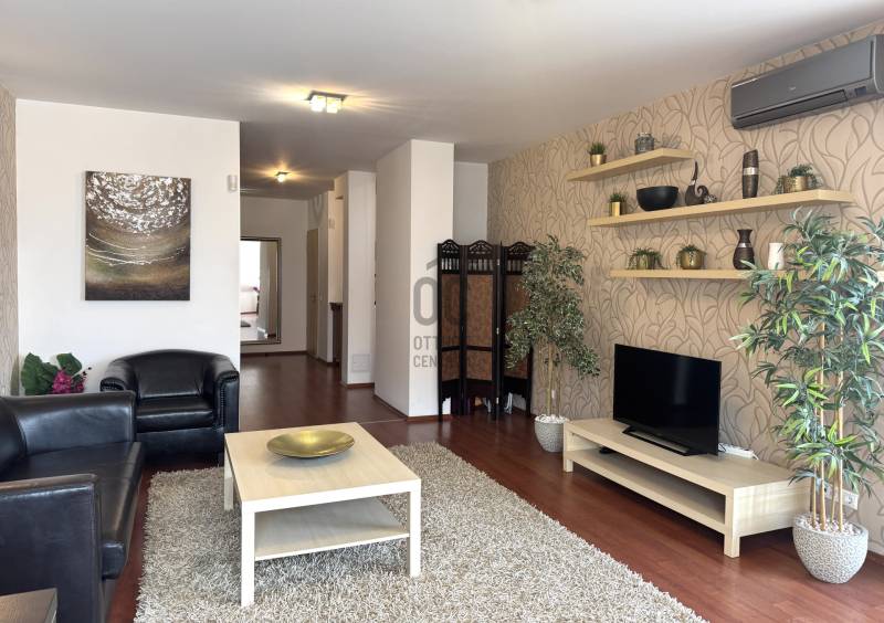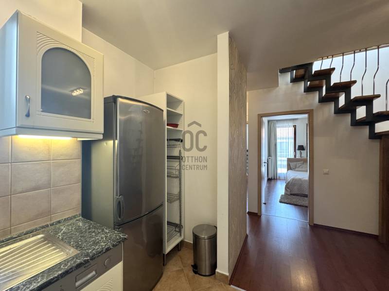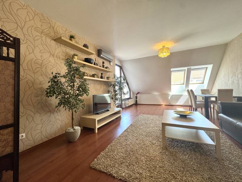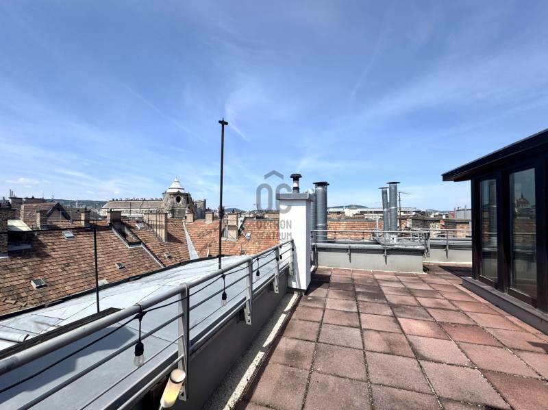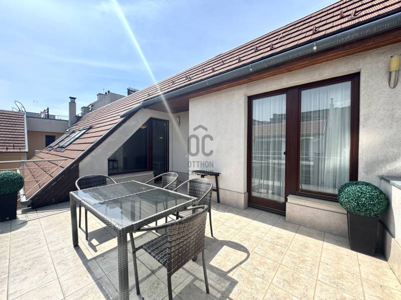 RÖVID ÖSSZEFOGLALÓ:6. kerület OPERA szomszédságában vásárolható egy 2005-ben épült társasházban, nappali + 2 hálószobás + 2 fürdőszobás 97m2-es, erkélyes 22m2 városi körpanorámás penthouse lakás. Tetőterasz 85m2. Gépjárműliftes mélygarázsban vásárolható parkolóhellyel.OTTHON:Fontos a jó lokáció, a város pezsgése és egy menő, de privát rezindenciát keres? Akkor megvan. Az épület újszerű, tiszta és rendezett egy hangulatos kis privát kerttel. Lifttel a 6. emeleten a folyosó végén van a lakás. Szomszédok? Nincsenek! A lakást a meleg színek tónusai határozzák meg, hangulatos és nem a mai fekete-fehér..szürke. Az otthon jól tagolt, kényelmes és praktikus elrendezésű. A bejárat mellet el is lehet tenni a kabátot, cipőt. Jobbra a tágas nappaliban még egy billiárdasztal is könnyen elfér a kanapé és étkezőasztal mellett. Innen is nyílik a 22m2-es terasz, többnyire délelőtt kap fényt tehát a nyári délutánokon is használatba lehet venni. A közlekedőn vagy a teraszon át is megközelíthető a további két hálószoba. Sötétítő függönyök vannak, akár el is lehet aludni reggel. Szobákból gyorsan elérhető a konyha egy korai reggelihez vagy egy hajnali \"bűnözéshez\". A lakásban van még két darab fürdőszoba, egy kádas és egy zuhanyzós szóval lehet válogatni. A lépcső tetején van a privát tetőterasz, bulizni, tűzijátékot nézni, grillezni, napozni, minigolfozni és még tusolni is lehet rajta. Bazilika, Szabadság-szobor, Halászbástya, OPERA és a Parlamentet is lehet látni! Hova tegye az autót? Nem kell parkolót vadászni, mivel az épületben egy gépkocsi liftes mélygarázsban parkolót is kapni. VI. KERÜLET:Az OPERA és Andrássy út szomszédságában vagyunk. Közel a Hajós sétálóutca, igényes és különleges bárok, éttermek vannak a közelben, érdemes mindegyiket kipróbálni. Boltok, patika és minden más is a 5 perc séta távolságra található.Mindenképpen érdemes megnézni!Várom megtisztelő hívását.