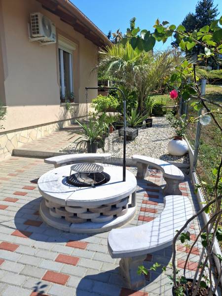 Balatongyörök panorámás, csendes, forgalomtól elzárt, strandhoz közeli részén kínálunk egy 2017-ben épült mediterrán stílusú, nettó 150m2-es lakóházat, gyönyörűen parkosított, 1022nm-es telekkel, alacsony rezsivel.KIEMELT MEGBÍZÁS AZ OTTHON CENTRUM KÍNÁLATÁBAN!Az ingatlan fő jellemzői:- aszfaltos, minimális forgalmú úton megközelíthető- BALATONI részpanorámás telek és ház, kilátással a település felett húzódó csodaszép, ritkás, fenyvessel tarkított Keszthelyi-hegység csúcsára is- az udvar előkertből, oldal és hátsókertből áll, rendezett, parkosított, körbekerített- összközműves ingatlan saját 30m mély FÚRT KÚTTAL- 2.5kW-os NAPELEMRENDSZER segíti csökkenteni a villanyszámlát 13 panellel- 2 féle fűtési rendszer: gázcirkó és vízteres kandalló keringeti a meleg vizet, melynek hője a padlóban, illetve a radiátorokban kerül leadásra- a nappaliban inverteres KLÍMA került beszerelésre- a melegvizet 2 villanybojler adja- a ház födéme SZIGETELT, mediterrán betoncseréppel héjazott- a ház 38-as porotherm TÉGLÁBÓL épült, szigetelt- az első lakószint alatt található az ablakos, gépészetnek is helyt adó pince- a földszinti részen található egy üvegezett terasz, az előtérből nyílik a wc-kézmosó, a hálószoba, a gardrób, a zuhanyzós fürdőszoba, valamint a konyha-étkező-nappali- az emeletre kényelmes lépcsőn jutuk fel, itt található egy panorámás, tágas szoba, teakonyha, zuhanyzós fürdőszoba és egy kisebb szoba, valamint egy nagy, fedett terasz teljes kilátással a Balaton Keszthelyi-öblére- fedett és nyitott autóbeállási lehetőség is adott.- a nyílászárók műanyagok, hőszigeteltek, redőnnyel és szúnyoghálóval ellátottak- minden helyiség ablakos, világos- az étkező-nappalit és az emeleti teraszt a déli nap éri, míg a szobákat és az üvegezett teraszt a délutáni- 2 GENERÁCIÓNAK is kiváló- a kertben 13 féle PÁLMA található, ezek mellett pedig termő gyümölcsfák és bokrok (alma, körte, őszibarack, nektarin, indián banán-pawpaw, szőlő, málna, fekete szeder)- a kert igazi ritkaság, mely az évek során összegyűjtött különleges fajták és szeretettel gondozott munka eredménye- a strand gyalogosan elérhető„Sohasem felejtem azt a pillanatot, amikor én ezt a tündérországot először megláttam.” Szólnak Eötvös Károly – író, a település szülöttének szavai.Balatongyörök egy község Zala vármegyében, a Keszthelyi járásban, a Balaton északi partján, a 71-es főút mellett. A település két vasúti megállóhellyel rendelkezik, valamint sűrű autóbuszjárat köti össze Keszthellyel és Tapolcával. Nyári időszakban rendszeres hajójárat indul Keszthelyre, valamint Balatonmáriafürdő, Szigliget és Badacsony érintésével Fonyódra.Balatongyörök legismertebb pontjai a Szépkilátó és a györöki strand. A balatongyöröki strand vize kiváló minőségű és kristálytiszta, minden évben a legjobbaknak járó kékhullám zászló kitüntetéssel díjazott.Ha felkeltettem érdeklődését ezzel a korszerűen megépített, nyaralónak vagy állandó lakhatásra is ideális ingatlannal, várom megtisztelő hívását.Angol leírásFamily house with a panoramic view of the Balaton and low utilitiesIn the panoramic, quiet part of Balatongyörök, with no traffic, close to the beach, we offer a Mediterranean-style, net 150 sqm residential house built in 2017, with a beautifully landscaped, 1022 sqm yard, with low utility costs.The main features of the property:- Accessible by an asphalt road with minimal traffic- Land and house with a panoramic view of Balaton, with a view to the peak of the beautiful, rare, pine-covered Keszthelyi Mountains stretching above the settlement- The yard consists of a front garden, a side garden and a back garden, arranged, landscaped and fenced- Full public utility supplied property with its own 30m deep drilled well- A 2.5kW solar panel system helps reduce the electricity bill with 13 panels- 2 types of heating systems: a gas based and a wooden burning stove circulate the hot water, the heat of which is released in the floor and in the radiators- The living room is equipped with inverter air conditioning- Hot water is provided by 2 electric boilers- The roof of the house is insulated and covered with Mediterranean concrete tiles- The house is built of 38 porotherm tiles, insulated- Below the first living floor is the basement with windows, hosting the machines of the heating system and the well.- On the ground floor there is a glazed terrace, from the hall we can enter to the guest toilet with sink, to the bedroom, a wardrobe, a bathroom with a shower, and to the kitchen-dining-living room- We reach the first floor by a comfortable staircase, there is a panoramic, spacious room, kitchenette, bathroom with shower and a smaller room, as well as a large, covered terrace with a full view of the Keszthely bay of Balaton- Covered and open parking is also available.- The doors and windows are plastic, thermally insulated, equipped with shutters and mosquito nets- All rooms have windows and are bright.- The dining-living room and the upstairs terrace are exposed to the midday sun, while the rooms and the glazed terrace are exposed to the afternoon sun.- Excellent for 2 generations- There are 13 types of palm trees in the garden, as well as fruit trees and bushes (apples, pears, peaches, nectarines, Indian banana-pawpaws, grapes, raspberries, blackberries)- The beach is within walking distance\"I will never forget the moment I saw this fairyland for the first time.\" The words of Károly Eötvös - writer, native of the settlement.Balatongyörök is a village in the county of Zala, in the district of Keszthely, on the northern shore of Lake Balaton, next to highway 71. The settlement has two railway stops and a frequent bus route connects it with Keszthely and T