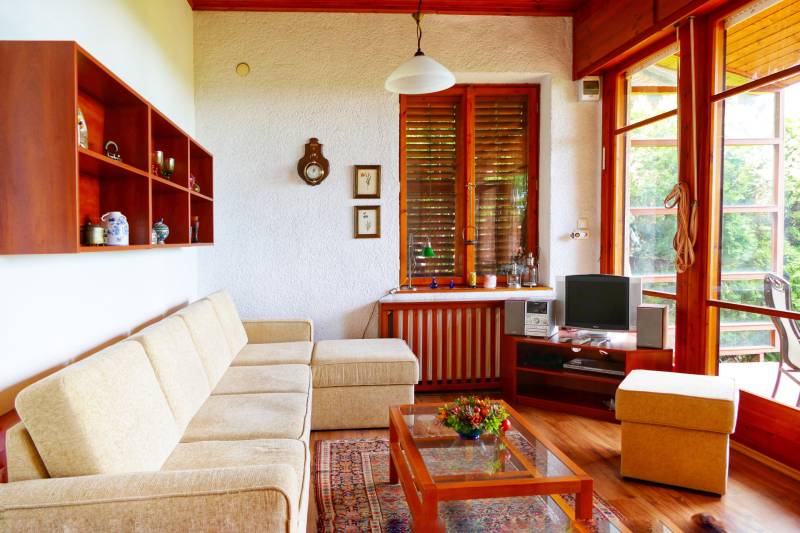 Szentendre, Boldogtanya belterületén, téliesített hétvégi ház eladó!TELEK:- 959 nm- panorámás- csendes környék- aszfalt úton megközelíthető- bekerített minden oldalról- autóbeálló , díszkő burkolatú- rendezett, ápolt kert- előkertben fenyőfák adják az árnyékot a kövezett terasz részre- a telek hátsó oldala enyhén lejtős,- oldalkert részben örökzöldek, gyümölcsfák ( cseresznye, mogyoró és szilva) , cserjék, évelő virágok- kert jelentős része füvesítettHÉTVÉGI HÁZ : - 1970-es években épült- tégla építésű- 2006-ban teljes körű felújítást végeztek a tulajdonosok.- a ház megkímélt, újszerű állapotban van- két különálló részből áll- a lakótér két szoba, nappali, konyha, fürdőszobából áll- 55 nm- belmagassága 280 cm-beépített bútor az előszobában- a nappaliból és az egyik hálószobából csodálatos panorámában lehet részünk.- Nappaliból egy 11,5 nm fedett erkélyre juthatunk ki.-parketta burkolat , fürdőszobában , konyhában, előszobában járólap- gáz cirkó fűtés, radiátorral- télen temperálva van a hőmérséklet- nyílászárók fából- nagy ablakokon a nappaliban redőny, a kisebb ablakokon zsalugáter- kert kapcsolatos szint 35 nm két részből áll, az egyik rész 16 nm, ebből kb 5 nm zuhany kabinos fürdőszoba, valamint egy sport szoba ( 11 nm) oldalfal hosszúságban beépített szekrényekkel a másik rész ( 20nm) is két helyiségből áll, egy konyha- étkezővel, és egy nagy tároló, beépített bútorokkal, szekrényekkel- terasz és kert kapcsolat - a ház teljes bútorzattal eladó ( néhány személyes tárgy kivételével) - Keleti fekvésű