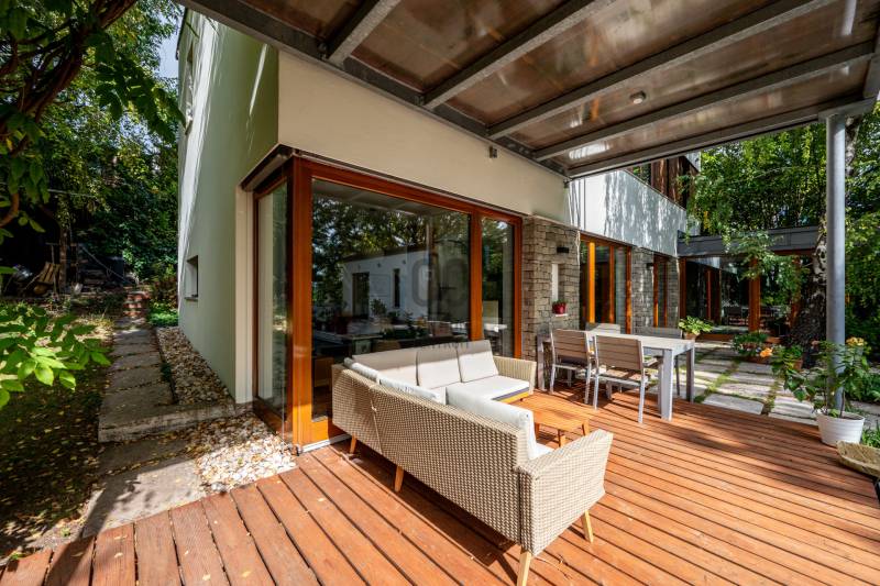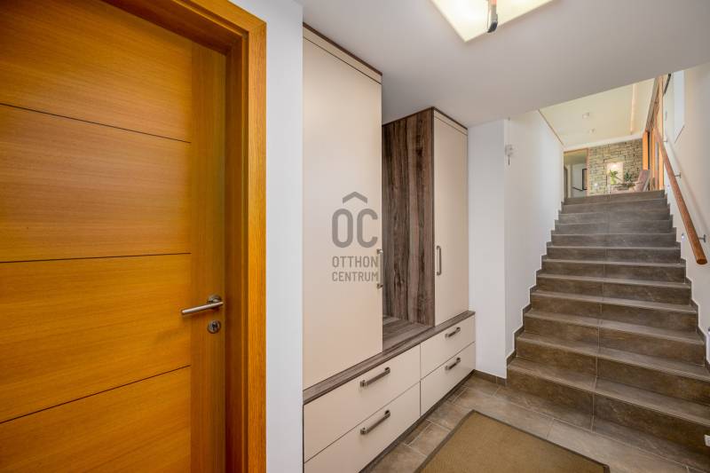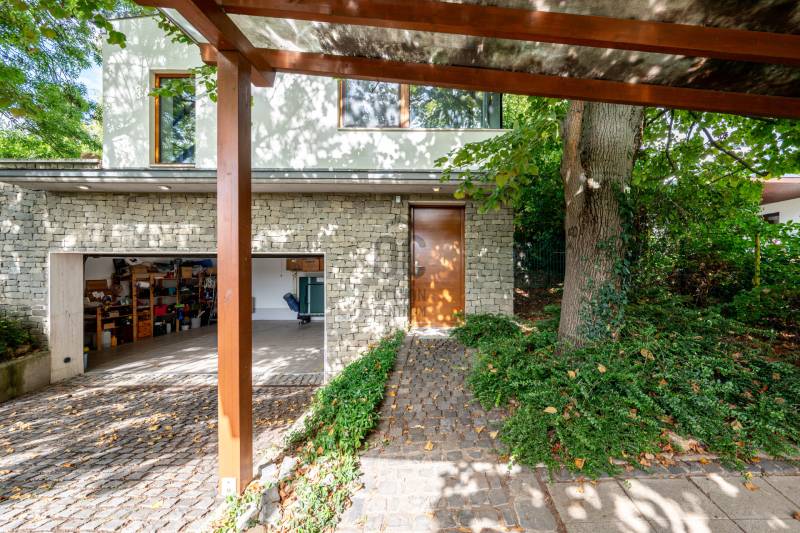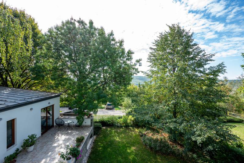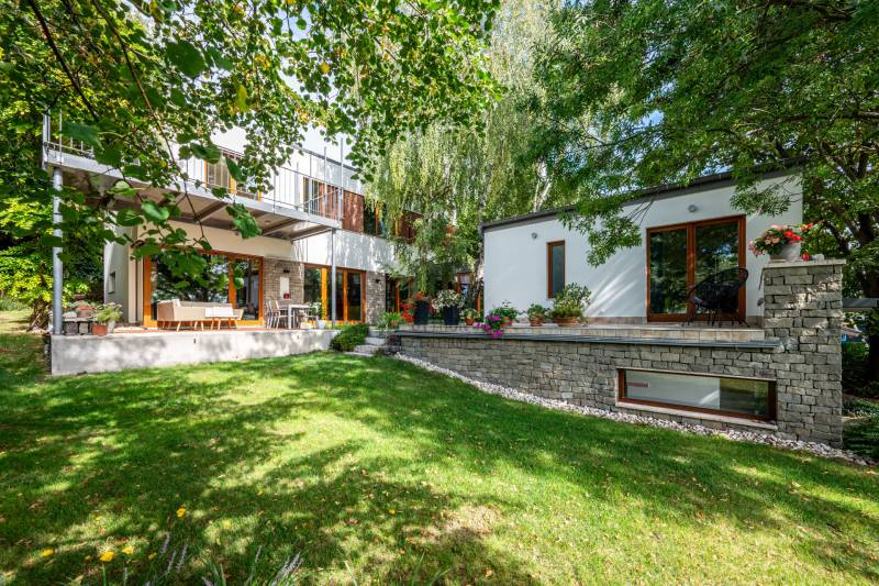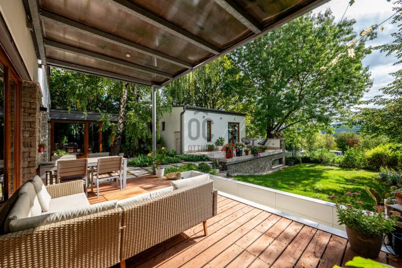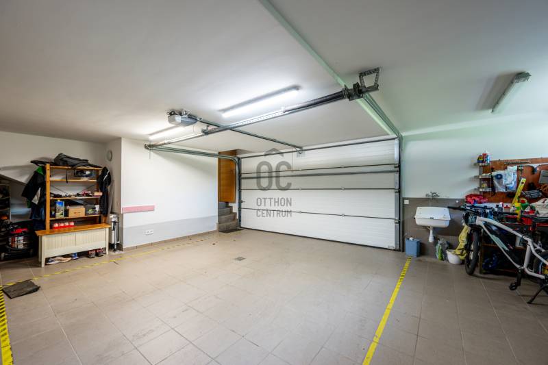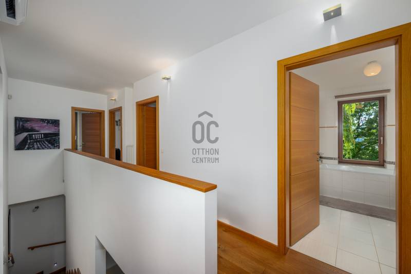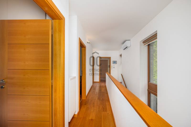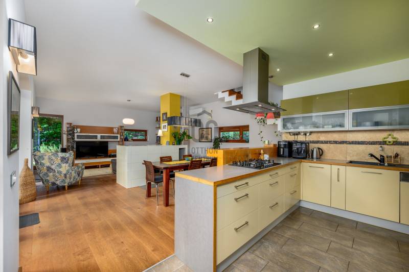 Lenyűgöző természetközeli luxus, ahol a design és a környezet tökéletes összhangot alkot!Nagykovácsi Cseresznyés részén áll ez a ház, melynek tervezésekor az volt a fő szempont, hogy a meglévő fák megmaradjanak – a végeredmény egy építészeti remekmű, ami körbeöleli az élő természetet. A fák árnyéka természetes hűtést és páratlan atmoszférát biztosít. A lehető legtöbb helyen hatalmas üvegfelületek engedik be a fényt és szinte elmossák a bel- és kültér közötti határokat. A ház egyik különleges építészeti megoldása a télikert, amely olyan érzetet nyújt, mintha közvetlenül a kertben sétálnánk.Mindezt a hatást fokozza a ház teraszairól elénk táruló csodás panoráma.Főbb paraméterek:- 237 m2 nettó alapterület- 2 lakószint + szuterénszinten a garázs- nappali + 4 szobaA szobák elosztása lehetővé teszi különböző generációk elkülönülését- 3 fürdőszoba + 2 kézmosós wc- fűtés: kondenzációs kazán, (szobákban radiátor, nappali-étkezőben padlófűtés), 3 db hűtő-fűtő split klíma, nappaliban cserépkályha- parkolás: 2 állásos garázs + nyitott beálló- 24 m2 fedett terasz- 11 m2 nyitott terasz- 17,8 m2 erkélyMűszaki paraméterek:- Porotherm 30 külső falazat+ 15 cm hőszigetelés- tető: VM-Zinc horganylemez- 3 rétegű fa nyílászárók - tölgy svédpadló padló- és lépcsőburkolatok- furnérozott tölgy belső ajtók- teraszok burkolata: kerámia, vörösfenyő, travertin mészkő- tetőn 5,3 kW-os napelemrendszer- automata öntözőrendszer- kerti csobogó- kerti tárolóAjánljuk 4-5 fős családoknak vagy nagyszülőkkel összeköltözőknek.Ha szeretné megtekinteni, várom hívását!