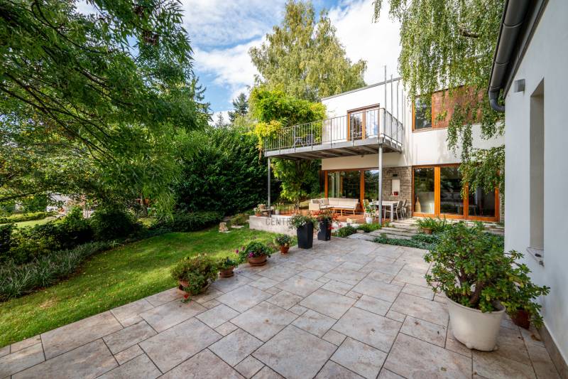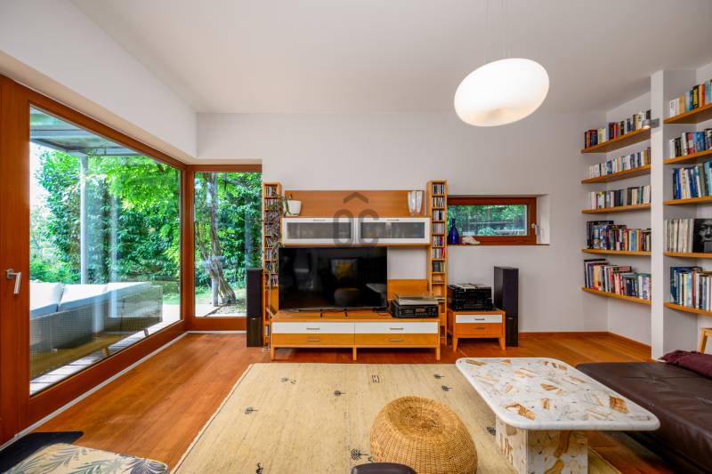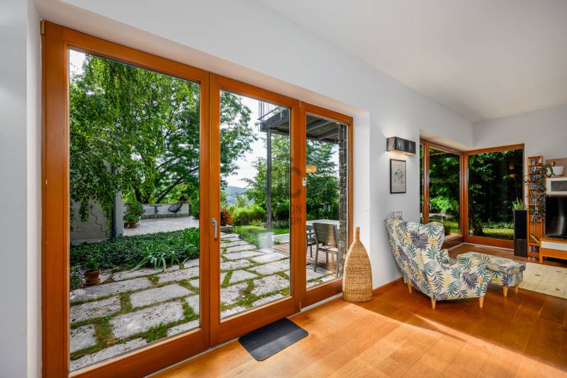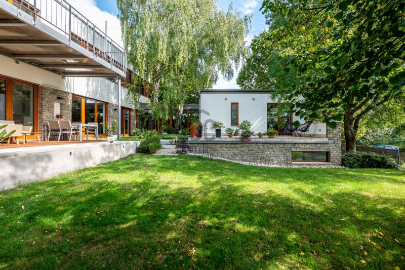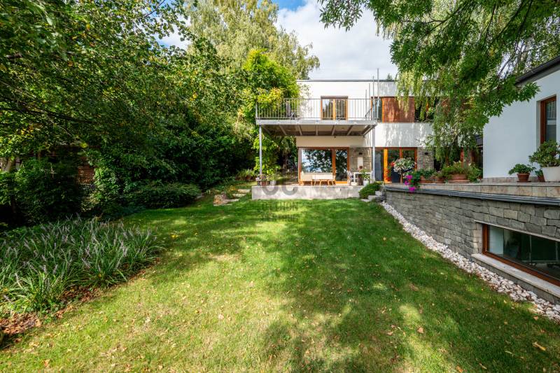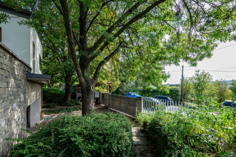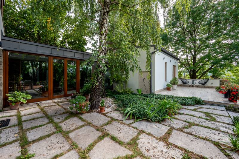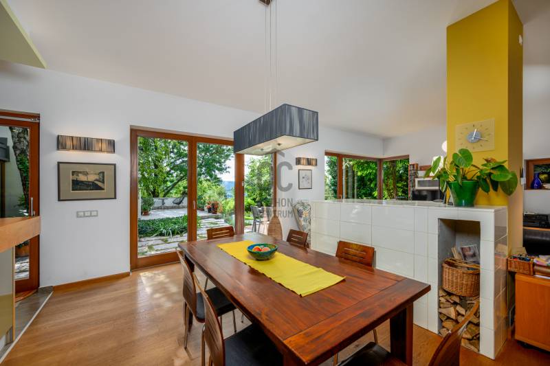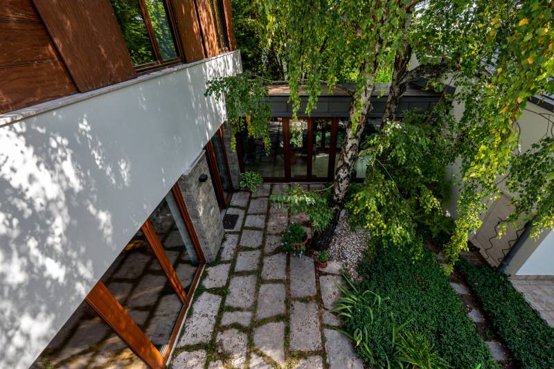 Lenyűgöző természetközeli luxus, ahol a design és a környezet tökéletes összhangot alkot!Nagykovácsi Cseresznyés részén áll ez a ház, melynek tervezésekor az volt a fő szempont, hogy a meglévő fák megmaradjanak – a végeredmény egy építészeti remekmű, ami körbeöleli az élő természetet. A fák árnyéka természetes hűtést és páratlan atmoszférát biztosít. A lehető legtöbb helyen hatalmas üvegfelületek engedik be a fényt és szinte elmossák a bel- és kültér közötti határokat. A ház egyik különleges építészeti megoldása a télikert, amely olyan érzetet nyújt, mintha közvetlenül a kertben sétálnánk.Mindezt a hatást fokozza a ház teraszairól elénk táruló csodás panoráma.Főbb paraméterek:- 237 m2 nettó alapterület- 2 lakószint + szuterénszinten a garázs- nappali + 4 szobaA szobák elosztása lehetővé teszi különböző generációk elkülönülését- 3 fürdőszoba + 2 kézmosós wc- fűtés: kondenzációs kazán, (szobákban radiátor, nappali-étkezőben padlófűtés), 3 db hűtő-fűtő split klíma, nappaliban cserépkályha- parkolás: 2 állásos garázs + nyitott beálló- 24 m2 fedett terasz- 11 m2 nyitott terasz- 17,8 m2 erkélyMűszaki paraméterek:- Porotherm 30 külső falazat+ 15 cm hőszigetelés- tető: VM-Zinc horganylemez- 3 rétegű fa nyílászárók - tölgy svédpadló padló- és lépcsőburkolatok- furnérozott tölgy belső ajtók- teraszok burkolata: kerámia, vörösfenyő, travertin mészkő- tetőn 5,3 kW-os napelemrendszer- automata öntözőrendszer- kerti csobogó- kerti tárolóAjánljuk 4-5 fős családoknak vagy nagyszülőkkel összeköltözőknek.Ha szeretné megtekinteni, várom hívását!