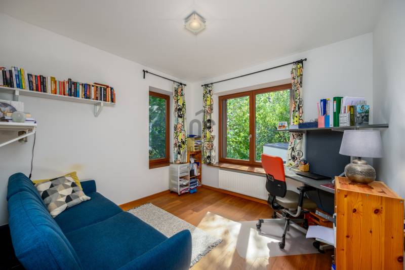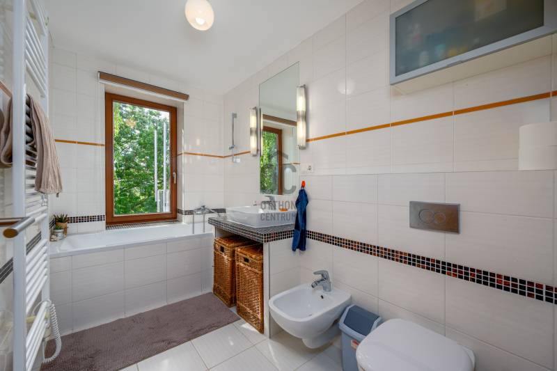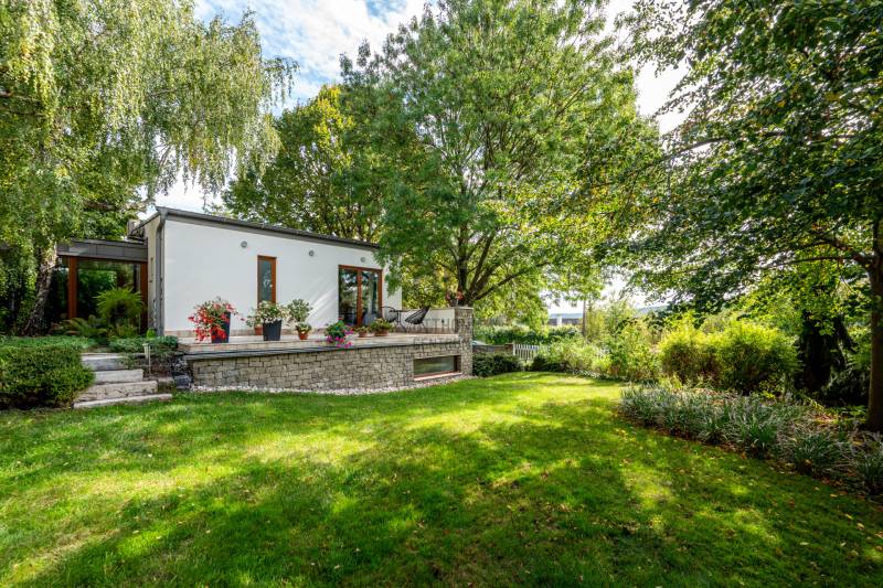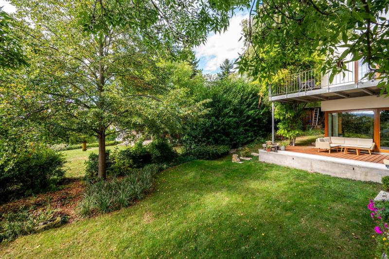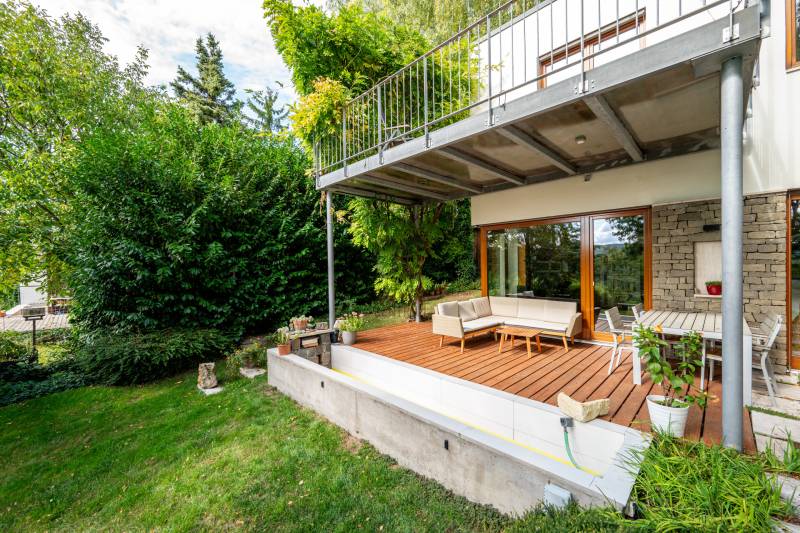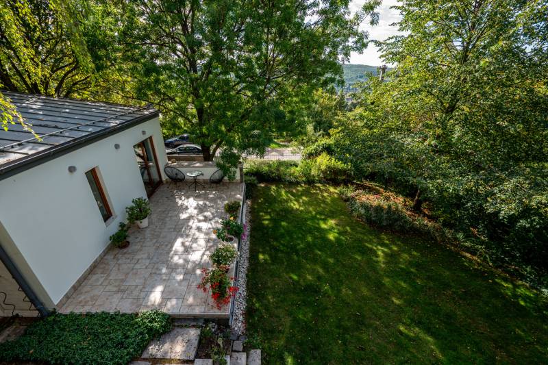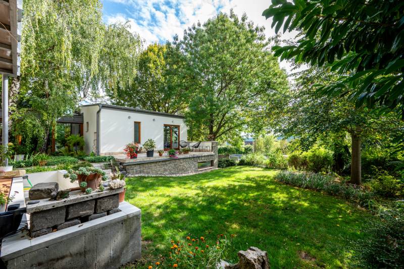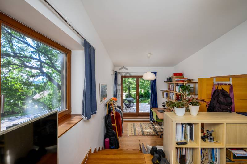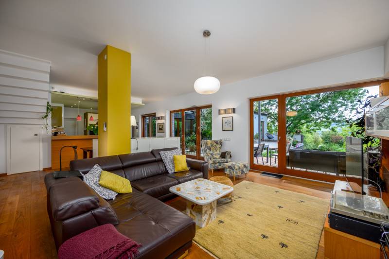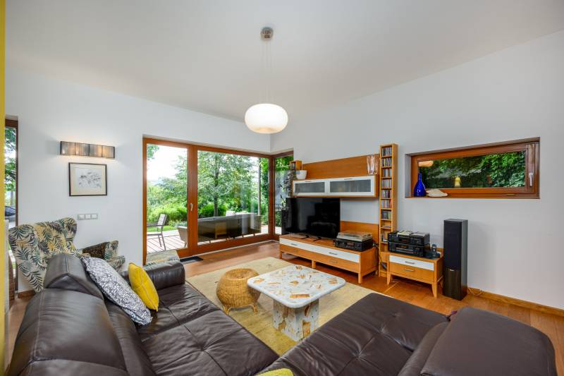 Lenyűgöző természetközeli luxus, ahol a design és a környezet tökéletes összhangot alkot!Nagykovácsi Cseresznyés részén áll ez a ház, melynek tervezésekor az volt a fő szempont, hogy a meglévő fák megmaradjanak – a végeredmény egy építészeti remekmű, ami körbeöleli az élő természetet. A fák árnyéka természetes hűtést és páratlan atmoszférát biztosít. A lehető legtöbb helyen hatalmas üvegfelületek engedik be a fényt és szinte elmossák a bel- és kültér közötti határokat. A ház egyik különleges építészeti megoldása a télikert, amely olyan érzetet nyújt, mintha közvetlenül a kertben sétálnánk.Mindezt a hatást fokozza a ház teraszairól elénk táruló csodás panoráma.Főbb paraméterek:- 237 m2 nettó alapterület- 2 lakószint + szuterénszinten a garázs- nappali + 4 szobaA szobák elosztása lehetővé teszi különböző generációk elkülönülését- 3 fürdőszoba + 2 kézmosós wc- fűtés: kondenzációs kazán, (szobákban radiátor, nappali-étkezőben padlófűtés), 3 db hűtő-fűtő split klíma, nappaliban cserépkályha- parkolás: 2 állásos garázs + nyitott beálló- 24 m2 fedett terasz- 11 m2 nyitott terasz- 17,8 m2 erkélyMűszaki paraméterek:- Porotherm 30 külső falazat+ 15 cm hőszigetelés- tető: VM-Zinc horganylemez- 3 rétegű fa nyílászárók - tölgy svédpadló padló- és lépcsőburkolatok- furnérozott tölgy belső ajtók- teraszok burkolata: kerámia, vörösfenyő, travertin mészkő- tetőn 5,3 kW-os napelemrendszer- automata öntözőrendszer- kerti csobogó- kerti tárolóAjánljuk 4-5 fős családoknak vagy nagyszülőkkel összeköltözőknek.Ha szeretné megtekinteni, várom hívását!