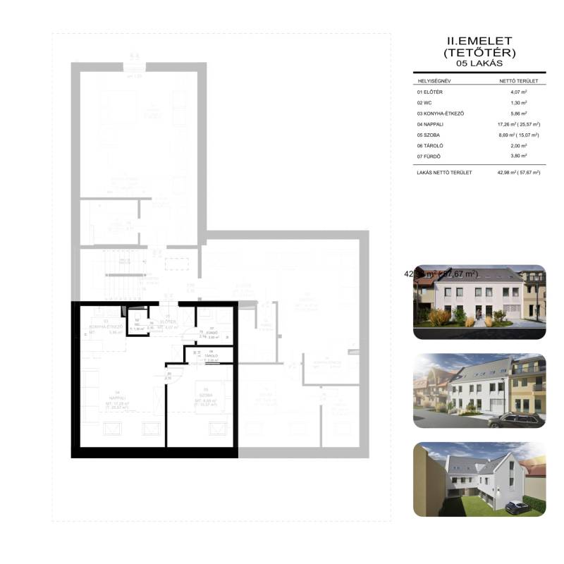 2 szobás 2 emeleti új építésű társasházban - lakás foglalható!Válogasson kedvére a különböző méretű és elrendezésű lakások között.Legyen Ön a tulajdonosa egy új építésű, szép lakásnak!7 lakásos társasház egy 417 m2-es telekre épül Balmazújváros Belvárosában.34 m2 - 57 m2-es lakások leköthetőek 20%-os önerővel, november 30-ig még ezen az áron.A társasház főfalai 30 N+F falazó blokkal készülnek, külső felületen 15 cm vastagságú AUSTROTHERM AT-N100 hőszigeteléssel, vakolt felülettel.A külső nyílászárók műanyagok 3 rétegű üvegezésű ablakokkal, redőnyökkel.Az épület fűtése gázkazánnal történik, a melegvíz ellátása gázüzemű kazánnal történik.A lakásokban padlófűtéses hőleadás lesz, mért hőmennyiség mérővel történik az egyéni elszámolás.A vételár tartalmazza az 5%-os ÁFÁ-t!A lakásokhoz beállók kötelezően vásárolhatók, melyek vételára 4 millió Ft, vagy garázs mely 7 milliós árat képvisel.A hirdetésben szereplő 2. emeleti, lakás 58 m2-es, melynek nettó alapterülete: 43 m2Belső elosztása: előtér, külön wc, konyha, nappali, 1 hálószoba, fürdőszoba, kamraKulcsrakész ára : 45.300.000 FtA megbízható kivitelező, számos referenciával.Minden korosztály számára ideális választás!Tervezett műszaki átadás: 2026 év vége (hatósági átadás 2027. március)Az ingatlanra CSOK+ 2 gyermekre és babaváró igénybevehető!A lakás az Otthon Start hitel által is finanszírozható min: 20%-os önerővel!További részletekért keressen bizalommal! Amennyiben a vásárláshoz hitelre van szüksége irodánkban teljes körű szolgáltatással várjuk!