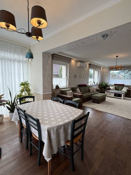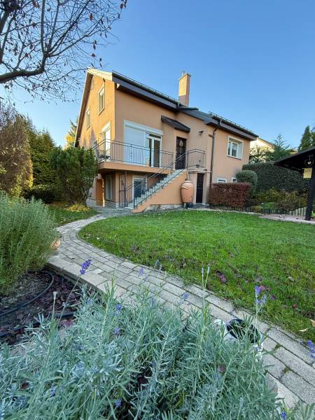 Különleges lehetőség, egy igazán otthonos ház várja Önt Budaörs csendes, kertvárosi részén.Az utcán sétálva nem is gondolná a kedves érdeklődő micsoda kincset rejt a kerítés. Az alsó szintjén található egy közvetlen kertkapcsolatos, nappali és egy hálószobás kialakítású lakás tágas étkezővel, konyhával, fürdőszobával és egy tároló helyiséggel. Külső lépcsőn jutunk fel a felső, belső kétszintes, átgondolt kialakítású, teraszos lakrészbe. Itt egy nagy ablakos étkezőbe érkezünk, a hatalmas nappali mindig fényárban úszik. A konyha a lakás sarkában található, kamrával, kicsit szeparáltan a többi helyiségtől, így mind az amerikai konyha, mind a zárt konyha előnyét élvezheti a tulajdonosa. Ezen a szinten még egy fürdőszoba és egy dolgozószoba található. Belső lépcsőn jutunk fel a felső szintre, ahol 3 hálószoba, egy fürdőszoba lett kialakítva. Erkélyek, teraszok minden szinten kapcsolódnak szobákhoz.Ez a kitűnő állapotú, szuper beosztású, hangulatos, kétgenerációs családiház sok lehetőséget rejt. A házban összesen hét szoba található, így bőséges hely áll rendelkezésre a család minden tagja számára, legyen szó akár gyerekszobákról, dolgozószobáról vagy vendégszobáról. A három fürdőszoba pedig garantálja, hogy a reggeli rohanás során senkinek ne kelljen várakoznia. A gázfűtés és a klímaberendezés biztosítja a megfelelő hőmérsékletet egész évben. A ház kertje varázslatos, intim, praktikus terekkel, szaletlivel, tárolóval, mely tökéletes helyszínt nyújt a szabadidős tevékenységekhez, családi összejövetelekhez. A házhoz elektromos autó töltési lehetőség is tartozik, amely a modern kor igényeit szolgálja ki. Ez a kétgenerációs ház tökéletes választás összeköltözőknek, önállósodóknak, otthon dolgozóknak, vállalkozóknak egyaránt.Méretét tekintve pont jó azt gondolom mindenkinek, nem hatalmas, mégis tágas, a kertje sem óriás, de remekül elfér benne minden (akár egy medence is ), ideális annak, aki Budapesthez közel, zöld övezetben, csendes környezetben képzeli el új otthonát! Budaörs nemcsak a zöld környezetéről, hanem kitűnő közlekedési lehetőségeiről is híres. Az ingatlan könnyen megközelíthető autóval, a közeli főutaknak köszönhetően, de a tömegközlekedés is jól kiépített, így a főváros gyorsan elérhető. A csendes környék biztonságos, ideális helyszín a gyerekek számára, ahol szabadon játszhatnak, felfedezhetik a természetet. A környék számos előnnyel rendelkezik, hiszen a közelben található iskolák, óvodák és bevásárlási lehetőségek is, így mindennapi szükségletei könnyen kielégíthetők. A zöld területek, parkok és játszóterek pedig remek lehetőséget biztosítanak a szabadidő eltöltésére, legyen szó akár sétáról, kerékpározásról vagy piknikezésről.