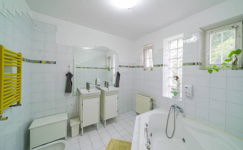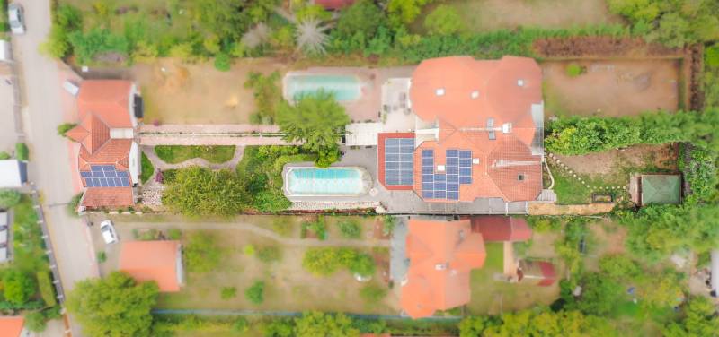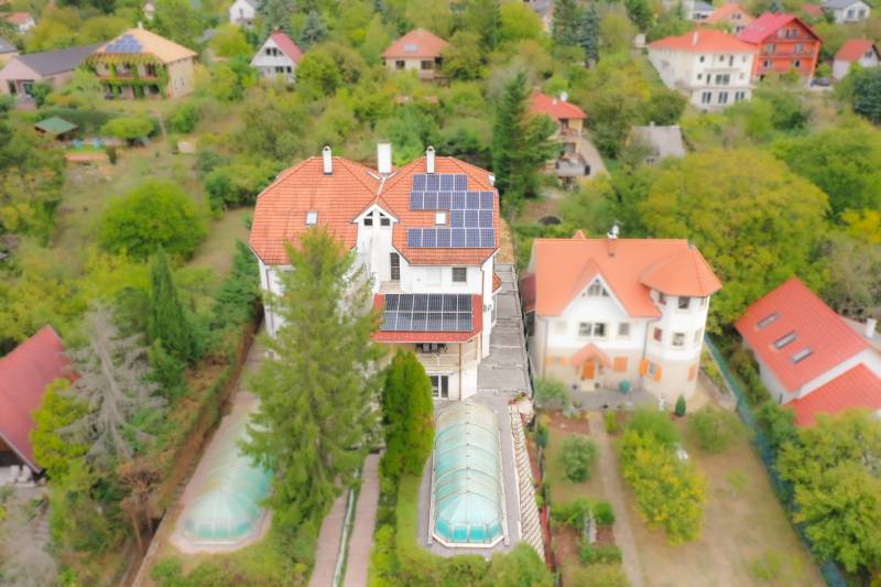 Eladó egy különleges, négy szintes családi ház páratlan környezetben, természetvédelmi terület szomszédságában, 1000 m²-es telken!Ha tágas, kényelmes és fenntartható otthont keresel, ahol a nyugalom, a friss levegő és a panoráma egyszerre adott, akkor ez a ház neked való!Főbb jellemzők:375 m² főépület + 35 m² garázsFedett medence hőszivattyús fűtésselZárt garázs két autóra (EV-töltővel) + fedett kocsibeálló6 nagyobb és 2 kisebb hálószobaTágas amerikai konyhás nappali étkezővelMinden szinten wc/mosdóKlíma minden helyiségbenÓriási fedett terasz lenyűgöző panorámávalTeljes UTP-hálózat szobánként, központi szerverhez bekötveNapelem rendszer (12,8 kWh) + hőszivattyús fűtés → rezsimentes működés (EV-töltés is beleértve)Háromfázisú elektromos hálózat (3×32A)Gáz bekötve, használaton kívül.Környezet és elhelyezkedés:A ház nyugodt, zöldövezeti faluban található, ahol minden fontos intézmény helyben elérhető: bolt, gyógyszertár, orvosi rendelő, iskola, óvoda, buszmegálló és még kávézó is.