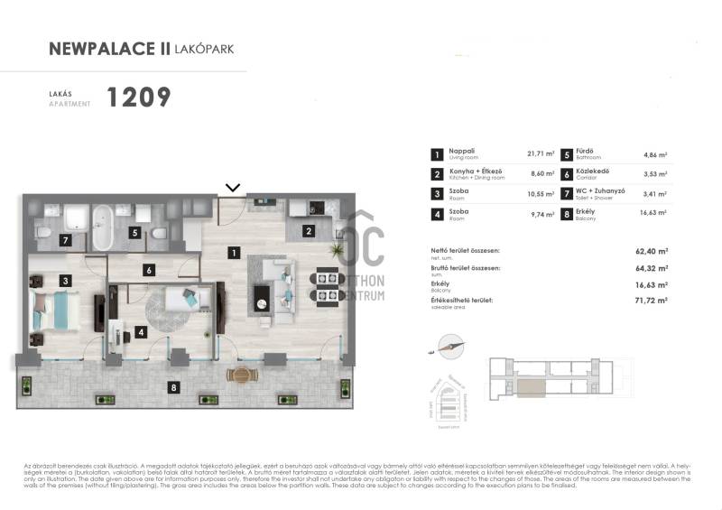 Projekt bemutatásaNew Palace II. ütemA New Palace a XIII. kerület csendes részén épül. A megújult kertvárosias környezet a pesti oldal egyik legkedveltebb részei közé tartozik, az itt élők egyszerre élvezhetik a csöndes kis utcák nyugalmát és a belváros közelségét.A társasház különleges, extravagáns homlokzatával egyedi fiatalos dizájnjával, kiemelkedik a környező épületek közül és ezáltal lesz majd sokáig a környék ismert és meghatározó tájékozódási pontja. A már eddig is komoly fejlődésen és megújuláson átesett városrész a projekt megvalósulásával beírja magát a kerület új városrészei közé.A földszint + 12 emelet magas épületet elegáns, kertépítők által tervezet parkok veszik körül, megreformálva a társasház környezetét is. A zárt, csak a társasház lakói által megközelíthető udvaron fákkal, cserjékkel tarkított, füvesített zöldkert kerül kialakításra.A lakások két elegáns, egymástól elkülönülő lobbyn keresztül közelíthetőek meg, lépcsőházanként két-két lifttel. A lakáskínálatban az egyszobás lakástól egészen a négyszobásig mindenféle elosztású megoldás megtalálható, a kínálatban alig van két egyforma lakás. Minden lakás rendelkezik erkéllyel vagy terasszal, a földszinti és néhány exkluzív emeleti lakás pedig, intenzív zöldtetővel, saját kertrésszel.Figyelembe véve a jövő elvárásait, a társasház modern, környezetbarát, mennyezeti hűtő, -fűtő rendszerrel ellátott.Vevőinknek lehetőségük nyílik arra is, hogy megvásárolt otthonukat az utolsó részletig személyre szabhassák: módosítással élhetnek otthonuk elosztása tekintetében is, továbbá széles kollekcióból választhatnak meleg- és hideg burkolatokat. Az alapáras burkolatokon felül, elérhetőek feláras termékek is, mely biztosítja, hogy személyiségük otthonukban is vissza tükröződhessen.Az infrastruktúra is magáért beszél: a közeli Váci út kiváló közlekedése és bevásárlási lehetőségei, a megújult 3-as metró Gyöngyösi utcai megállója rövid sétával elérhető, hasonlóan az idilli hangulatú Gyöngyösi sétányhoz, mely a kerület egyik legkedveltebb részei közé tartozik. Szintén pár perc sétatávolságra a folyamatosan megújuló és minden igényt kielégítő Duna Pláza bevásárlóközpont (benne: SPAR, gyógyszertár, Rossmann, DM, Médiamarkt, tisztító, fodrászatok, virágbolt, Libri könyvesbolt, papír-írószerbolt és számos ruházati bolt. Kényelmesen megoldható a napi fogyasztási cikkek beszerzése is a nap bármely órájában a közvetlen közelben lévő Tesco áruházban és az üzletsoron lévő boltokban. A lakópark tágabb vonzáskörzetében de még mindig elérhető távolságban találjuk Újpest-központot, a Népszigetet és az Újpest vasútállomást.Irodánkban a legtöbb XIII. kerületi beruházás lakásai elérhetőek ügyfeleink számára.A jelen adatok tájékoztató jellegűek, ezért a Beruházó (sem a hirdető) azok változásával, vagy bármely attól való eltéréssel kapcsolatban semmilyen kötelezettséget, vagy felelősséget nem vállal.Az alaprajzokon ábrázolt berendezési tárgyak és bútorok, a burkolatok megjelenése nem képezi a szerződés tárgyát. A pontos felszereltségről a műszaki leírásban olvashat bővebben.Az aktuális lakáskínálatról és árakról érdeklődjön telefonon!