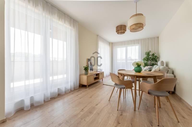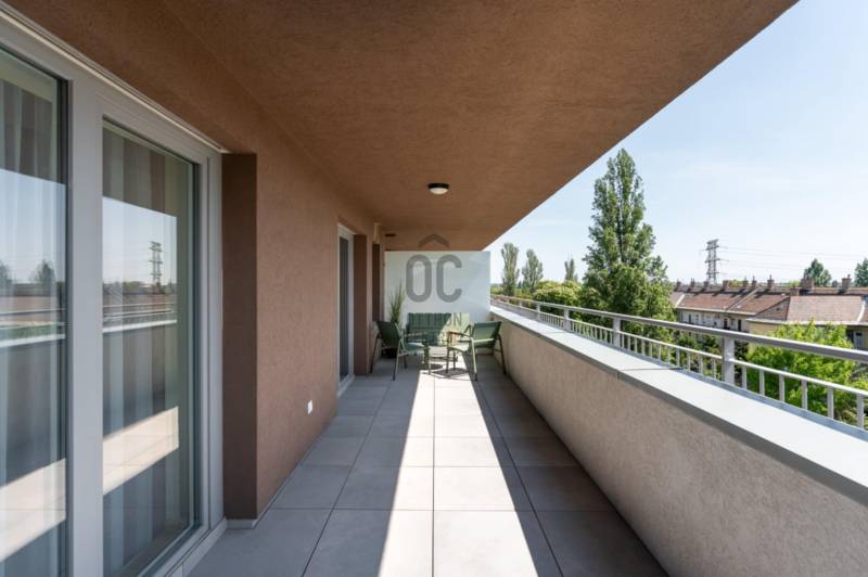 !! IGAZI RITKASÁG, KIVÉTELES LEHETŐSÉG !!!A XIII. kerület családias részén, a New Palace lakóparkban várja első lakóját ez a nagy teraszos, TELJESEN BERENDEZETT otthon.Az épület nemrég került átadásra, ennek megfelelően a mai igényeknek, elvárásoknak eleget tesz: többek között a mennyezeti hűtés-fűtés, gyönyörű füvezett közös kert, praktikus alaprajz teszik szerethetővé és igazán élhetővé.A lakás 4. emeleti saroklakás, 65 nm, 27 nm-es L alakú terasszal, nappalival, 2 hálóval, gardróbbal.Tájolásának köszönhetően valahol mindig élvezhetjük a Nap sugaraitA lakáshoz tartozik egy nagy méretű parkoló és tároló, melyek megvásárlása kötelező.