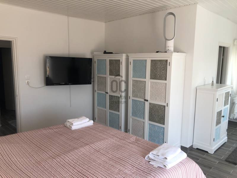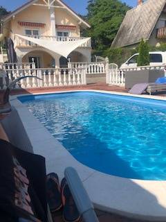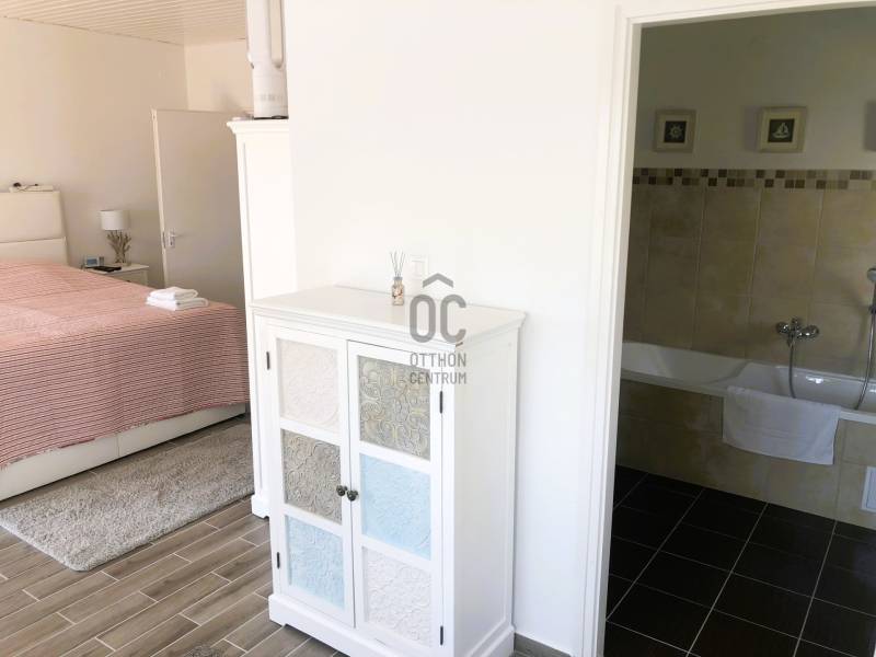 A BALATON ÉSZAKI PARTJÁN, VONYARCVASHEGYEN CSENDES KÖRNYÉKEN, NYUGODT KÖRNYEZETBEN ELADÓ PANORÁMÁS, TÖBB FUNKCIÓS CSALÁDI HÁZ ÚSZÓMEDENCÉVEL. AZ OTTHON CENTRUM KIEMELT AJÁNLATA.Az ingatlant biztonságos, kedvelt kicsi zsákutcában találjuk. Pontosan illik rá a település szlogenje: \" Mögöttünk az erdő, előttünk a víz.\" A telek 714 m2, nagyrész térkövezett, könnyen karbantartható. A ház két szintes, hatalmas terasszal, erkéllyel, ahonnan a Balaton tükrében is gyönyörködhetünk. Megbízható minőségben épült 2003-ban, néhány éve modernizálták, alakítottak a használati beosztáson.További jellemzői: - Összközműves tégla épület, cserép fedéssel. Műanyag nyílászárók. - Gáz cirkó fűtés, + két hangulatos kandalló -4 hálószoba, 3 fürdőszoba nagyobb családnak is kényelmes elhelyezést biztosít. - A nettó lakótér 120 m2, ami nem foglalja magában a teraszokat, erkélyt, tárolókat. - Helyiségek: A földszinten teraszkapcsolatos nappali, egy légterű, de szaperált modern konyhával, étkezővel. Kis közlekedőből nyílik egy fürdő, tágas hálószoba és a lépcsőfeljáró. A felső szintre belül, és külső lépcsön is fel lehet jutni. Itt három hálószobát, zuhanyzós és kádas fürdőszobaát alakítottak ki. A déli tájolású legnagyobb hálóból panoráma erkély nyílik. ( Az alaprajzon a mgnevezésekben látozás történt)A ház mögött két méretes tároló, elektromos távirányítós záróredőnyokkel. Elektromosan vezérelt kapu. Mivel a két szint külön bejárattal is rendelkezik, két generáció lakhatására, nyaralására, kiadásra is alkalmassá tehetó. Befektetésnek szintén kiváló ajánlat.A ház teljes berendezéssel. felszereléssel kerül értékesítésre, amit a vételár tartalmaz. Vonyarcvashegyet a Keszthelyi-hegység öleli körül, erdőivel, szőlőültetvényeivel, árnyas pincéivel, benne sajátos ízvilágú boraival. Ötcsillagos Lido strandja számos alkalommal érte el a Balaton legszebb, legsportosabb strandja kitüntető elismerést. A környék jellegzetessége a Csándor-hegy tetején álló Kálvária út és a végén a 2010-ben felszentelt 7,38 méter magas Fénykereszt. A Balatonból kiemelkedő egykori dombsziget, a 136 méter magas Szent Mihály domb. Tetején áll a 40 jéghalász megmenekülése emlékét őrző Szent Mihály Fogadalmi Halászkápolna, mely Magyarország, sőt a tengerparttal nem rendelkező országok egyetlen Halászkápolnája. Ez a csodás fekvésű, romantikus hangulatú szakrális hely megigézi az idelátogatókat. A hosszú évszázadok múltját őrző kápolna Vonyarcvashegy jelképévé vált.Ha felkeltette érdeklődését a fenti ingatlan, további kérdései vannak, megtekintéshez időpontot egyeztetne, kérem, hívjon, írjon a megadott elérhetőségeken.