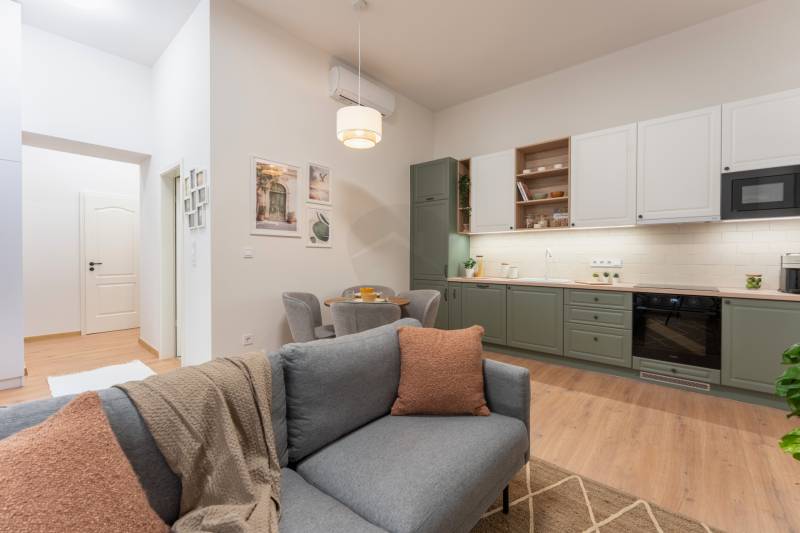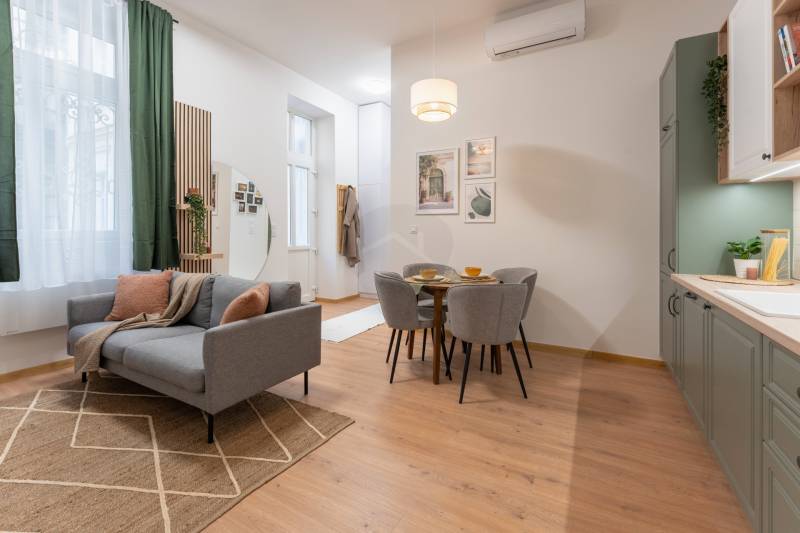 V. kerület közkedvelt részén, Vígszínháztól és a Jászai Mari tértől pár lépésnyire eladó egy teljes körűen felújított, 51 m²-es, nappali + 2 hálós lakás.A lakás egy gyönyörű, liftes ház 1. emeletén található. Az épület történelmi hangulatot áraszt.Főbb jellemzők:• kiemelt lokáció, mégis csendes lakás• a kisebbik hálóhoz saját gardróbhelyiség tartozik• tágas, világos amerikai konyhás nappali és gépesített konyha• külön fürdő, külön mellékhelyiség• teljes berendezés az árban – a bútorzat igény szerint cserélhető• beépített gardróbszekrények igény szerinti elkészítése benne van az árbanA környék kiemelkedően jó infrastruktúrával rendelkezik: éttermek, kávézók, mozi, fitneszterem, bevásárlási lehetőségek mind pár perc sétára elérhetők, a közlekedés pedig kiváló (M3-as metró, 4-6 villamos, számos troli és buszjárat).
