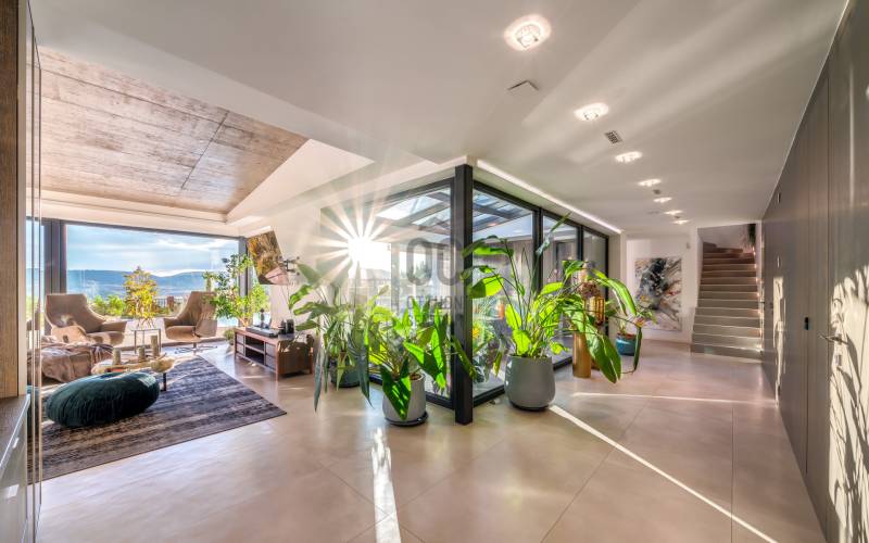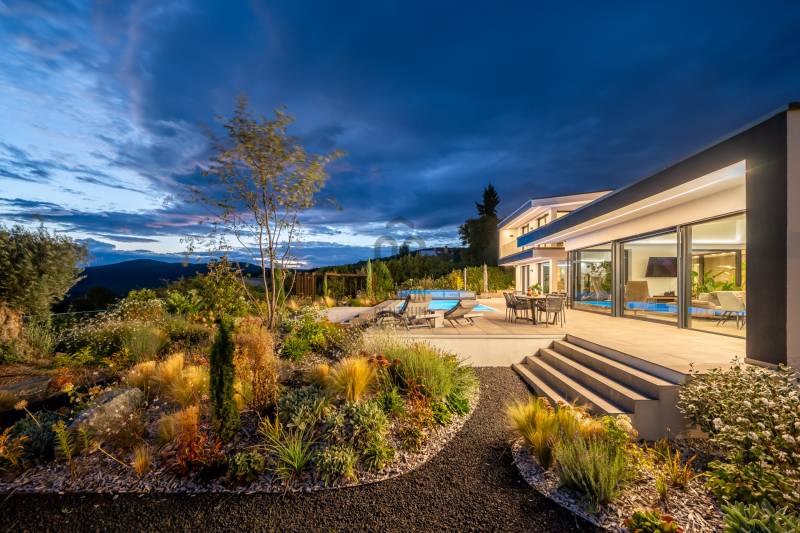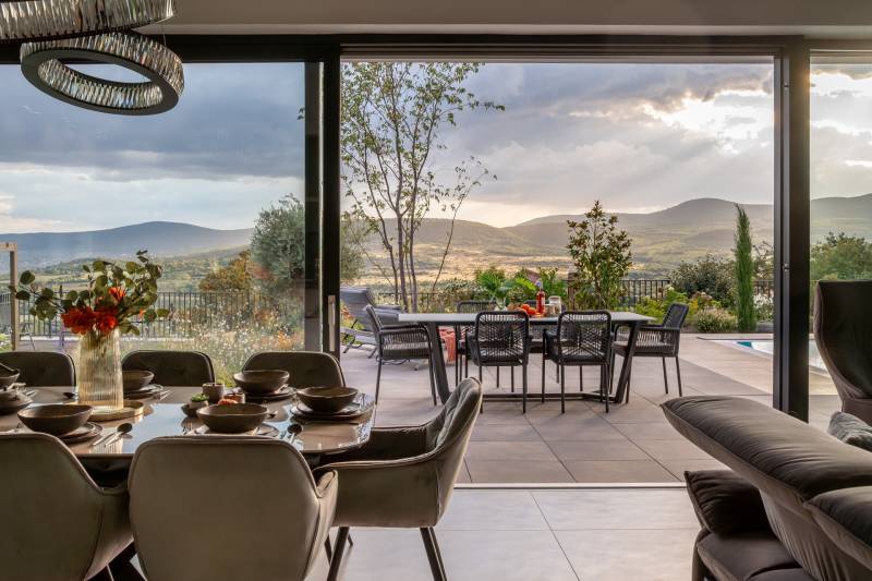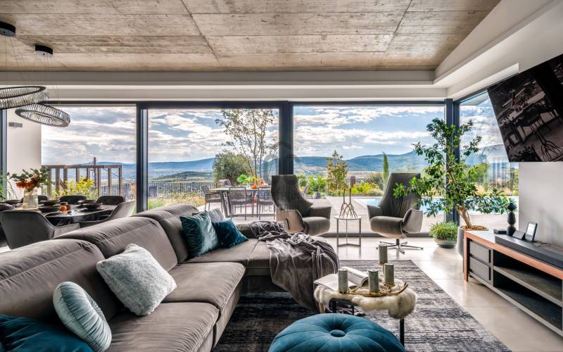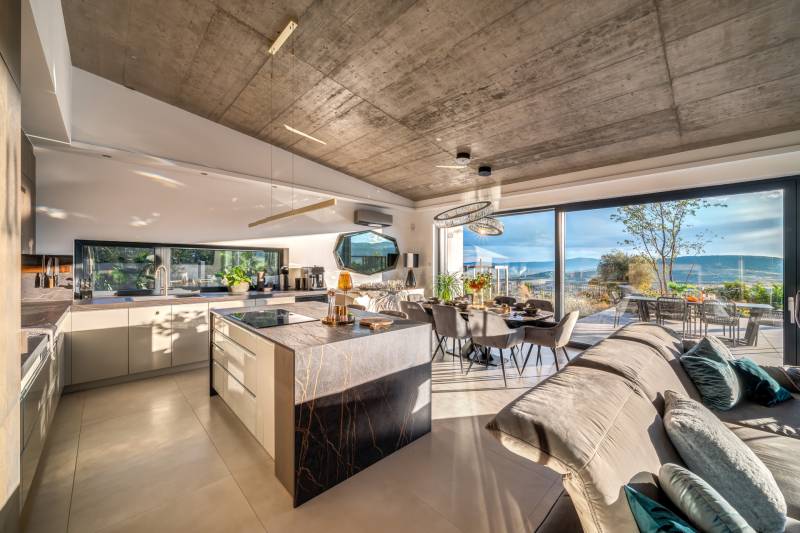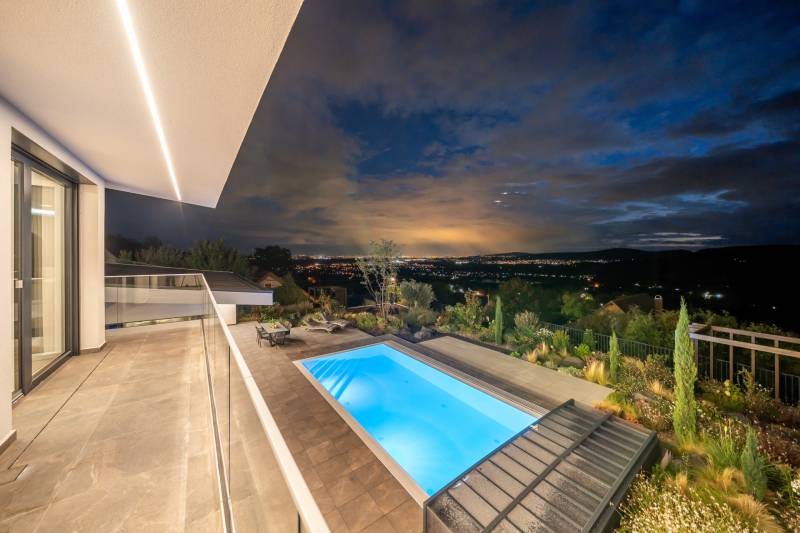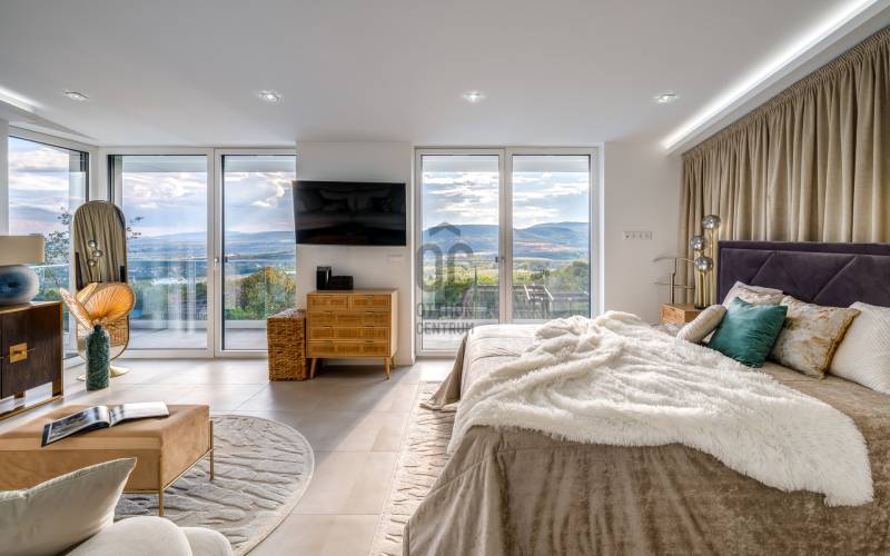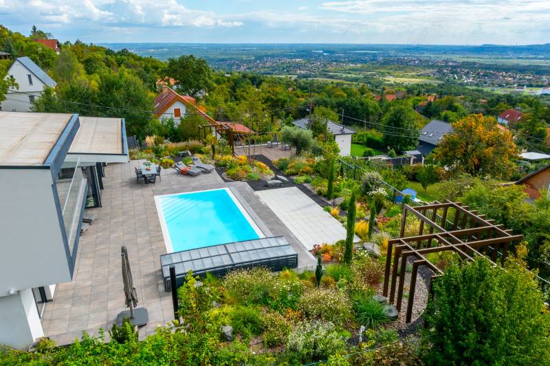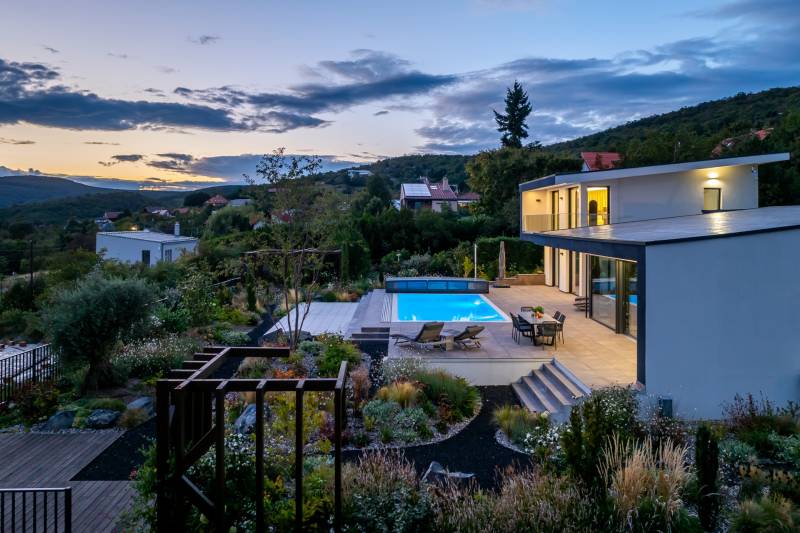 Egy hely, mely inspirál, energetizál, ahol önmagad lehetsz. Ebben a környezetben nincs legyőzhetetlen akadály. Üdv itthon! RÖVID ÖSSZEFOGLALÓSzentendrén, Szarvahegyen, a panorámás Tambura utcában – eladó ez a 278 m²-es, kétszintes, négy hálószobás, három fürdőszobás modern családi ház.A tágas terek, a medence, a kétállásos garázs, a hőszivattyús padlófűtés és mennyezethűtés, valamint a dél–nyugati fekvésű, zavartalan kilátás mind azt szolgálják, hogy itt a mindennapok álomszerűek lehessenek.Egy ház, ahol a fény mozdulatot formál, és a tér minden napszakban más arcát mutatja.Szentendre – és benne SzarvashegySzentendre sosem csupán város, inkább egy finoman pulzáló önálló világ melynek egyedi miliője semmihez sem hasonlítható. Kicsit olaszos, kicsit mediterrán - macskaköves utcái által mesebeli világba csöppen az ember és szinte észrevétlenül lelassítja lépteit.Szarvashegy az egyik legnemesebb pontja: levegője tiszta, a fák között átszűrődő fény pedig minden órában más hangulatot ad a tájnak. Innen a város látványa festményszerű – a házak teteje, a Duna kékje, a Pilis sziluettje együtt rajzolja ki azt a képet, amit naponta látva sem lehet megunni.A Tambura utca a domboldal csendes, zöld szeglete, ahol a naplemente a hegyek mögül lép elő, és estére borostyánfénybe burkolja a kertet. A környék ideális családoknak: iskola, óvoda, helyi bolt, pékség és sportpályák néhány percre, a belváros pedig tíz perc alatt elérhető.Aki Szarvashegyen él, tudja, hogy innen minden elérhető – csak épp nem kell rohanni érte.Egy vasárnap reggel a Pékműhely kovászos kenyereivel, délután séta a Bükkös-patak partján, este egy csendes borozás a teraszon — ezek nem programok, hanem ritmusok, amik idővel az élet részévé válnak.Kívül – a táj részekéntA Tambura utcai ház a domboldal természetes vonalait követi – nem uralja, inkább kiegészíti a tájat. A letisztult, modern forma, a beton és üveg finom játéka tökéletes ritmust talál a körülötte lélegző zölddel.A homlokzat kétszintes arányai határozottak, de nem szigorúak; a horizontális vonalak és a nagy üvegfelületek között megmarad az egyensúly, amelytől a ház – bár kortárs – mégis meleg és élhető.A kert lépésről lépésre tárul fel, mintha egy gondosan komponált sétaút lenne. Az illatos növények és örökzöldek keverednek az évelő virágokkal, majd a tekintet lassan a medence irányába vezet. A víztükör szinte egybeolvad a látóhatárral – az ég és a táj közötti határ elmosódik.A növényzet nem díszlet: levendula, olajfa, díszfüvek és kőágyások teremtik meg azt a mediterrán hangulatot, amely nyáron élettel tölti meg a kertet, télen pedig elegánsan visszafogott marad.A terasz tágas, természetes kőburkolata a medencével együtt a ház szíve. Itt minden a kilátásra épül – a Pilis lágy ívei, a Duna csillanása és Szentendre fényei alkotják azt a látványt, amely nemcsak díszlet, hanem a mindennapi élet része.Ahogy a nap lemegy, a medence fénye lassan átveszi a természet szerepét: a víz kékje dereng, a ház üvegfelületein megcsillan az esti fény, és a kert halk esti zsongásában az ember szinte észrevétlenül lelassul.Belül – tér, fény, ritmusAhogy belépünk, az első érzés a tágasság. A nagy üvegfelületeken át a tekintet szinte azonnal a kertbe fut, mintha a külső tér folytatódna a nappaliban. A beton mennyezet karaktere határozottságot ad, míg a meleg árnyalatú padló és a bársonyosan puha textíliák lágyítják a struktúrát – a ház egyszerre hűvös és otthonos, mint egy mély levegővétel a nyári délutánban.A nappali–étkező–konyha egyetlen folytonos tér, ahol a fény a legfontosabb szereplő. Reggel finoman áttör a függönyökön, délután táncol a márványfelületeken, estére pedig aranyló derűt von a bútorokra. A konyha központi eleme a természetes kősziget, amely egyszerre funkcionális és látványelem – itt zajlik a mindennapi élet, mégis marad benne valami ünnepélyes.A lépcső, amellyel az emeletre érkezünk, szinte szoborszerű. A lebegő hatású, fényekkel kísért fokok nemcsak közlekedést szolgálnak, hanem finom ritmust adnak a belső térnek – ahogy lépsz, a ház is mozdul veled.A hálószobák már más hangon szólnak. A főhálóban a mennyezeti ablakon át a nap első fényei puhán szűrődnek be, a falakon természetes tónusok, a textúrák között sötét fa és puha szövet váltakozik. Itt minden a pihenésről szól: a csendről, ami nem üresség, hanem jelenlét.A fürdőszobák az anyagok harmóniájára építenek: kő, üveg és fény dolgozik együtt, hogy a napi rutinból rítus legyen. Minden részlet átgondolt – a burkolatok mintája, a rejtett világítás, a terek aránya mind azt a gondoskodást tükrözik, amely ezt a házat áthatja.Ebben az otthonban nincs semmi véletlen. Minden vonal a kilátásra, minden ablak a fényre, minden anyag az időre van hangolva.A külső és belső terek között nincsen határ – inkább egyfajta lassú átmenet, mint amikor a naplemente színei fokozatosan olvadnak át az esti fénybe.Ez a ház nem egyszerűen épült – komponálták.Amennyiben szeretné személyesen is megtapasztalni ennek az otthonnak egyedülálló atmoszféráját, várom megkeresését.