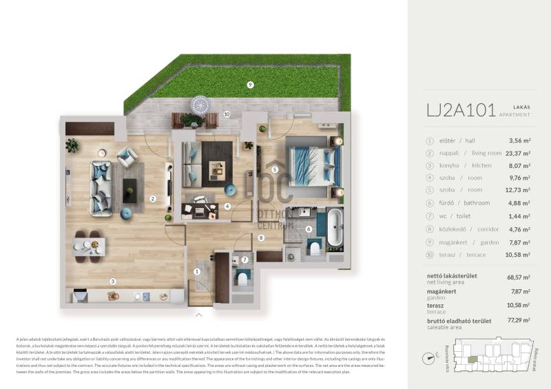 Projekt bemutatásaProjekt leírásA 147 lakásos My Garden 2 lakófejlesztés Budapest XIII. kerületének zöldövezeti részén, a Rákos-patak szomszédságában épül, ahol a modern élet és a természet harmóniája egyedülálló lakóélményt biztosít.A My Garden második ütem lakásai is magas szintű környezettudatosságot és kiemelkedő műszaki tartalmat képviselnek. Olyan fenntarthatósági megoldásokat alkalmazunk a lakóparkon, mint a megújuló energiaforrások, környezettudatos anyaghasználat, esővíz-újrahasznosítás, szelektív építési hulladékkezelés és felület hűtés-fűtés. A háromrétegű nyílászárók kiváló hő- és hangszigetelést biztosítanak, így a Le Jardin második ütemének lakásai alacsony fenntartási költségekkel és optimális komfortérzettel bírnak majd.A Váci úttól mindössze 10 percre található. A környék kifejezetten jó infrastruktúrával rendelkezik: oktatási intézményekben, bevásárlási lehetőségekben szociális-, sport- és egészségügyi létesítményekben bővelkedik a terület.A 6. emeleti penthouse lakásokból pazar kilátás nyílik a budai hegyekre, a kényelmet pedig biztosítja, hogy a nagy teraszon jacuzzi-nak kialakítható hely is található.A lakásokat átlagon felüli műszaki tartalom, energiahatékony- és gazdaságos üzemeltetés jellemzi.Környezettudatos beruházás, melynek részei a teljes mértékben- megújuló energián alapuló gépészeti megoldások,- a környezettudatos anyaghasználat,- a szelektív hulladékkezelés,- a környezettudatos vízfelhasználás,- az esővíz újrahasznosítása,- illetve a felület hűtés-fűtés.KÖZÖSSÉGI ELŐNYÖK:- közösségi nappali,- Business Corner,- közösségi BBQ hely,- fészer,- csomagpont.A fizetési ütemezés két részletben: 20% szerződéskötéskor és a fennmaradó 80% százalék a használatba vételi engedély kiadása után fizetendő a projektet finanszírozó bank felé.Átadás várható dátuma: 2027. II. negyedévTovábbi információért keressen bizalommal!