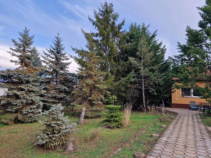 Kétgenerációs családi ház eladó Dunakeszi központjában – hatalmas, parkosított telkenDunakeszi egyik legkedveltebb, csendes utcájában, a Madách lakópark közelében kínálom eladásra ezt a ritka lehetőséget nyújtó ingatlant, amely egy 1313 m²-es, gondosan parkosított telken fekszik, két különálló épülettel – ideális nagycsaládnak, két generációnak vagy vállalkozásnak.Nagyobb épület (főház)A főépületben 3 tágas szoba található, kiváló elosztással, világos terekkel. A ház egyik legnagyobb előnye a nagyméretű, fedett terasz, amely egész évben kellemes pihenő helyét biztosít.Modern műanyag nyílászárók, motoros alumínium redőnyök és szúnyoghálók gondoskodnak a komfortérzetről, a fűtést pedig Wolf cirkó gázkazán, valamint 2 db 3,5 kW-os inverteres klíma segíti.Kisebb épület (különálló lakrész)A második épület teljesen önálló lakóegység:– 1 külön szoba– 1 konyha– 1 fürdőszobaEz ideális lehet nagyszülőknek, felnőtt gyereknek, bérbeadásra vagy vállalkozási célokra.Kert és extrákA telken 96 db fenyőfa és leylandi ciprus biztosít intim, zöld környezetet.A kertet automata öntözőrendszer tartja karban, mely a telken lévő gyűrűs kútról működik.A kinti programokhoz épített kerti grillező is rendelkezésre áll.A házban riasztórendszer és éjszakai áram lehetőség adott.ElhelyezkedésA ház Dunakeszi központi, mégis rendkívül nyugodt részén található. Pár perc sétán belül elérhető:– vasútállomás– buszmegálló– üzletek, bevásárlási lehetőségek– orvos, óvoda, iskolaJelenlegi ingatlan eladásában, és vagy hitel felvételben irodánk áll rendelkezésére.