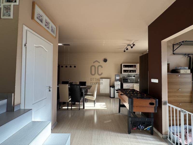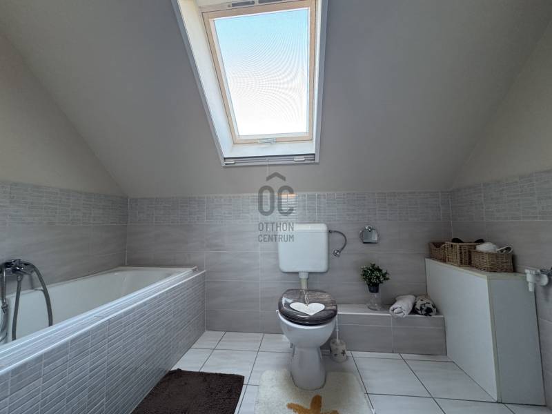 Fót az északi agglomeráció dinamikusan fejlődő városa, történelmi múlttal és ehhez méltó csodálatos kultúrkörrel rendelkezik a Fővárostól egy karnyújtásnyira.Gyönyörűen gondozott köztereivel, nívós intézményeivel, zöld határaival és remek infrastruktúrájával méltán vált a kiköltöző Családok dobogós választásává az elmúlt években.Itt, csendes utca végében került eladósorba egy kiváló adottságú IKERHÁZ.Szélső, sarki épület, így abszolút szeparált, intim kerttel rendelkezik, mely éppen akkora hogy gondozása nem teher és tökéletesen helyet adhat családi BBQ partyknak, létesíthető benne gyermekjátszótér, grillterasz és így is marad hely autóbeállásra valamint a konyhakertnek.Fiatal építésű, ehhez mérten korszerű, dryvit palástba bújtatott homlokzat, gondosan szigetelt födém és tetősík, műanyagtokos thermoüveges nyílászárók és kondenzációs gázkazánról biztosított fűtés. A nyári hőszabályozást klímaegységek segítik, a kerti tárolásra pedig faházikó áll rendelkezésre.2 szinten bruttó 100m2-el gazdálkodik, melyben optimális elrendezés valósult meg:Földszinten kényelmes előszoba, világos, nagy, teraszkapcsolatos nappali, tágas étkező-konyha, lépcső alatti mosókonyha wc-vel valamint a nagy fedett terasz kaptak helyet. Emeleti szinten 3 hálószoba, közlekedő és nagy fürdőszoba alkotják a helyiséglistát. A szobák saját franciaerkéllyel rendelkeznek, a tetőteres kialakítás ellenére jól bútorozhatóak, és kellemes világos életteret biztosítanak Lakóiknak. A fürdőszoba nagy, káddal és zuhanykabinnal is ellátott.Optimális, elrendezés, kényelmes tér, igényes kialakítás!Tökéletes választás azoknak, akik Budapestről kiköltözve vágynak a kertre, akik családalapítás céljából keresgélik új Otthonukat és olyan környezetben képzelik el a jövőjüket ahonnan a közlekedés megoldott, a szomszédság rendezett, a ház pedig fiatalos és nem kell hozzányúlni még jó pár évig!Jöjjön el, tekintse meg, FRISSEN VAN PIACON és biztos hogy nem sokáig!-alaprajz feltöltése folyamatban-
