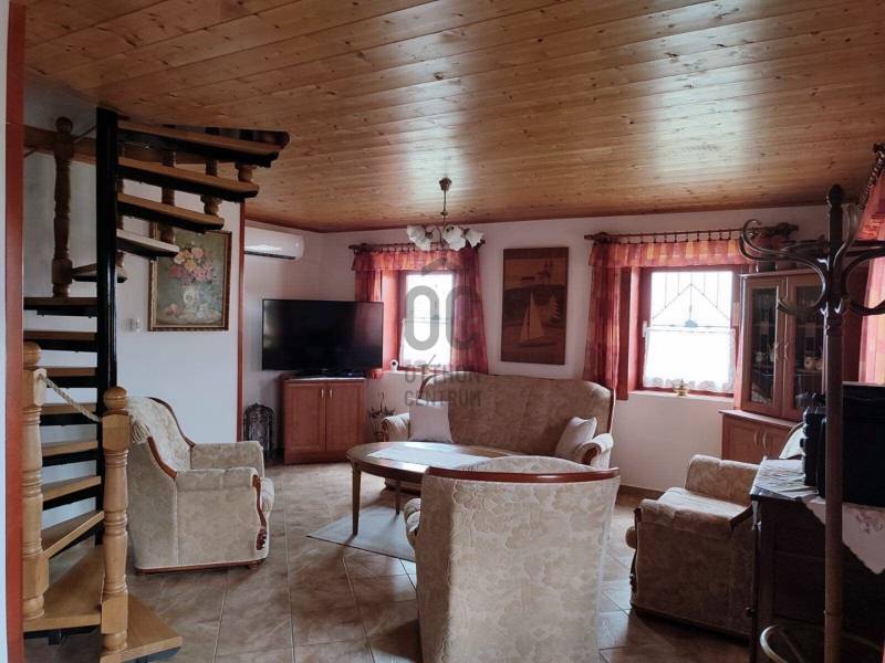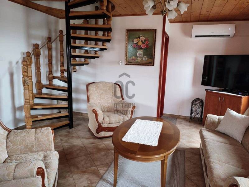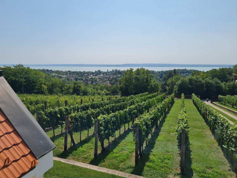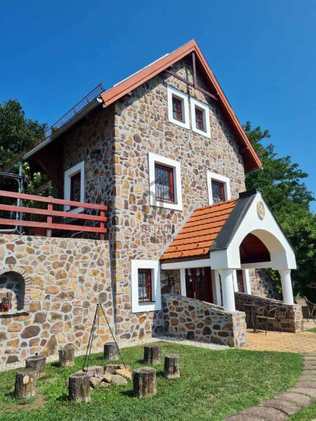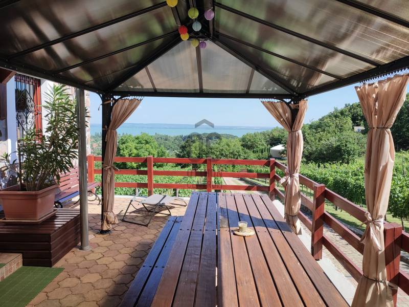 KIEMELT MEGBÍZÁS AZ OTTHON CENTRUM KÍNÁLATÁBAN!Ábrahámhegy festői környezetben a Balaton északi partján a nyugat felől magasodó Örsi hegy és a Tapolcai-medence tanúhegyeinek karéjában fekszik. A táj ősidők óta hazája a szőlőnek és a bornak és a nyári időszakban itt található a környék egyik legkedveltebb fürdőhelye is.A település egyik legmagasabb pontján vált eladóvá ez a különleges kialakítású, Balaton-felvidéki hangulatot árasztó ingatlan a hozzá tartozó 2067 m²-es szőlős területtel.A terület télen-nyáron jól járható úton közelíthető meg, teljesen körbekerített. A telekre betelepített Szürkebarát szőlő folyamatosan gondozott, karbantartott. Az utcafronti részt terméskő kerítés határolja, ez a kőmunka folytatódik az autófeljárón és a támfalakon, valamint a ház egészét is helyi \"vöröskő\" burkolja körbe, így kölcsönözve egyedi és tájba illő hangulatot a birtoknak.A gazdasági épületként bejegyzett ház 2005-ben épült, 3 szinten összesen 146 m²-es hasznos területtel rendelkezik. Az 50 cm-es kő-tégla falakkal rendelkező masszív épület szintjei épületen belül átjárhatóak. A házba hűtő-fűtő klímák kerültek betelepítésre, melyek áramellátását a kiépített napelemrendszer biztosítja, ezenfelül a fűtés a ház alsó- és földszinti részén fatüzelésű kályha használatával is kiegészíthető.A ház szintenkénti elosztása:Alsó szint: konyha, étkező, nappali/ háló, fürdőszoba, tároló, egyedi kialakítású, hangulatos borospinceFöldszint: nappali, étkező, konyha, fürdőszoba, lépcsőház és terasz.Emelet: 3 hálószoba és előszobaA házban riasztórendszer került kiépítésre. Az áram valamint a vezetékes víz bevezetésre került, szennyvíz derítő áll rendelkezésre a szennyvízelvezetéshez. Az esővíz gyűjtésére 2 ciszterna is kialakításra került, melyekből a locsolás könnyedén megoldható.A földszinti részhez kapcsolódó - nyári időszakban plusz életteret biztosító - hatalmas teraszról, de a telekről és a ház egészéből is teljes rálátást kapunk az előttünk elterülő Balaton vizére!A zárt parkolórészen és fedett kocsibeállón több autó egyidejű parkolása is lehetséges.Ajánlom az ingatlant mindazok figyelmébe,akik a \"béke szigetét\" keresik távol a mindennapoktól. A ház tökéletes nyaralónak, turisztikai befektetésként is vonzó lehet és állandó lakhatásra is alkalmas!Amennyiben kérdése merülne fel az ingatlannal kapcsolatban vagy szeretné azt megtekinteni, kérem keressen a megadott elérhetőségek egyikén!
