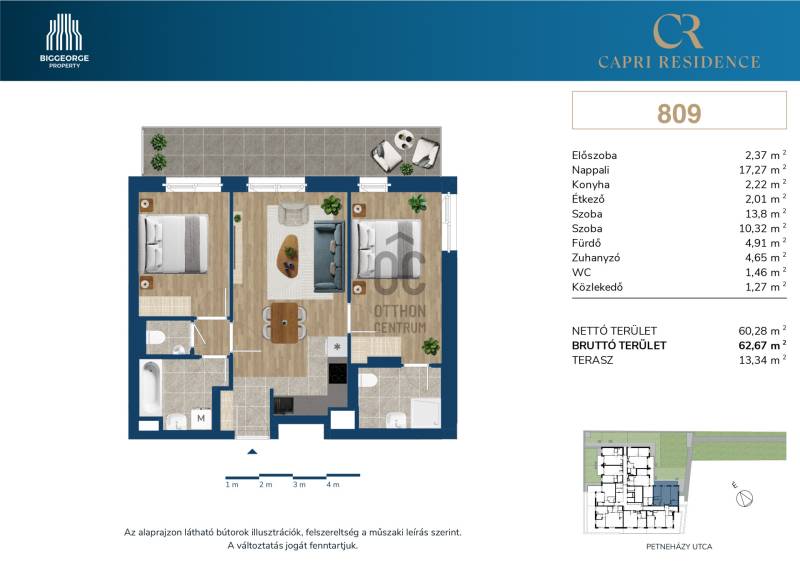 Projekt bemutatásaA Capri Residence a XIII. kerület szívében, a dinamikusan fejlődő Váci út közvetlen közelében valósul meg, amely Budapest egyik legkeresettebb lakáspiaci területe. Az elegáns, modern megjelenésű épületet, a homlokzatán végigfutó üvegkorlátos teraszok díszítik majd, a felsőbb szinteken pedig nagyteraszos lakások is elérhetők, amelyek egy része panorámás kilátást biztosít.Az épületben összesen 112 lakás kap helyet, amelyek elrendezése a stúdiótól a nappali plusz három hálószobásig terjednek. Az épületben emellett egy közösségi tér, 122 parkolóhely, 62 tároló, valamint opcionálisan elektromos autótöltővel szerelt teremgarázs beállók is megépítésre kerülnek.A műszaki felszereltség a legmagasabb szakmai trendeket követi: a Capri Residence lakóinak kényelmét mennyezeti hűtés-fűtés, háromrétegű üvegezéssel ellátott műanyag nyílászárók, smart-home előkészítés, valamint belsőépítész által összeállított belső anyagválaszték biztosítja majd. A földszinti lakásokhoz privát kertkapcsolat tartozik, emellett a társasház közös díszkerttel is rendelkezik.