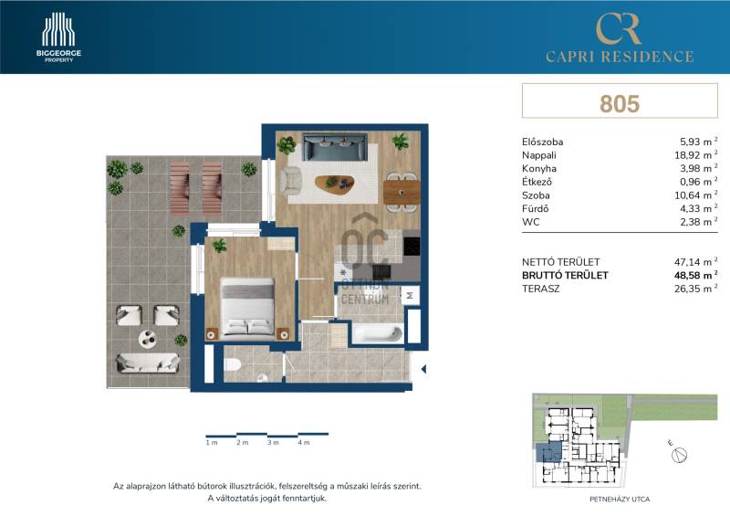 Projekt bemutatásaA Capri Residence a XIII. kerület szívében, a dinamikusan fejlődő Váci út közvetlen közelében valósul meg, amely Budapest egyik legkeresettebb lakáspiaci területe. Az elegáns, modern megjelenésű épületet, a homlokzatán végigfutó üvegkorlátos teraszok díszítik majd, a felsőbb szinteken pedig nagyteraszos lakások is elérhetők, amelyek egy része panorámás kilátást biztosít.Az épületben összesen 112 lakás kap helyet, amelyek elrendezése a stúdiótól a nappali plusz három hálószobásig terjednek. Az épületben emellett egy közösségi tér, 122 parkolóhely, 62 tároló, valamint opcionálisan elektromos autótöltővel szerelt teremgarázs beállók is megépítésre kerülnek.A műszaki felszereltség a legmagasabb szakmai trendeket követi: a Capri Residence lakóinak kényelmét mennyezeti hűtés-fűtés, háromrétegű üvegezéssel ellátott műanyag nyílászárók, smart-home előkészítés, valamint belsőépítész által összeállított belső anyagválaszték biztosítja majd. A földszinti lakásokhoz privát kertkapcsolat tartozik, emellett a társasház közös díszkerttel is rendelkezik.