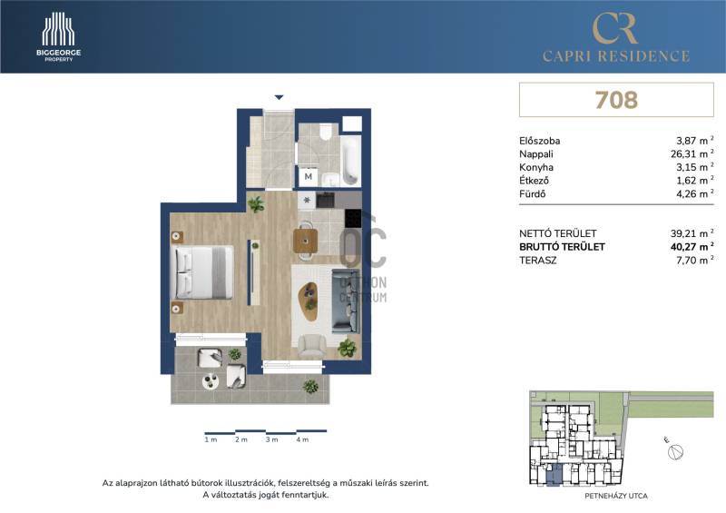 Projekt bemutatásaA Capri Residence a XIII. kerület szívében, a dinamikusan fejlődő Váci út közvetlen közelében valósul meg, amely Budapest egyik legkeresettebb lakáspiaci területe. Az elegáns, modern megjelenésű épületet, a homlokzatán végigfutó üvegkorlátos teraszok díszítik majd, a felsőbb szinteken pedig nagyteraszos lakások is elérhetők, amelyek egy része panorámás kilátást biztosít.Az épületben összesen 112 lakás kap helyet, amelyek elrendezése a stúdiótól a nappali plusz három hálószobásig terjednek. Az épületben emellett egy közösségi tér, 122 parkolóhely, 62 tároló, valamint opcionálisan elektromos autótöltővel szerelt teremgarázs beállók is megépítésre kerülnek.A műszaki felszereltség a legmagasabb szakmai trendeket követi: a Capri Residence lakóinak kényelmét mennyezeti hűtés-fűtés, háromrétegű üvegezéssel ellátott műanyag nyílászárók, smart-home előkészítés, valamint belsőépítész által összeállított belső anyagválaszték biztosítja majd. A földszinti lakásokhoz privát kertkapcsolat tartozik, emellett a társasház közös díszkerttel is rendelkezik.