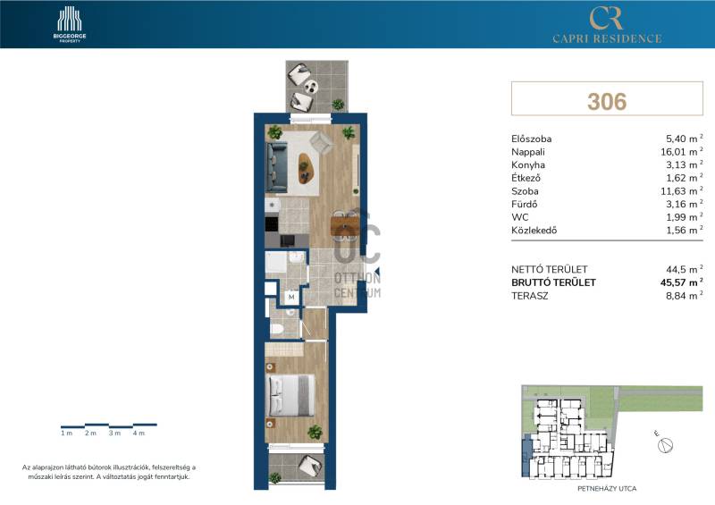 Projekt bemutatásaA Capri Residence a XIII. kerület szívében, a dinamikusan fejlődő Váci út közvetlen közelében valósul meg, amely Budapest egyik legkeresettebb lakáspiaci területe. Az elegáns, modern megjelenésű épületet, a homlokzatán végigfutó üvegkorlátos teraszok díszítik majd, a felsőbb szinteken pedig nagyteraszos lakások is elérhetők, amelyek egy része panorámás kilátást biztosít.Az épületben összesen 112 lakás kap helyet, amelyek elrendezése a stúdiótól a nappali plusz három hálószobásig terjednek. Az épületben emellett egy közösségi tér, 122 parkolóhely, 62 tároló, valamint opcionálisan elektromos autótöltővel szerelt teremgarázs beállók is megépítésre kerülnek.A műszaki felszereltség a legmagasabb szakmai trendeket követi: a Capri Residence lakóinak kényelmét mennyezeti hűtés-fűtés, háromrétegű üvegezéssel ellátott műanyag nyílászárók, smart-home előkészítés, valamint belsőépítész által összeállított belső anyagválaszték biztosítja majd. A földszinti lakásokhoz privát kertkapcsolat tartozik, emellett a társasház közös díszkerttel is rendelkezik.