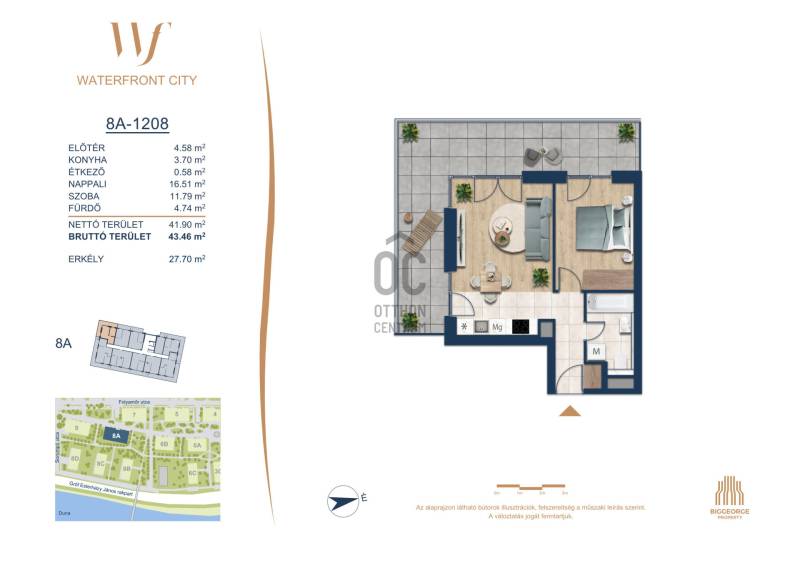 Projekt bemutatásaA projektrőlA Waterfront City egy új, modern városnegyed a 3. kerületben, ahol a természet közelsége és a városi kényelem tökéletes egyensúlyban van. A Duna-part közvetlen szomszédságában elhelyezkedő fejlesztés különleges atmoszférát kínál: a sétányt új épületek határolják, üzletekkel, kávézókkal és szolgáltatásokkal, amelyek élhető közösségi teret teremtenek.A 13 emeletes lakóépületből lenyűgöző örökpanoráma nyílik a budai hegyekre és a folyóra, a tágas teraszok pedig ideálisak a pihenéshez vagy a baráti összejövetelekhez. A zöldtetők, parkosított terek és fenntartható megoldások – mint az energiatakarékos rendszerek és okos otthon funkciók – mind hozzájárulnak a modern, környezettudatos életstílushoz.Látogass el értékesítési irodánkba, és tekintsd meg a városnegyed makettjét személyesen! Ismerd meg, milyen lesz az élet Budapest egyik legizgalmasabb új fejlesztésében!Óbuda szívébenKépzeld el, ahogy egy napsütéses délelőttön Óbuda szívében sétálsz, a Duna közelsége frissítően hat rád, miközben a Folyamőr utca, a Miklós tér és a Bogdáni út által határolt, öt hektáros területre érsz. A levegőben ott van a város történelme, mégis minden részletében a jövő hívogat.A 50 000 négyzetméteres területen egy hangulatos sétány vezet végig, amely egyenesen az óbudai Fő térre visz – mindössze 600 méterre. Ez a sétány nem csupán összeköt, hanem élményt nyújt: a Kolosy térről induló Óbudai Promenád részeként a város egyik legélhetőbb, legpezsgőbb szakaszán haladsz végig. És ha biciklivel érkeznél? A nemzetközi kerékpárút is itt halad el, Szentendre felé vezetve.Az 5. ütemben épülő 149 lakás mindegyike egyedi hangulatot kínál. Ahogy belépsz egy-egy otthonba, a hatalmas üvegfelületeken át beáradó fény és a tágas, szellős terek azonnal magukkal ragadnak. A kilátás? A Kaszap István park zöldje nyújt békét, míg a felsőbb emeletekről a Budai-hegység örökpanorámája tárul eléd – minden nap egy új festmény az ablakodban.A 6. ütemben 316 modern lakás épül, tágas teraszokkal és lenyűgöző kilátással a Dunára és a budai hegyekre. A lakók kényelmét őrszolgálat, kamerarendszer, mélygarázs, vendéglátóhelyek, belső park, játszótér és E-autó töltők szolgálják. Ez a projekt utolsó üteme, amely még közvetlen Duna-parti kapcsolattal rendelkezik.
