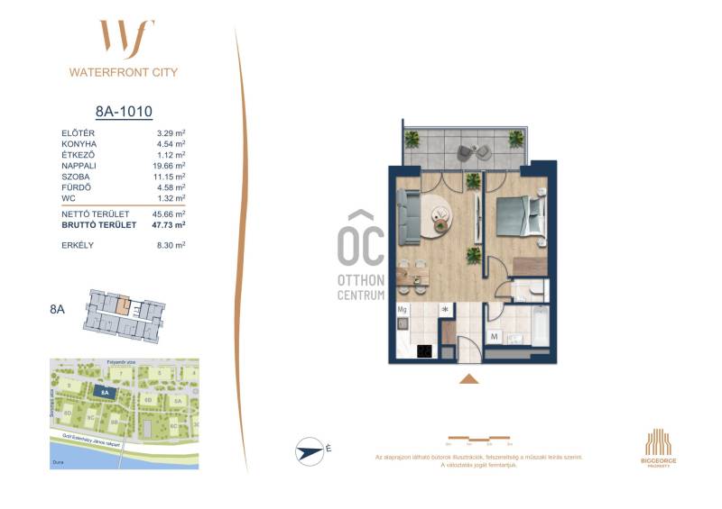 Projekt bemutatásaA projektrőlA Waterfront City egy új, modern városnegyed a 3. kerületben, ahol a természet közelsége és a városi kényelem tökéletes egyensúlyban van. A Duna-part közvetlen szomszédságában elhelyezkedő fejlesztés különleges atmoszférát kínál: a sétányt új épületek határolják, üzletekkel, kávézókkal és szolgáltatásokkal, amelyek élhető közösségi teret teremtenek.A 13 emeletes lakóépületből lenyűgöző örökpanoráma nyílik a budai hegyekre és a folyóra, a tágas teraszok pedig ideálisak a pihenéshez vagy a baráti összejövetelekhez. A zöldtetők, parkosított terek és fenntartható megoldások – mint az energiatakarékos rendszerek és okos otthon funkciók – mind hozzájárulnak a modern, környezettudatos életstílushoz.Látogass el értékesítési irodánkba, és tekintsd meg a városnegyed makettjét személyesen! Ismerd meg, milyen lesz az élet Budapest egyik legizgalmasabb új fejlesztésében!Óbuda szívébenKépzeld el, ahogy egy napsütéses délelőttön Óbuda szívében sétálsz, a Duna közelsége frissítően hat rád, miközben a Folyamőr utca, a Miklós tér és a Bogdáni út által határolt, öt hektáros területre érsz. A levegőben ott van a város történelme, mégis minden részletében a jövő hívogat.A 50 000 négyzetméteres területen egy hangulatos sétány vezet végig, amely egyenesen az óbudai Fő térre visz – mindössze 600 méterre. Ez a sétány nem csupán összeköt, hanem élményt nyújt: a Kolosy térről induló Óbudai Promenád részeként a város egyik legélhetőbb, legpezsgőbb szakaszán haladsz végig. És ha biciklivel érkeznél? A nemzetközi kerékpárút is itt halad el, Szentendre felé vezetve.Az 5. ütemben épülő 149 lakás mindegyike egyedi hangulatot kínál. Ahogy belépsz egy-egy otthonba, a hatalmas üvegfelületeken át beáradó fény és a tágas, szellős terek azonnal magukkal ragadnak. A kilátás? A Kaszap István park zöldje nyújt békét, míg a felsőbb emeletekről a Budai-hegység örökpanorámája tárul eléd – minden nap egy új festmény az ablakodban.A 6. ütemben 316 modern lakás épül, tágas teraszokkal és lenyűgöző kilátással a Dunára és a budai hegyekre. A lakók kényelmét őrszolgálat, kamerarendszer, mélygarázs, vendéglátóhelyek, belső park, játszótér és E-autó töltők szolgálják. Ez a projekt utolsó üteme, amely még közvetlen Duna-parti kapcsolattal rendelkezik.