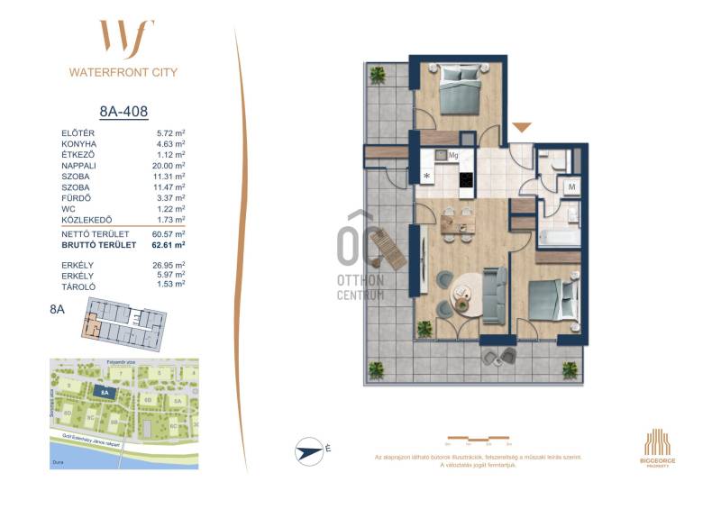 Projekt bemutatásaA projektrőlA Waterfront City egy új, modern városnegyed a 3. kerületben, ahol a természet közelsége és a városi kényelem tökéletes egyensúlyban van. A Duna-part közvetlen szomszédságában elhelyezkedő fejlesztés különleges atmoszférát kínál: a sétányt új épületek határolják, üzletekkel, kávézókkal és szolgáltatásokkal, amelyek élhető közösségi teret teremtenek.A 13 emeletes lakóépületből lenyűgöző örökpanoráma nyílik a budai hegyekre és a folyóra, a tágas teraszok pedig ideálisak a pihenéshez vagy a baráti összejövetelekhez. A zöldtetők, parkosított terek és fenntartható megoldások – mint az energiatakarékos rendszerek és okos otthon funkciók – mind hozzájárulnak a modern, környezettudatos életstílushoz.Látogass el értékesítési irodánkba, és tekintsd meg a városnegyed makettjét személyesen! Ismerd meg, milyen lesz az élet Budapest egyik legizgalmasabb új fejlesztésében!Óbuda szívébenKépzeld el, ahogy egy napsütéses délelőttön Óbuda szívében sétálsz, a Duna közelsége frissítően hat rád, miközben a Folyamőr utca, a Miklós tér és a Bogdáni út által határolt, öt hektáros területre érsz. A levegőben ott van a város történelme, mégis minden részletében a jövő hívogat.A 50 000 négyzetméteres területen egy hangulatos sétány vezet végig, amely egyenesen az óbudai Fő térre visz – mindössze 600 méterre. Ez a sétány nem csupán összeköt, hanem élményt nyújt: a Kolosy térről induló Óbudai Promenád részeként a város egyik legélhetőbb, legpezsgőbb szakaszán haladsz végig. És ha biciklivel érkeznél? A nemzetközi kerékpárút is itt halad el, Szentendre felé vezetve.Az 5. ütemben épülő 149 lakás mindegyike egyedi hangulatot kínál. Ahogy belépsz egy-egy otthonba, a hatalmas üvegfelületeken át beáradó fény és a tágas, szellős terek azonnal magukkal ragadnak. A kilátás? A Kaszap István park zöldje nyújt békét, míg a felsőbb emeletekről a Budai-hegység örökpanorámája tárul eléd – minden nap egy új festmény az ablakodban.A 6. ütemben 316 modern lakás épül, tágas teraszokkal és lenyűgöző kilátással a Dunára és a budai hegyekre. A lakók kényelmét őrszolgálat, kamerarendszer, mélygarázs, vendéglátóhelyek, belső park, játszótér és E-autó töltők szolgálják. Ez a projekt utolsó üteme, amely még közvetlen Duna-parti kapcsolattal rendelkezik.