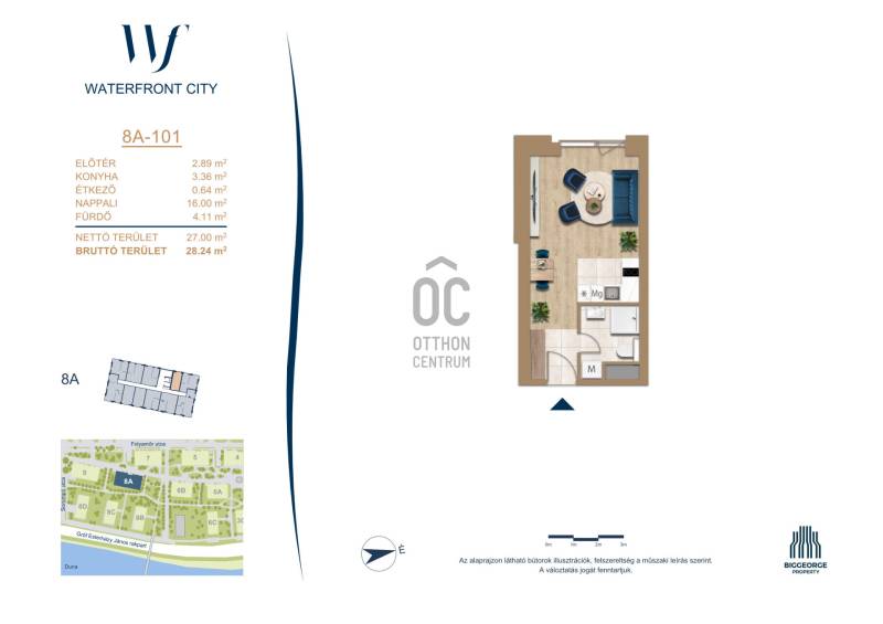 Projekt bemutatásaA projektrőlA Waterfront City egy új, modern városnegyed a 3. kerületben, ahol a természet közelsége és a városi kényelem tökéletes egyensúlyban van. A Duna-part közvetlen szomszédságában elhelyezkedő fejlesztés különleges atmoszférát kínál: a sétányt új épületek határolják, üzletekkel, kávézókkal és szolgáltatásokkal, amelyek élhető közösségi teret teremtenek.A 13 emeletes lakóépületből lenyűgöző örökpanoráma nyílik a budai hegyekre és a folyóra, a tágas teraszok pedig ideálisak a pihenéshez vagy a baráti összejövetelekhez. A zöldtetők, parkosított terek és fenntartható megoldások – mint az energiatakarékos rendszerek és okos otthon funkciók – mind hozzájárulnak a modern, környezettudatos életstílushoz.Látogass el értékesítési irodánkba, és tekintsd meg a városnegyed makettjét személyesen! Ismerd meg, milyen lesz az élet Budapest egyik legizgalmasabb új fejlesztésében!Óbuda szívébenKépzeld el, ahogy egy napsütéses délelőttön Óbuda szívében sétálsz, a Duna közelsége frissítően hat rád, miközben a Folyamőr utca, a Miklós tér és a Bogdáni út által határolt, öt hektáros területre érsz. A levegőben ott van a város történelme, mégis minden részletében a jövő hívogat.A 50 000 négyzetméteres területen egy hangulatos sétány vezet végig, amely egyenesen az óbudai Fő térre visz – mindössze 600 méterre. Ez a sétány nem csupán összeköt, hanem élményt nyújt: a Kolosy térről induló Óbudai Promenád részeként a város egyik legélhetőbb, legpezsgőbb szakaszán haladsz végig. És ha biciklivel érkeznél? A nemzetközi kerékpárút is itt halad el, Szentendre felé vezetve.Az 5. ütemben épülő 149 lakás mindegyike egyedi hangulatot kínál. Ahogy belépsz egy-egy otthonba, a hatalmas üvegfelületeken át beáradó fény és a tágas, szellős terek azonnal magukkal ragadnak. A kilátás? A Kaszap István park zöldje nyújt békét, míg a felsőbb emeletekről a Budai-hegység örökpanorámája tárul eléd – minden nap egy új festmény az ablakodban.A 6. ütemben 316 modern lakás épül, tágas teraszokkal és lenyűgöző kilátással a Dunára és a budai hegyekre. A lakók kényelmét őrszolgálat, kamerarendszer, mélygarázs, vendéglátóhelyek, belső park, játszótér és E-autó töltők szolgálják. Ez a projekt utolsó üteme, amely még közvetlen Duna-parti kapcsolattal rendelkezik.
