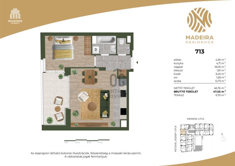 Projekt bemutatásaA projektrőlKépzeld el, ahogy belépsz Újbuda egyik legbékésebb, zöldövezeti utcájába, ahol a nyugalom átveszi a helyét a város zajos ritmusától. A Mérnök utcában, a Fehérvári út és az Etele út találkozásának közelében, egy elegánsan modern épület rajzolódik ki előtted – ez a Madeira Residence.Ahogy közelebb lépsz, a homlokzat letisztultsága, a loggiák ritmikus váltakozása azonnal megragadja a tekinteted. A pálcás korlátok finom eleganciát sugároznak, a napfény pedig játékosan tükröződik a teraszok üvegfelületein. Már kívülről is érezni: ez nem csupán egy lakóépület, hanem egy életérzés.Az első emeleti lakások egy része saját tetőkerttel rendelkezik – képzeld el, ahogy reggel a kávédat kortyolgatod a saját kis zöld oázisodban, miközben a madarak csicsergése tölti be a teret. Minden lakásban ott a tágas nappali, a kényelmes hálószobák, és a saját erkély vagy terasz, ahol a nap bármely szakában megpihenhetsz.A Madeira Residence nem csupán egy új építésű társasház – ez egy hely, ahol a modern életstílus találkozik a természet közelségével és a családbarát környezettel. Egy otthon, ahol minden nap élmény.A belső térben a kényelem és a fenntarthatóság kéz a kézben jár. A mennyezeti hűtés-fűtés rendszer csendesen gondoskodik a kellemes hőmérsékletről, az okosotthon-előkészítés pedig lehetővé teszi, hogy a technológia valóban a kényelmedet szolgálja. A mélygarázsban kényelmes parkolás vár, a kerékpártárolók és az elektromos autótöltési lehetőség pedig a környezettudatos életmódot támogatják.A környék infrastruktúrája kiváló: a közelben kiépített kerékpárutak, car sharing szolgáltatások és elektromos rollerek teszik egyszerűvé és fenntarthatóvá a közlekedést. A családosok számára külön öröm, hogy több játszótér is található a közelben – a gyerekek biztonságban, szabadon játszhatnak, miközben a szülők nyugodtan élvezhetik a környék nyugalmát.A Madeira Residence nem csupán egy új lakóépület – ez egy életérzés, ahol a mindennapok élménnyé válnak.