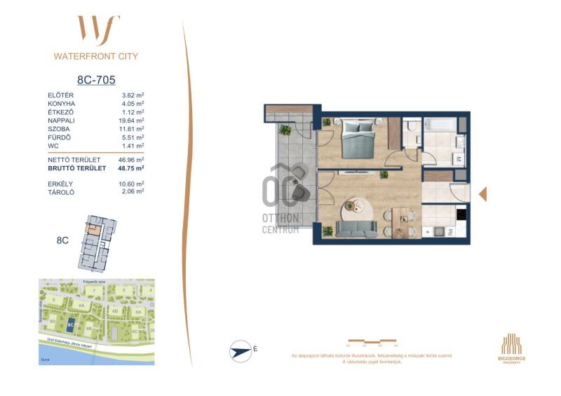 Projekt bemutatásaA projektrőlA Waterfront City egy új, modern városnegyed a 3. kerületben, ahol a természet közelsége és a városi kényelem tökéletes egyensúlyban van. A Duna-part közvetlen szomszédságában elhelyezkedő fejlesztés különleges atmoszférát kínál: a sétányt új épületek határolják, üzletekkel, kávézókkal és szolgáltatásokkal, amelyek élhető közösségi teret teremtenek.A 13 emeletes lakóépületből lenyűgöző örökpanoráma nyílik a budai hegyekre és a folyóra, a tágas teraszok pedig ideálisak a pihenéshez vagy a baráti összejövetelekhez. A zöldtetők, parkosított terek és fenntartható megoldások – mint az energiatakarékos rendszerek és okos otthon funkciók – mind hozzájárulnak a modern, környezettudatos életstílushoz.Látogass el értékesítési irodánkba, és tekintsd meg a városnegyed makettjét személyesen! Ismerd meg, milyen lesz az élet Budapest egyik legizgalmasabb új fejlesztésében!Óbuda szívébenKépzeld el, ahogy egy napsütéses délelőttön Óbuda szívében sétálsz, a Duna közelsége frissítően hat rád, miközben a Folyamőr utca, a Miklós tér és a Bogdáni út által határolt, öt hektáros területre érsz. A levegőben ott van a város történelme, mégis minden részletében a jövő hívogat.A 50 000 négyzetméteres területen egy hangulatos sétány vezet végig, amely egyenesen az óbudai Fő térre visz – mindössze 600 méterre. Ez a sétány nem csupán összeköt, hanem élményt nyújt: a Kolosy térről induló Óbudai Promenád részeként a város egyik legélhetőbb, legpezsgőbb szakaszán haladsz végig. És ha biciklivel érkeznél? A nemzetközi kerékpárút is itt halad el, Szentendre felé vezetve.Az 5. ütemben épülő 149 lakás mindegyike egyedi hangulatot kínál. Ahogy belépsz egy-egy otthonba, a hatalmas üvegfelületeken át beáradó fény és a tágas, szellős terek azonnal magukkal ragadnak. A kilátás? A Kaszap István park zöldje nyújt békét, míg a felsőbb emeletekről a Budai-hegység örökpanorámája tárul eléd – minden nap egy új festmény az ablakodban.A 6. ütemben 316 modern lakás épül, tágas teraszokkal és lenyűgöző kilátással a Dunára és a budai hegyekre. A lakók kényelmét őrszolgálat, kamerarendszer, mélygarázs, vendéglátóhelyek, belső park, játszótér és E-autó töltők szolgálják. Ez a projekt utolsó üteme, amely még közvetlen Duna-parti kapcsolattal rendelkezik.