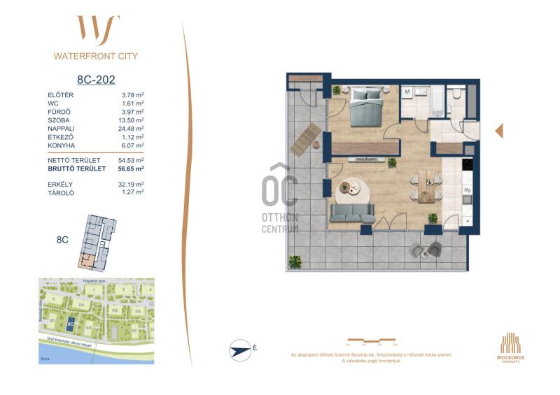 Projekt bemutatásaA projektrőlA Waterfront City egy új, modern városnegyed a 3. kerületben, ahol a természet közelsége és a városi kényelem tökéletes egyensúlyban van. A Duna-part közvetlen szomszédságában elhelyezkedő fejlesztés különleges atmoszférát kínál: a sétányt új épületek határolják, üzletekkel, kávézókkal és szolgáltatásokkal, amelyek élhető közösségi teret teremtenek.A 13 emeletes lakóépületből lenyűgöző örökpanoráma nyílik a budai hegyekre és a folyóra, a tágas teraszok pedig ideálisak a pihenéshez vagy a baráti összejövetelekhez. A zöldtetők, parkosított terek és fenntartható megoldások – mint az energiatakarékos rendszerek és okos otthon funkciók – mind hozzájárulnak a modern, környezettudatos életstílushoz.Látogass el értékesítési irodánkba, és tekintsd meg a városnegyed makettjét személyesen! Ismerd meg, milyen lesz az élet Budapest egyik legizgalmasabb új fejlesztésében!Óbuda szívébenKépzeld el, ahogy egy napsütéses délelőttön Óbuda szívében sétálsz, a Duna közelsége frissítően hat rád, miközben a Folyamőr utca, a Miklós tér és a Bogdáni út által határolt, öt hektáros területre érsz. A levegőben ott van a város történelme, mégis minden részletében a jövő hívogat.A 50 000 négyzetméteres területen egy hangulatos sétány vezet végig, amely egyenesen az óbudai Fő térre visz – mindössze 600 méterre. Ez a sétány nem csupán összeköt, hanem élményt nyújt: a Kolosy térről induló Óbudai Promenád részeként a város egyik legélhetőbb, legpezsgőbb szakaszán haladsz végig. És ha biciklivel érkeznél? A nemzetközi kerékpárút is itt halad el, Szentendre felé vezetve.Az 5. ütemben épülő 149 lakás mindegyike egyedi hangulatot kínál. Ahogy belépsz egy-egy otthonba, a hatalmas üvegfelületeken át beáradó fény és a tágas, szellős terek azonnal magukkal ragadnak. A kilátás? A Kaszap István park zöldje nyújt békét, míg a felsőbb emeletekről a Budai-hegység örökpanorámája tárul eléd – minden nap egy új festmény az ablakodban.A 6. ütemben 316 modern lakás épül, tágas teraszokkal és lenyűgöző kilátással a Dunára és a budai hegyekre. A lakók kényelmét őrszolgálat, kamerarendszer, mélygarázs, vendéglátóhelyek, belső park, játszótér és E-autó töltők szolgálják. Ez a projekt utolsó üteme, amely még közvetlen Duna-parti kapcsolattal rendelkezik.