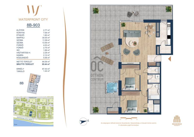 Projekt bemutatásaA projektrőlA Waterfront City egy új, modern városnegyed a 3. kerületben, ahol a természet közelsége és a városi kényelem tökéletes egyensúlyban van. A Duna-part közvetlen szomszédságában elhelyezkedő fejlesztés különleges atmoszférát kínál: a sétányt új épületek határolják, üzletekkel, kávézókkal és szolgáltatásokkal, amelyek élhető közösségi teret teremtenek.A 13 emeletes lakóépületből lenyűgöző örökpanoráma nyílik a budai hegyekre és a folyóra, a tágas teraszok pedig ideálisak a pihenéshez vagy a baráti összejövetelekhez. A zöldtetők, parkosított terek és fenntartható megoldások – mint az energiatakarékos rendszerek és okos otthon funkciók – mind hozzájárulnak a modern, környezettudatos életstílushoz.Látogass el értékesítési irodánkba, és tekintsd meg a városnegyed makettjét személyesen! Ismerd meg, milyen lesz az élet Budapest egyik legizgalmasabb új fejlesztésében!Óbuda szívébenKépzeld el, ahogy egy napsütéses délelőttön Óbuda szívében sétálsz, a Duna közelsége frissítően hat rád, miközben a Folyamőr utca, a Miklós tér és a Bogdáni út által határolt, öt hektáros területre érsz. A levegőben ott van a város történelme, mégis minden részletében a jövő hívogat.A 50 000 négyzetméteres területen egy hangulatos sétány vezet végig, amely egyenesen az óbudai Fő térre visz – mindössze 600 méterre. Ez a sétány nem csupán összeköt, hanem élményt nyújt: a Kolosy térről induló Óbudai Promenád részeként a város egyik legélhetőbb, legpezsgőbb szakaszán haladsz végig. És ha biciklivel érkeznél? A nemzetközi kerékpárút is itt halad el, Szentendre felé vezetve.Az 5. ütemben épülő 149 lakás mindegyike egyedi hangulatot kínál. Ahogy belépsz egy-egy otthonba, a hatalmas üvegfelületeken át beáradó fény és a tágas, szellős terek azonnal magukkal ragadnak. A kilátás? A Kaszap István park zöldje nyújt békét, míg a felsőbb emeletekről a Budai-hegység örökpanorámája tárul eléd – minden nap egy új festmény az ablakodban.A 6. ütemben 316 modern lakás épül, tágas teraszokkal és lenyűgöző kilátással a Dunára és a budai hegyekre. A lakók kényelmét őrszolgálat, kamerarendszer, mélygarázs, vendéglátóhelyek, belső park, játszótér és E-autó töltők szolgálják. Ez a projekt utolsó üteme, amely még közvetlen Duna-parti kapcsolattal rendelkezik.