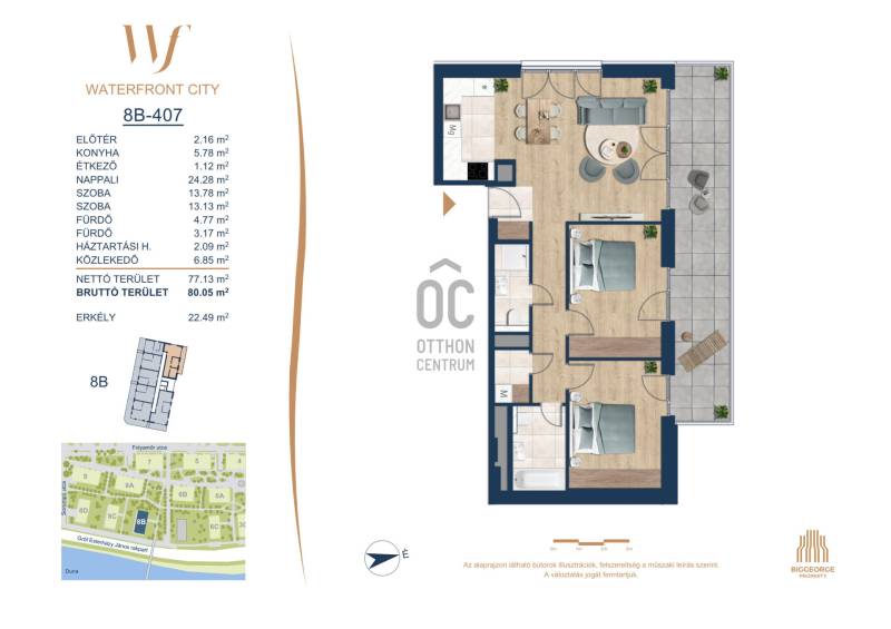 Projekt bemutatásaA projektrőlA Waterfront City egy új, modern városnegyed a 3. kerületben, ahol a természet közelsége és a városi kényelem tökéletes egyensúlyban van. A Duna-part közvetlen szomszédságában elhelyezkedő fejlesztés különleges atmoszférát kínál: a sétányt új épületek határolják, üzletekkel, kávézókkal és szolgáltatásokkal, amelyek élhető közösségi teret teremtenek.A 13 emeletes lakóépületből lenyűgöző örökpanoráma nyílik a budai hegyekre és a folyóra, a tágas teraszok pedig ideálisak a pihenéshez vagy a baráti összejövetelekhez. A zöldtetők, parkosított terek és fenntartható megoldások – mint az energiatakarékos rendszerek és okos otthon funkciók – mind hozzájárulnak a modern, környezettudatos életstílushoz.Látogass el értékesítési irodánkba, és tekintsd meg a városnegyed makettjét személyesen! Ismerd meg, milyen lesz az élet Budapest egyik legizgalmasabb új fejlesztésében!Óbuda szívébenKépzeld el, ahogy egy napsütéses délelőttön Óbuda szívében sétálsz, a Duna közelsége frissítően hat rád, miközben a Folyamőr utca, a Miklós tér és a Bogdáni út által határolt, öt hektáros területre érsz. A levegőben ott van a város történelme, mégis minden részletében a jövő hívogat.A 50 000 négyzetméteres területen egy hangulatos sétány vezet végig, amely egyenesen az óbudai Fő térre visz – mindössze 600 méterre. Ez a sétány nem csupán összeköt, hanem élményt nyújt: a Kolosy térről induló Óbudai Promenád részeként a város egyik legélhetőbb, legpezsgőbb szakaszán haladsz végig. És ha biciklivel érkeznél? A nemzetközi kerékpárút is itt halad el, Szentendre felé vezetve.Az 5. ütemben épülő 149 lakás mindegyike egyedi hangulatot kínál. Ahogy belépsz egy-egy otthonba, a hatalmas üvegfelületeken át beáradó fény és a tágas, szellős terek azonnal magukkal ragadnak. A kilátás? A Kaszap István park zöldje nyújt békét, míg a felsőbb emeletekről a Budai-hegység örökpanorámája tárul eléd – minden nap egy új festmény az ablakodban.A 6. ütemben 316 modern lakás épül, tágas teraszokkal és lenyűgöző kilátással a Dunára és a budai hegyekre. A lakók kényelmét őrszolgálat, kamerarendszer, mélygarázs, vendéglátóhelyek, belső park, játszótér és E-autó töltők szolgálják. Ez a projekt utolsó üteme, amely még közvetlen Duna-parti kapcsolattal rendelkezik.