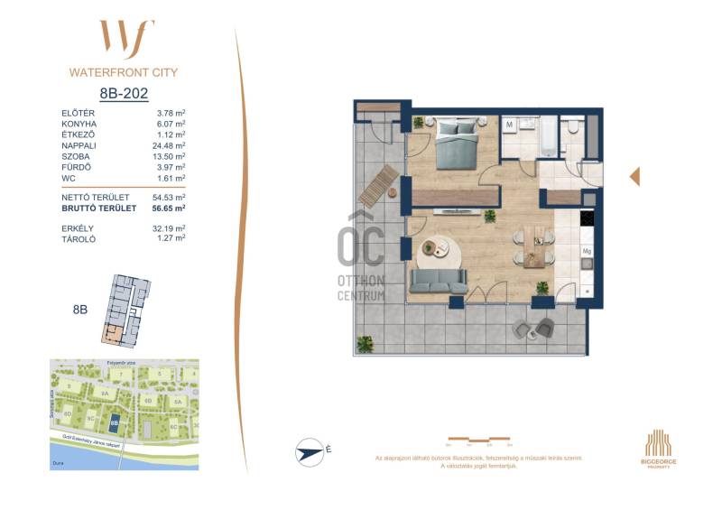 Projekt bemutatásaA projektrőlA Waterfront City egy új, modern városnegyed a 3. kerületben, ahol a természet közelsége és a városi kényelem tökéletes egyensúlyban van. A Duna-part közvetlen szomszédságában elhelyezkedő fejlesztés különleges atmoszférát kínál: a sétányt új épületek határolják, üzletekkel, kávézókkal és szolgáltatásokkal, amelyek élhető közösségi teret teremtenek.A 13 emeletes lakóépületből lenyűgöző örökpanoráma nyílik a budai hegyekre és a folyóra, a tágas teraszok pedig ideálisak a pihenéshez vagy a baráti összejövetelekhez. A zöldtetők, parkosított terek és fenntartható megoldások – mint az energiatakarékos rendszerek és okos otthon funkciók – mind hozzájárulnak a modern, környezettudatos életstílushoz.Látogass el értékesítési irodánkba, és tekintsd meg a városnegyed makettjét személyesen! Ismerd meg, milyen lesz az élet Budapest egyik legizgalmasabb új fejlesztésében!Óbuda szívébenKépzeld el, ahogy egy napsütéses délelőttön Óbuda szívében sétálsz, a Duna közelsége frissítően hat rád, miközben a Folyamőr utca, a Miklós tér és a Bogdáni út által határolt, öt hektáros területre érsz. A levegőben ott van a város történelme, mégis minden részletében a jövő hívogat.A 50 000 négyzetméteres területen egy hangulatos sétány vezet végig, amely egyenesen az óbudai Fő térre visz – mindössze 600 méterre. Ez a sétány nem csupán összeköt, hanem élményt nyújt: a Kolosy térről induló Óbudai Promenád részeként a város egyik legélhetőbb, legpezsgőbb szakaszán haladsz végig. És ha biciklivel érkeznél? A nemzetközi kerékpárút is itt halad el, Szentendre felé vezetve.Az 5. ütemben épülő 149 lakás mindegyike egyedi hangulatot kínál. Ahogy belépsz egy-egy otthonba, a hatalmas üvegfelületeken át beáradó fény és a tágas, szellős terek azonnal magukkal ragadnak. A kilátás? A Kaszap István park zöldje nyújt békét, míg a felsőbb emeletekről a Budai-hegység örökpanorámája tárul eléd – minden nap egy új festmény az ablakodban.A 6. ütemben 316 modern lakás épül, tágas teraszokkal és lenyűgöző kilátással a Dunára és a budai hegyekre. A lakók kényelmét őrszolgálat, kamerarendszer, mélygarázs, vendéglátóhelyek, belső park, játszótér és E-autó töltők szolgálják. Ez a projekt utolsó üteme, amely még közvetlen Duna-parti kapcsolattal rendelkezik.