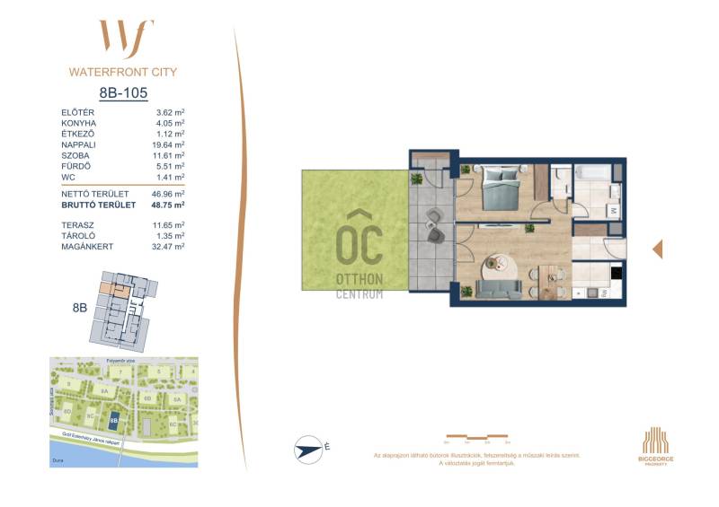 Projekt bemutatásaA projektrőlA Waterfront City egy új, modern városnegyed a 3. kerületben, ahol a természet közelsége és a városi kényelem tökéletes egyensúlyban van. A Duna-part közvetlen szomszédságában elhelyezkedő fejlesztés különleges atmoszférát kínál: a sétányt új épületek határolják, üzletekkel, kávézókkal és szolgáltatásokkal, amelyek élhető közösségi teret teremtenek.A 13 emeletes lakóépületből lenyűgöző örökpanoráma nyílik a budai hegyekre és a folyóra, a tágas teraszok pedig ideálisak a pihenéshez vagy a baráti összejövetelekhez. A zöldtetők, parkosított terek és fenntartható megoldások – mint az energiatakarékos rendszerek és okos otthon funkciók – mind hozzájárulnak a modern, környezettudatos életstílushoz.Látogass el értékesítési irodánkba, és tekintsd meg a városnegyed makettjét személyesen! Ismerd meg, milyen lesz az élet Budapest egyik legizgalmasabb új fejlesztésében!Óbuda szívébenKépzeld el, ahogy egy napsütéses délelőttön Óbuda szívében sétálsz, a Duna közelsége frissítően hat rád, miközben a Folyamőr utca, a Miklós tér és a Bogdáni út által határolt, öt hektáros területre érsz. A levegőben ott van a város történelme, mégis minden részletében a jövő hívogat.A 50 000 négyzetméteres területen egy hangulatos sétány vezet végig, amely egyenesen az óbudai Fő térre visz – mindössze 600 méterre. Ez a sétány nem csupán összeköt, hanem élményt nyújt: a Kolosy térről induló Óbudai Promenád részeként a város egyik legélhetőbb, legpezsgőbb szakaszán haladsz végig. És ha biciklivel érkeznél? A nemzetközi kerékpárút is itt halad el, Szentendre felé vezetve.Az 5. ütemben épülő 149 lakás mindegyike egyedi hangulatot kínál. Ahogy belépsz egy-egy otthonba, a hatalmas üvegfelületeken át beáradó fény és a tágas, szellős terek azonnal magukkal ragadnak. A kilátás? A Kaszap István park zöldje nyújt békét, míg a felsőbb emeletekről a Budai-hegység örökpanorámája tárul eléd – minden nap egy új festmény az ablakodban.A 6. ütemben 316 modern lakás épül, tágas teraszokkal és lenyűgöző kilátással a Dunára és a budai hegyekre. A lakók kényelmét őrszolgálat, kamerarendszer, mélygarázs, vendéglátóhelyek, belső park, játszótér és E-autó töltők szolgálják. Ez a projekt utolsó üteme, amely még közvetlen Duna-parti kapcsolattal rendelkezik.