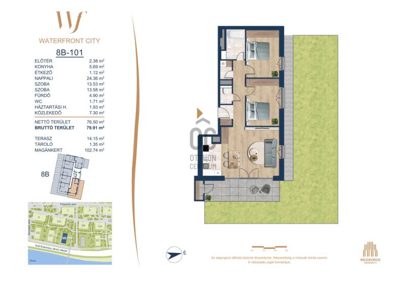 Projekt bemutatásaA projektrőlA Waterfront City egy új, modern városnegyed a 3. kerületben, ahol a természet közelsége és a városi kényelem tökéletes egyensúlyban van. A Duna-part közvetlen szomszédságában elhelyezkedő fejlesztés különleges atmoszférát kínál: a sétányt új épületek határolják, üzletekkel, kávézókkal és szolgáltatásokkal, amelyek élhető közösségi teret teremtenek.A 13 emeletes lakóépületből lenyűgöző örökpanoráma nyílik a budai hegyekre és a folyóra, a tágas teraszok pedig ideálisak a pihenéshez vagy a baráti összejövetelekhez. A zöldtetők, parkosított terek és fenntartható megoldások – mint az energiatakarékos rendszerek és okos otthon funkciók – mind hozzájárulnak a modern, környezettudatos életstílushoz.Látogass el értékesítési irodánkba, és tekintsd meg a városnegyed makettjét személyesen! Ismerd meg, milyen lesz az élet Budapest egyik legizgalmasabb új fejlesztésében!Óbuda szívébenKépzeld el, ahogy egy napsütéses délelőttön Óbuda szívében sétálsz, a Duna közelsége frissítően hat rád, miközben a Folyamőr utca, a Miklós tér és a Bogdáni út által határolt, öt hektáros területre érsz. A levegőben ott van a város történelme, mégis minden részletében a jövő hívogat.A 50 000 négyzetméteres területen egy hangulatos sétány vezet végig, amely egyenesen az óbudai Fő térre visz – mindössze 600 méterre. Ez a sétány nem csupán összeköt, hanem élményt nyújt: a Kolosy térről induló Óbudai Promenád részeként a város egyik legélhetőbb, legpezsgőbb szakaszán haladsz végig. És ha biciklivel érkeznél? A nemzetközi kerékpárút is itt halad el, Szentendre felé vezetve.Az 5. ütemben épülő 149 lakás mindegyike egyedi hangulatot kínál. Ahogy belépsz egy-egy otthonba, a hatalmas üvegfelületeken át beáradó fény és a tágas, szellős terek azonnal magukkal ragadnak. A kilátás? A Kaszap István park zöldje nyújt békét, míg a felsőbb emeletekről a Budai-hegység örökpanorámája tárul eléd – minden nap egy új festmény az ablakodban.A 6. ütemben 316 modern lakás épül, tágas teraszokkal és lenyűgöző kilátással a Dunára és a budai hegyekre. A lakók kényelmét őrszolgálat, kamerarendszer, mélygarázs, vendéglátóhelyek, belső park, játszótér és E-autó töltők szolgálják. Ez a projekt utolsó üteme, amely még közvetlen Duna-parti kapcsolattal rendelkezik.