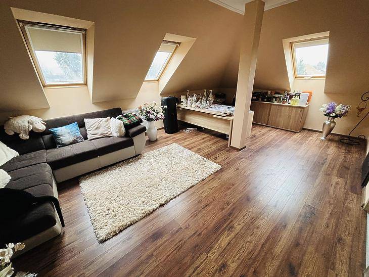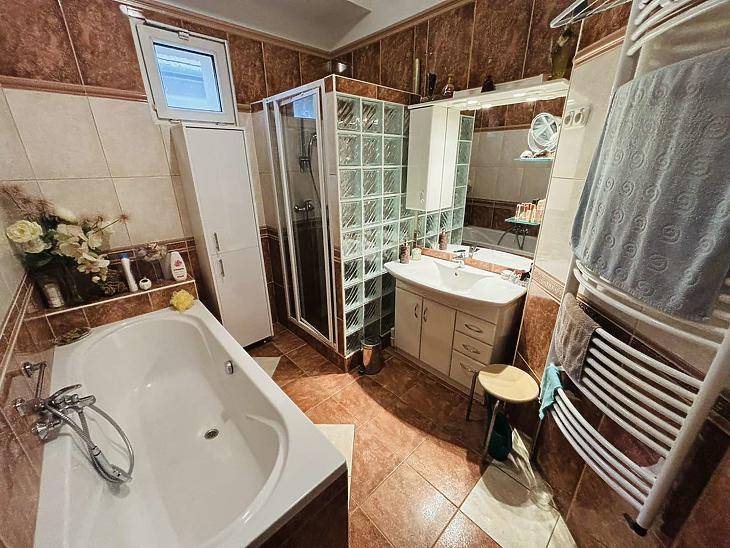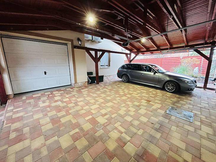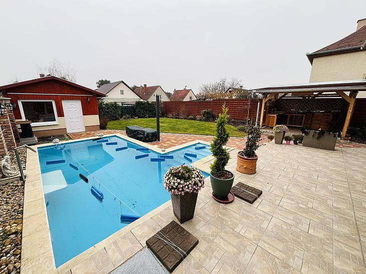 Eladásra kínálunk Fót közkedvelt és könnyen megközelíthető részén egy kivételes adottságokkal rendelkező, 320 m²-es, két szintes luxus családi házat, amelyhez egy igényesen kialakított, 622 m²-es telek tartozik.Az ingatlan 38-as porotherm téglából épült, modern dryvit szigeteléssel, prémium minőségű, hőszigetelt műanyag nyílászárókkal felszerelve, beépített redőnyökkel. A házba lépve egy tágas, 45 m²-es amerikai konyhás nappali fogad, amelyben a falba rejtett házimozi rendszer és leereszthető projektorvászon teremt igazi mozis élményt. A földszinten két kényelmes hálószoba, fürdőszoba, WC, mosókonyha, előszoba és egy fűthető garázs kapott helyet.Az emeleten egy impozáns nappali várja az új tulajdonost – szükség esetén konyha kialakítására is adott a lehetőség –, emellett négy hálószoba, egy újabb fürdő, WC és egy praktikus gardróbhelyiség biztosítja a komfortot.A ház fűtéséről korszerű kondenzációs kazán, padlófűtés és hűtő-fűtő klímák gondoskodnak, minden helyiségben külön szabályozható hőmérséklettel. A belső tereket Versace burkolatok, egyedi gépészet, valamint központi porszívórendszer teszi igazán elegánssá.A parkolás teljes mértékben megoldott: az 50 m²-es, fedett viacolor beállón akár három autó is kényelmesen elfér, a garázs elektromos, 8 méter széles szekcionált kapuval felszerelt, a ház előtt pedig további két parkolóhely áll rendelkezésre. A napelem és hőszivattyú kiépítése előkészítve, a H-tarifa igénylése folyamatban, a puffertartály már beépítésre került.A hátsó kert igazi privát wellness- és pihenőzóna. Az 50 m²-es fedett teraszról egy 7,5 × 3,5 méteres, 1,6 m mély, kiváló felszereltségű fűthető medencéhez jutunk, mely ellenáramoltatóval, automata vegyszeradagolóval, vízlágyítóval, valamint nyak- és hátmasszírozóval is rendelkezik. A gépészetet egy külön, 25 m²-es melléképület rejti, ahol egy szauna is kialakításra került A kertben ezen kívül fedett kerti sütögető is szolgálja a maximális kikapcsolódást.A telek rendezett, vakondhálóval ellátott, gyepszőnyeggel borított, automata öntözőrendszerrel és fúrt kúttal kiegészítve – minden adott a gondtalan kertápoláshoz.Megtekintés miatt kérem, vegye fel a kapcsolatot irodánkkal!