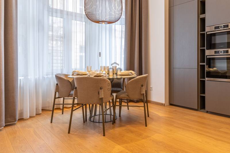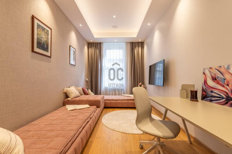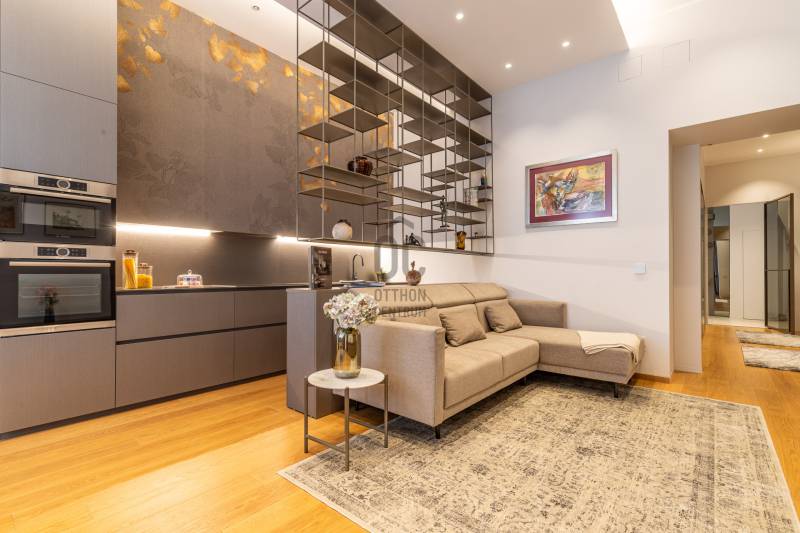 A 96 m²-es, tökéletes arányú, magas minőségben kivitelezett luxuslakásban három elegáns hálószoba, három fürdőszoba, valamint egy külön vendégmosdó kínálja a kényelmet.Minden részletében érződik az időtálló anyagok ereje, és az a harmónia, amelyet csak igazán átgondolt terek tudnak megteremteni.A bejárat előtt egy privát, zárható rész fogadja az érkezőt – egy intim kültéri tér, amely teraszként funkcionál, és már az ajtó előtt megadja a lakás exkluzív, külön világát.Belépni ide olyan érzés, mintha egy modern műalkotásba lépnénk:a fény, a formák, a textúrák és a légies elegancia egyszerre teremtik meg azt a különleges atmoszférát, amelyet nem lehet mással összetéveszteni. - Üdv itthon!MŰALKOTÁS A TÉR FELETT – MODERN KÉNYELEM ÉS FINOM ELEGANCIAEz a lakás nem egyszerű felújítást kapott – teljes átalakuláson ment keresztül, amely során minden centimétert újragondoltak.A modern technológia, a minőségi anyaghasználat és az időtálló elegancia találkozása olyan harmonikus egységet hozott létre, amely tiszteletben tartja a klasszikus épület karakterét, mégis egy letisztult, kortárs otthont eredményez.A 32 m²-es amerikai konyhás nappali a lakás központi tere, ahonnan az étkező íves ablakai gyönyörű fényívet hoznak létre.Nappal természetes fényben fürdik a helyiség, este pedig meghitt hangulatot kölcsönöz – egy olyan tér, amely minden élethelyzethez alkalmazkodni tud.HÁLÓSZUITEK – FUNKCIONÁLISAN ÁTGONDOLT, PRIVÁT TEREK• Szülői lakosztály Tágas, különálló élettér saját fürdőszobával és gardróbbal, amely teljes nyugalmat és intimitást biztosít a mindennapokhoz.• Gyermeklakosztályok A lakás két gyerekszobával rendelkezik, mindegyik saját funkcionális háttérrel: az egyik gyerekszoba önálló lakrész, zuhanyzós fürdővel és gardróbbal, a másik gyerekszoba egy külön, kádas fürdőszobához kapcsolódik.EGYEDI TERVEZÉS ÉS PRÉMIUM ANYAGOKA lakás minden helyiségében egyedileg gyártott beépített bútorok találhatók, a belsőépítész tervei alapján kialakítva.A részletekben rejlő harmónia – textúrák, formák, világítások – egy modern, mégis lélekkel teli otthont hoz létre.Konyha – funkció és design találkozásaA konyha prémium minőségű beépített gépekkel felszerelt - Bosch készülékekkel, és végig a belsőépítész által megtervezett, egyedi konyhabútorral.Olasz nosztalgia radiátorok - Különleges esztétikai elemként, mégis praktikus funkcióval, a tér elegáns karakterét erősítik.OKOS OTTHON – KÉNYELEM A MINDENNAPOKBANA lakás modern technológiai rendszereinek köszönhetően teljeskörűen okosotthonként működik:- távolról vezérelhető fűtés,- telefonról irányítható világítás,- integrált okosotthon-vezérlés,- hangtechnika minden szobában,- modern riasztórendszer a maximális biztonságért.A technológia diszkréten simul bele a terekbe, miközben a kényelmet és az élményt napról napra fokozza.ÉPÜLETA lakás egy 1900 körül épült, történelmi hangulatú, szépen megőrzött polgári ház első emeletén található.Az épület rendezett, lifttel felszerelt, tiszta, pénzügyileg stabil, és a meglévő megtakarításoknak köszönhetően folyamatosan karbantartott.A közös költség 24.000 Ft/hó, amely a szokásos üzemeltetési díjakat tartalmazza.Minden közmű (víz, villany, gáz) egyedi mérőórák alapján fizetendő.Parkolás a környéken közterületen lehetséges, bejelentett lakosok számára kedvezményes parkolási engedéllyel.A közelben több helyen is van garázsbérlési lehetőség, ami tovább növeli a mindennapi kényelmet.LOKÁCIÓMiért érdemes ide költöznöd vagy itt befektetned?- Budapest egyik legkarakteresebb városrésze – Belső-Ferencváros a maga történelmi utcavonalaival, felújított házaival és modern városi hangulatával különleges elegyet alkot.- A környezet egyszerre életteli és megnyugtató: hangulatos kávézók, díjnyertes éttermek, galériák és kreatív terek szegélyezik a környéket.- Pár perc séta a Ráday utca, amely ma Budapest egyik legnépszerűbb gasztrokultúrája – teraszos éttermek, kávézók, borbárok sorakoznak egymás mellett.- A Kálvin tér és a környező egyetemek közelsége (ELTE, BME, Károli) pezsgő, mégis kulturált városi életet biztosít.- Mindössze néhány percre található a Fővám tér, a Duna-part és a Vásárcsarnok – ahol friss alapanyagok, különleges piac hangulat és valódi városi energia vár.- A közlekedés elsőrangú: M3 és M4 metró, számos buszjárat, villamosvonal és a belváros minden pontja könnyen elérhető.- A környék teljes infrastruktúrával rendelkezik: üzletek, gyógyszertár, bankok, fitnesztermek, szolgáltatások karnyújtásnyira.- Kulturális értékben rendkívül gazdag térség – könyvtárak, egyetemek, színházak, galériák, koncerthelyszínek mind a közelben.- Kikapcsolódási lehetőségek egész sora: esti Duna-parti séta, brunch a környék újhullámos kávézóiban, vagy vacsora Budapest egyik kedvenc gourmet negyedében.- A legközelebbi bevásárlóközpontok, mint a Corvin Plaza vagy a Westend, néhány megállóra elérhetők.A környék összességében biztonságos, modern és barátságos – olyan élettér, ahol a mindennapok minősége új szintre emelkedik, legyen szó saját otthonról vagy prémium befektetésről.Engedd, hogy személyesen is átjárjon a hely hangulata – várom hívásod!----------------------------------------------Díjmentes, bankfüggetlen hiteltanácsadással támogatjuk vevő ügyfeleinket a számukra legelőnyösebb finanszírozási döntések meghozatalában. Opcionálisan igénybe vehető kiegészítő szolgáltatásainkkal – mint ügyvédi közreműködés, energetikai tanúsítvány vagy villamos biztonsági felülvizsg