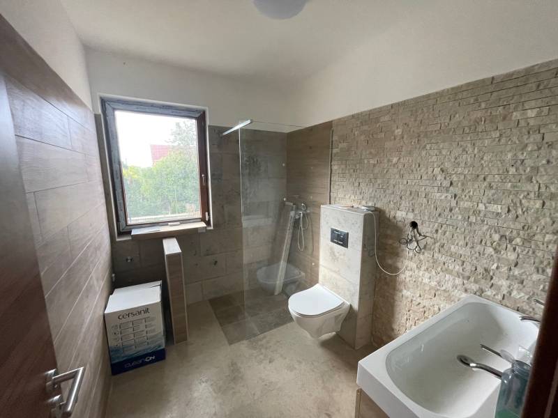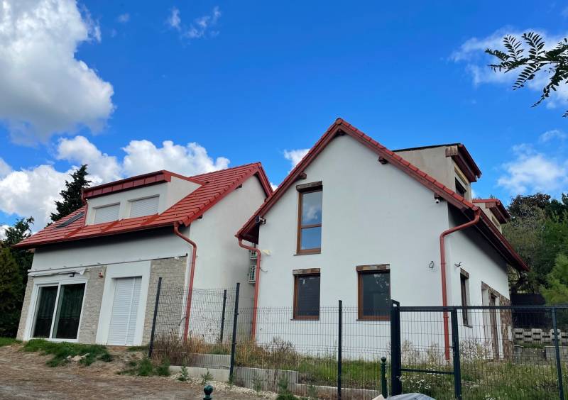 TIHANYBAN ÚJ ÉPÍTÉSŰ IKERHÁZFÉL - NYARALÓ ELADÓTihany Gödrös település részén kínáljuk eladásra ezt az új építésű, 104 m2 alapterületű, belső két szintes ikerházat, 250 m2-es saját használatú kertrésszel és autóbeállóval, amely a 100 m2-es közös területen kerül kialakításra.A 720 m2-es teljes telek területen két, egymástól jól elkülönített ház áll, amelynek nincs közös fala, a két épületet egy kis tárolóhelyiség köti össze. A két épület 6,00 x 8,96 m befoglaló alapterületű, egymástól tartószerkezetileg független, földszintes+ tetőteres, magas tetős, kétegységes üdülőépület, amely két család számára megfelelő térkapcsolatokkal rendelkezik. Helyiségei: a földszinten amerikai konyhás nappali, melyhez egy 21 m2-es és egy 12 m2-es terasz kapcsolódik, egy hálószoba, egy zuhanyzós fürdőszoba + WC, az emeleten pedig 1+2 hálószoba, háztartási helyiség és egy WC található.Az emeleti ablakból a Balaton víztükre is megcsillan a távolban.A jelenlegi készültség lehetővé teszi új tulajdonosa számára, hogy rövid időn belül használatba tudja venni az ingatlant. Műszaki tartalom: - fűtése: elektromos padlófűtés, a melegvíz ellátást elektromos bojler biztosítja - falazat: Porotherm Klíma 30 cm vtg. égetett kerámia N+F téglafalazat (monolit vasbeton lemezfödém) - tetőszerkezet: 42 fokos fa szerkezetű nyeregtető, Creaton Domino kerámia tetőcserép fedéssel -nyílászárók: műanyag szerkezetű, fa erezetes, barna színű homlokzati nyílászárók kerülnek beépítésre, 3 rétegű hőszigetelő üvegezéssel - klíma kiállások és a napelem előkészítése az új tulajdonos rendelkezésére állElhelyezkedése: a gödrösi szabadstrand 1 km-re, rövid sétával elérhető, buszmegálló 1,3 km, faluközpont, Apátság 1,8 km távolságra.Az ingatlan adásvételekor budapesti lakás beszámítása lehetséges.Tihany Magyarország egyik legszebb fekvésű települése, látványos táji és természeti adottságokban bővelkedő község a Balatonba nyúló Tihanyi-félszigeten. Nemcsak a táj szépsége, de a falu varázslatos hangulata és történelmi emlékei is vonzóvá teszik Tihanyt a turisták számára. Építész- és ingatlanközvetítő irodánk minden hiteles szakmai segítséget meg tud adni, mellyel segíteni tudjuk döntését.Kérje az ingatlan részletes tájékoztató anyagát!Kövesse Balatoniingatlanguru facebook és balatoni_ingatlanguru instagram oldalunkat.Balatoni ingatlanguru – több mint közvetítő