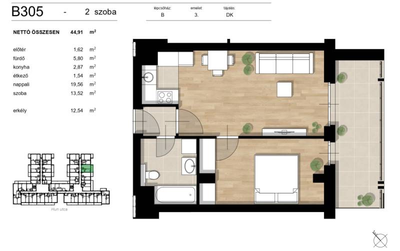 Kezdje az új évet ebben a minőségi, új építésű lakásban!Budapest XIII. kerületében a Hun utcában, új építésű társasházban eladásra kínálok harmadik emeleti, 45 nm-es lakást, 13 nm-es erkéllyel.A lakáshoz teremgarázs hely vásárolható 6.99MFt-ért.A kivitelező több mint 15 éve jelen van a piacon, és több mint 2.500 lakás kivitelezésében vett részt. Kiváló közlekedéssel, a belvárostól mindössze öt percre található.Bevásárlási és rekreációs lehetőségek a közelbenKiváló tömegközlekedésGazdaságos, fenntartható otthonokLegmodernebb hőszivattyús mennyezeti hűtés fűtés, alacsony rezsi!Egyedülálló belső zöld környezetVilágos életterekHangulatos belső térA Róbert Károly körút melletti beruházással elegáns, élhető otthonokat terveztek, fiataloknak, időseknek valamint akiknek fontos a városias de mégis zöld környezet.Részletekért, további információkért várom megtisztelő hívását! B305