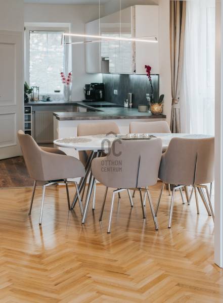 Családosok figyelmébe ajánljuk ezt a frissen felújított, kiváló állapotú, 135 négyzetméteres lakást Budapest 03. kerületének csendes és zöld Mátyás-hegy városrészében. Az ingatlan tökéletes választás lehet mindazok számára, akik egy világos, tágas otthonra vágynak, ahol a természet közelsége és a városi élet előnyei egyaránt megtalálhatók. Az ingatlan bútorozott, így azonnal költözhető, ami különösen előnyös a családok számára, akik nem szeretnék az új lakás berendezésével tölteni az idejüket. LAKÁS: Zárt lépcsőházból jutunk a teljes szintet elfoglaló középső lakásba, a házban csupán felettünk és alattunk van 1-1 szomszédos lakás.A lakás fényárban úszik, körbe napozott a rengeteg üvegfelületen keresztül.Az előszoba - nappali - étkező -konyha egy légteret képezve 55 m2-es területen adja meg a tágas életteret a gyönyörű panorámával és teraszkapcsolattal. A hatalmas teraszt műfűvel fedtük, így még inkább kert hangulatát kelti, nyári baráti összejövetelek, sütögetések ideális helyszíne. Az előszobából külön WC nyílik. A folyosóról közelíthető meg a 3 tágas háló, melyek 22, 20 és 13 m2-esek. A középső méretű hálóból a hátsó kis teraszra jutunk. Egy dupla mosdós nagy sarokkádas fürdőszobán kívül külön zuhanyzó is rendelkezésre áll, itt található a kondenzációs kazán és a mosógép is. A lakás klimatizált, a fűtés okostelefonról is vezérelhető, a terasz elektromos napellenzővel árnyékolt. Az ingatlant pár éve teljesen felújítottuk, riasztó és biztonsági ajtó védi a benne lakókat.Minden gépet és bútort a lakásban hagyunk -amire nincs szükséges a bérlőnek azt természetesen elvisszük.REZSI: Közös költség összesen 49ezer Ft, a fűtési és villanyköltség rendkívül alacsony, 4 fős családnak, előbbi 17 ezer Ft utóbbi 7 ezer Ft volt havi átalányban. A Mátyás-hegy városrész nemcsak a zöld környezetéről ismert, hanem a biztonságos és csendes utcáiról is. A környék ideális helyszín a gyermekek számára, hiszen számos iskola, óvoda és játszótér található a közelben. Az autóval közlekedők számára a belváros hamar elérhető. Ez a hegyvidéki ingatlan nem csupán egy lakás, hanem egy otthon, ahol a családok együtt élhetik meg a mindennapok örömeit. Amennyiben további kérdései lennének, vagy szeretné megtekinteni ezt a különleges ingatlant, bizalommal kereshet minket. Szívesen állunk rendelkezésére, hogy segítsünk megtalálni az Ön számára legmegfelelőbb otthont.
