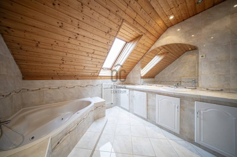 Eladó Budaörs egyik csendes mellékutcájában egy 280 m2-es, alacsony fenntartási költségű, élhető méretű kerttel rendelkező családi ház. Összesen hét szoba (5 teljes és 2 fél) és egy bő 670 m2-es, jó elosztású, ápolt kert biztosítja a többgyermekes családok kényelmét és magas életminőségét. Kér garázs és a kerti beálló akár három személygépkocsit és több motorkerékpárt is elnyel - a garázsokból közvetlenül bejuthatunk a házba anélkül, hogy esőben, fagyban kellene futkároznunk.A ház klimatizált, szinte az összes szobában saját klímakészülék gondoskodik a hűtésről/fűtésről. Egy gázkazán és egy kandalló biztosítja télen a meleget - az éves gázfogyasztás 100 000 forint körül alakul, így ez a lakóház bőven belefér a rezsicsökkentésbe is! A villanyszámla a telepített napelemeknek hála szinte minden hónapban nulla forint, ami a mai gazdasági helyzetben nem egy elenyésző részlet.A kétszintes ház a következő helyiségeket kínálja:Földszint:Előtér, nappali, konyha/étkező, kamra, fürdőszoba-WC, közlekedő, gépészet, vendégszoba/dolgozó, télikert és a garázsokA masszív, tömörfából felépített, kellemesen széles lépcső vezet az emeletre, aholtágas galéria/közlekedő, óriási (22,45 m2-es) szülői háló saját fürdőszoba/WC-vel, gardróbbal, szauna (nem megépített), kis dolgozószoba (4,82 m2), nagy fürdőszoba sarokkáddal, és két nagy gyerekszoba található. A két gyerekszobából közös erkély nyílik, ahonnan a kertre van kilátás.Pár műszaki részlet:- Külső falak 38 cm-es falazóelemekből- Belső teherhordó falak 25-ös falazóelemekből- Válaszfalak 10 cm-es téglából- Hörmann szekcionált garázskapuk- Viacolor „Classico” térkövezés- 11 cm-es szigetelés- Bramac alpesi plusz tetőhéjazat- Esővízgyűjtő rendszer, ami a kert locsolását biztosítja vízköltség nélkül- Fatüzelésű kandalló a nappaliban- Kiépített multimédiarendszer a nappaliban- Padlófűtés kiegészítő radiátorokkal- Tágas konyha prémium bútorzattal, beépített gépekkel- 4 kW teljesítményű napelemrendszer- RiasztrórendszerAz ingatlan jó állapotú, minimális ráköltést igényel. További információkért, kérem, hívjon!