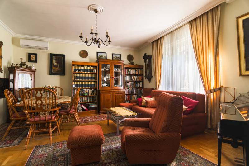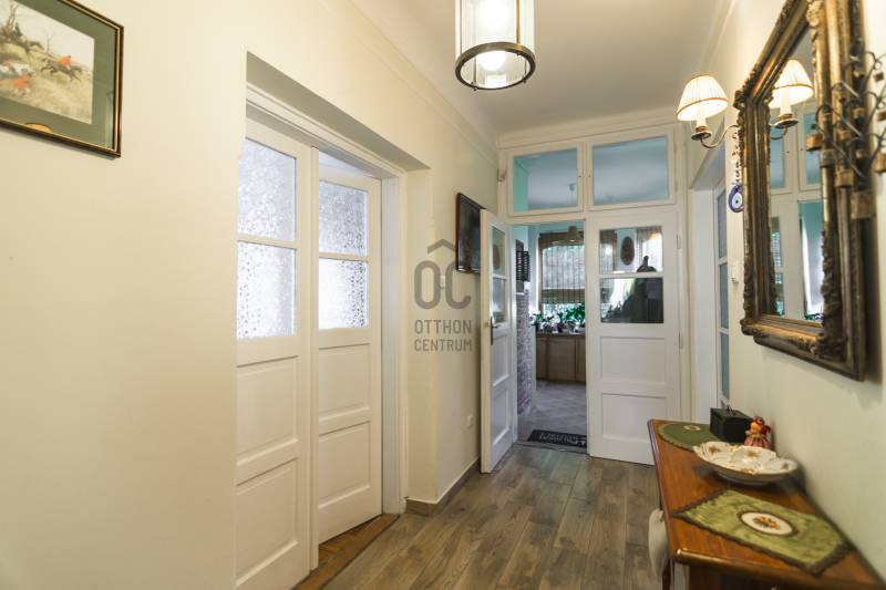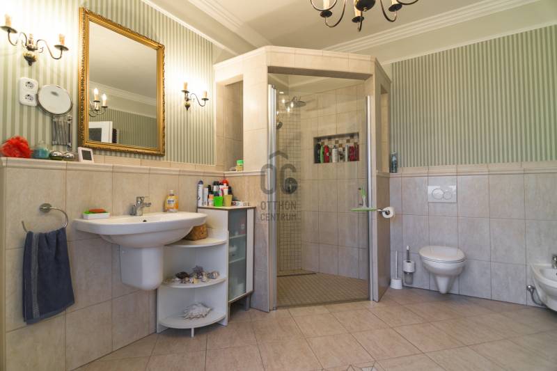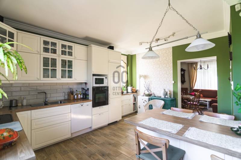 Budaörs Kamaraerőn, a hely egyik legkedveltebb, elegáns utcájában eladó egy otthonos kialakítású, 6 szobás felújított családi ház.A modern polgári stílusú ház praktikus és tetszetős belső kialakítását lakberendezői tervek alapján kivitelezték. A földszinten ízléses, kandallós, hagyományos stílusú nappalit, hozzá kapcsolódó társalgót, modern, ikea berendezéssel rendelkező konyha-étkezőt, kamrát és hatalmas, nagy ablakos világos fürdőszobát találunk. Az emeleten négy nagy méretű hálószoba (ezekből kettő terasz-kapcsolatos), világos fürdőszoba, külön WC van. Az emeleti teraszról a budaörsi panorámában gyönyörködhetünk. A lakótér alatt több helyiségből álló félszuretén/pince található, amely praktikus tárolási lehetőséget biztosít, és itt akár kondiszoba is kialakítható. A ház egy nagyobb család igényeit is kiszolgálja. A házban lévő meleg- és hidegburkolatok jó minőségűek, újszerű állapotúak. A fűtés korszerű, zárt égésterű kondenzációs gázkazánról üzemel. Mindkét lakószinten split klíma is üzemel. A ház 380V-os ipari árammal is ellátott és külön mért éjszakai árammal is rendelkezik. A tető 5 éves, a külső nyílászárók újak; a belsők újak, illetve a ház stílusát megtartva modernizálásra, felújításra kerültek. Ez az otthon remekül élhető. A házat 1170 m2-es ősfás kert öleli körbe, amely a szomszédok irányából és az utca felől is elrejtett. A gépkocsik beállóhelye a pihenőkerttől látványilag elkülönül. A kertben lévő pince és a verem ideálisak bor tárolására, a terasz és a kert pedig extra lehetőségeket biztosít a kikapcsolódásra. A tömegközlekedés kiváló: a díjmentes utazást biztosító budaörsi helyi buszjárat megállója a közelben található, a BKK járatainak megállói pedig pár perc sétával elérhetők. Az M7, M1, M0 autópályák, bevásárlóközpontok 10 perc alatt megközelíthetőek. Óvoda, iskola, művelődési ház a közelben van. A környék jó levegőjű, igazi kertvárosi hangulatú - sétálásra, kikapcsolódásra, feltöltődésre alkalmas. Vadonatúj ajánlat!További részletek és a megtekintés miatt keressen bizalommal! Hétvégén is hívhat.