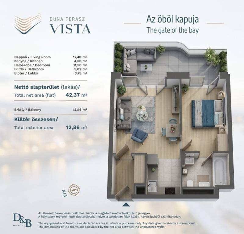 Tervezett átadás: 2026. III. negyedévA 2026 őszén átadásra kerülő Duna Terasz Vista-ban eladó egy 2. emeleti, utcai nézetű kétszobás új építésű lakás.ÖBÖL-PARTI SÁVA Duna Terasz Vista lábánál húzódó öböl-parti terület - átadás után - pihenőpadokkal megszakított lépcsős, füves rézsűvé és part menti sétánnyá alakul, melyről akadálytalanul élvezhető lesz az utánozhatatlan szépségű táj és a hajókikötő egyedülálló atmoszférája.ENERGIAHATÉKONYSÁGA levegő-víz hőszivattyúval kombinált mennyezeti hűtő és fűtő rendszer energiatakarékos működés mellett kiváló hőérzetet is biztosít az AA energiahatékonyságú otthonokban. A kétszintes mélygarázsban e-töltő előkészítésű parkolóhelyek is elérhetőek, ezzel segítve a zöld autózás élményét.DUNA TERASZ VISTA LOKÁCIÓA Foka-öböl mélykék, csillámló víztükre, a mindent körbeölelő természet friss illata, a Duna-parti sétány andalgásra csábító térkövei és a lélegzetelállító naplementék megélése Budapest egyik legjobban őrzött titkai közé tartozik. Pár percre a Váci úti irodafolyosótól és a belváros lüktetésétől megszűnik a rohanás és egy nyugodt, csendes, elegáns lakóövezetbe érkezhetünk haza.A Duna Terasz Vista a Cserhalom utca, Csele utca, Fedélköz utca és a Foka-öböl által határolt területre épül, a Duna Terasz Grande és a folyómenti kalandok közvetlen szomszédságába.XIII. MARINA PART - ahol a Duna-parti életérzés találkozik a belváros közelségévelA budapesti Duna-part egyik legexkluzívabb lakóövezete a XIII. kerületben található Marina part, ahol a természet közelsége és a modern nagyvárosi élet tökéletes harmóniában él együtt.A vízparti panoráma, a rendezett, parkosított környezet és a magas színvonalú építészeti megoldások egyedülálló életteret teremtenek azok számára, akik nem szeretnének kompromisszumot kötni a kényelem és az elhelyezkedés terén.Kiváló elhelyezkedés – percek alatt a belvárosbanA Marina part mindössze:10–15 perc autóval a belvárostól15–20 perc tömegközlekedéssel (M3 metró, villamos, busz)20–25 perc kerékpárral a Parlament vagy a Nyugati tér környékéreA közelben található a Váci út irodafolyosó, a Duna Plaza, valamint számos étterem, kávézó és bevásárlási lehetőség.Várom hívását, keressen bizalommal.