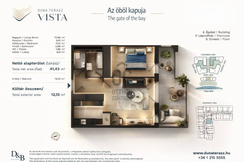 A XIII. kerület ikonikus vízparti negyedében, a Duna Terasz Vista projektben eladó egy 5. emeleti, déli tájolású, kétszobás új építésű lakást, amely a modern építészet és a Duna-parti életérzés kifinomult találkozása. Ez az ingatlan nem csupán egy lakás, hanem egy prémium életstílus része, Budapest egyik legdinamikusabban fejlődő vízparti övezetében, a Marina parton.Tervezett átadás: 2026. III. negyedévDUNA TERASZ VISTA – ikonikus megjelenésA Vista 8 és 9 emeletes épületei karakteres, mégis elegáns formavilággal rajzolják át a Duna-part horizontját. A projekt legkülönlegesebb eleme a kapu formájú, a vízparton álló épületrész, ahol a felsőbb szinteken kialakuló otthonok szinte lebegni látszanak a Foka-öböl felett. Az épületeket körbefutó, hullámzó erkélyek finom vizuális párbeszédet folytatnak az öbölben ringatózó hajókkal. A Cserhalom utcától egészen az öbölpartig húzódó zöld passzázs vizuálisan és fizikailag is megnyitja a teret a lakók előtt – közvetlen kapcsolatot teremtve a vízpart és a parkosított pihenőterületek irányába.ÖBÖL-PARTI SÁV– vízparti eleganciaA projekt lábánál kialakuló öböl-parti terület átadás után lépcsősen kialakított, füves rézsűvel és pihenőpadokkal tagolt sétánnyá alakul. Innen akadálytalanul élvezhető a Foka-öböl mélykék víztükre, a kikötő hangulata és a Duna-part utánozhatatlan atmoszférája. Ez a környezet valódi ritkaság a fővárosban: természetközeli, mégis urbánus.XIII. KERÜLET, MARINA PART A Duna Terasz Vista a Cserhalom utca, Csele utca, Fedélköz utca és a Foka-öböl által határolt területen épül, a Duna Terasz Grande közvetlen szomszédságában.A környék különlegessége:- Duna-parti sétány- Vízparti parkok és pihenőzónák- Pár perc a Váci úti irodafolyosótól- Gyors elérés a belváros feléItt a városi dinamika és a vízparti nyugalom tökéletes egyensúlyban létezik.Ha Ön is a minőséget, az egyedi lokációt és a prémium életérzést keresi, örömmel mutatom be személyesen ezt a kivételes lehetőséget.