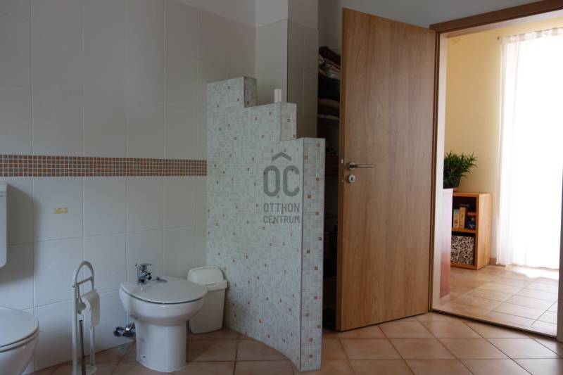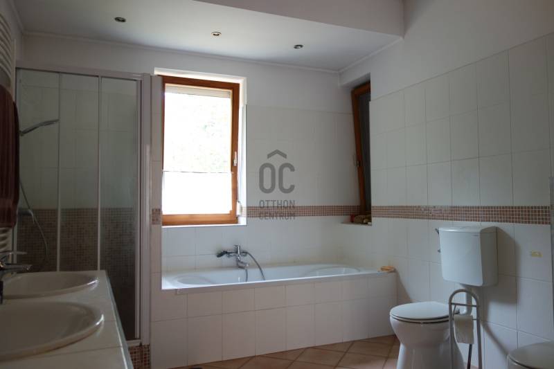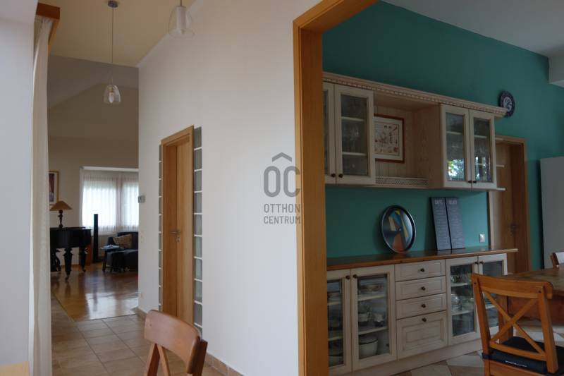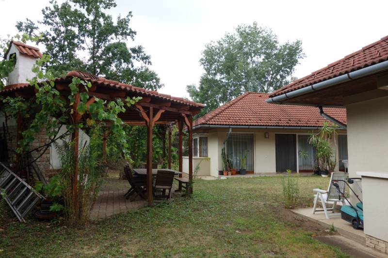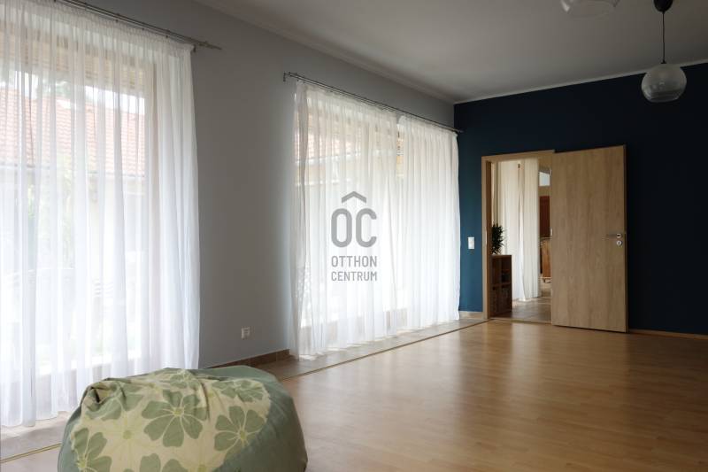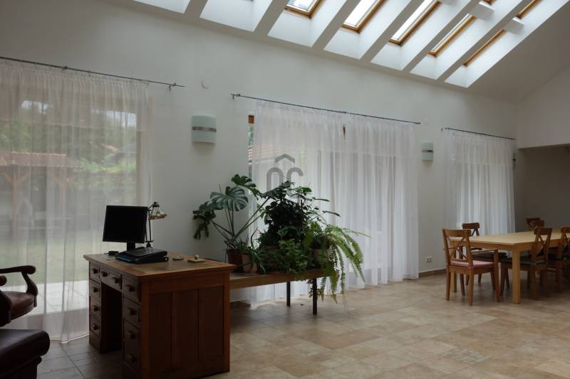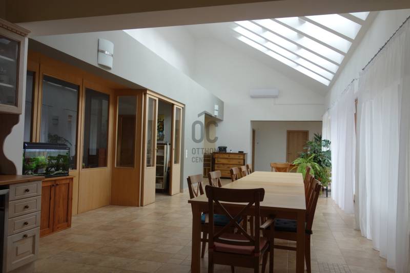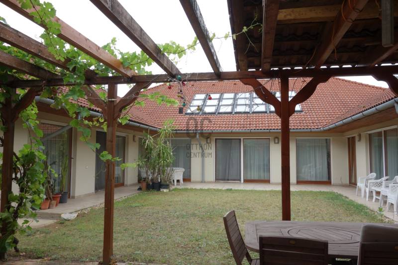 Mogyoródon a méltán kedvelt Szent Jakab lakóparkban eladósorba került egy gyönyörű családi ház. A dupla telken elhelyezkedő ingatlan 2003-ban épült.A körbejárható egy szintes házban nagy terekkel rendelkező otthon kiváló lehet nagyobb családoknak vagy akár több generáció összeköltözésére is. A közel 300nm-s házat 6 szobával, három fürdőszobával tulajdonosai a Feng Shui elvei szerint álmodtak meg. Ennek és az építészeti tervezésnek köszönhetően rendkívül jó energiája vana háznak. Nagy terek, tágas szobák és kényelmes - praktikus kialakítása minden korosztály számára a kényelmet szolgálja. Például mosókonyha, dolgozószoba,gardrobeszoba, fitnesszrészleg és a már beépített tetőteret tárolónak használva. Ez utóbbi tovább fejleszthető, lakótérként használható. Az igen tágas télikertjelenleg étkező-közösségi tér, tetőablakai nyithatóak. A házban akár két különálló lakrész is kialakítható, külön bejárattal. Ennek előkészítése megtörtént, ehhez csupán egy fal megépítése szükséges. Energetikailag kítűnő, besorolása EE, öko jellegű energiafelhasználással. Fűtését a két évvel ezelőtt telepített hőszivattyú, melegvízellátását egy kombi gázkazán biztosítja, mely fűtésre is alkalmas. A házban 4 db klíma található, a hidegburkolatos helyiségekben padlófűtés van. A gyönyörű ősfás nagy telek-kert kiválóan alkalmas családi összejövetelek megrendezésére és kertészkedésre egyaránt. Számos gyümölcsfa, kerti tó és grillező, illetve kemence a szaletli alatt, minden igényt kielégít. A kertben öntözőrendszer és egy kerti tó is kialakításra került. Egy nagyon helyes borospince is helyet kapott a kertben, ahol a család férfitagjai barátokkal elvonulhatnak. Az épület U alakú kialakításával közrefogott terasz és a kert szélvédett, napos. A két állásos garázs tágas, felette tároló kapott helyet. A lakópark nyugalmát őrző-védő szolgálat vigyázza. Nívóját beléptető rendszer és portaszolgálat emeli. A lakópark fenntartása mint közösköltség 25eFt havonta.Aki itt él, csendes, nyugodt zöld környezetben erdő mellett egy másfajta életminőséget tudhat a magáénak. Rendkívül jó a megközelítése, autóval 20-25 perc, hévvel 35perc alatt érhetjük el az Őrs Vezért terét. Tulajdonosai nagyon szeretnek itt élni, gyerekek kirepülése hozatta meg velük az eladás melletti döntést. Várom hívását, egy élmény lesz a bemutató is!