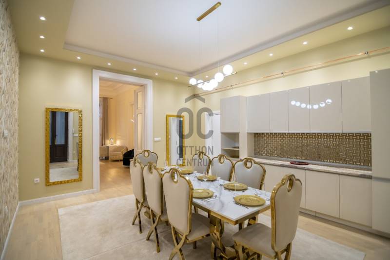 Kiadó luxus polgári lakás az Andrássy úton!Az Andrássy út eleganciáját és történelmi hangulatát ötvözi ez a valóságban 160 m²-es, 4 szobás, teljes körűen felújított, napfényben úszó polgári lakás, amely a klasszikus értékeket és a modern kényelmet egyaránt képviseli. Az 1. emeleten elhelyezkedő ingatlan tágas nappalival és 3 hálószobával rendelkezik, belmagassága eléri a 4 métert, amit a gyönyörű gipszstukkók és a spalettás polgári ablakok tesznek igazán impozánssá.A lakás utcai nézetének köszönhetően világos és napos, a hozzá tartozó TERASZ pedig különleges ritkaság a környéken. A belső terek teljesen berendezve, modern és stílusos bútorokkal várják új bérlőjüket, a konyha és a fürdőszoba minden szükséges géppel felszerelt. A lakás műszaki tartalma is a kényelmet szolgálja: gázcirkó fűtés és klímaberendezés gondoskodik az optimális hőmérsékletről.A társasház , lifttel rendelkezik, a belső udvarban pedig PARKOLÁSI LEHETŐSÉG biztosított.A lakás minden részlete új, így a bérlő egy elegáns, kifogástalan állapotú otthonba költözhet be azonnal.Az épület a főváros egyik ikonikus, reprezentatív palotája, amely a 19. század végén épült a sugárút fénykorában. A ház homlokzatát gazdag díszítés, elegáns arányok és impozáns ablakok jellemzik, belső terei a klasszikus polgári hangulatot idézik. Az Andrássy út központi elhelyezkedése miatt a ház közvetlen közelében megtalálhatók a város legnívósabb éttermei, kávézói, divatházai és kulturális intézményei, így az itt bérelhető lakás nem csupán otthon, hanem igazi életstílus is.Számos Éttermek és kávézók: Művész kávéház, Callas Café & Restaurant,Bombay Curry Bar,Hoppá! Bistro,Nem utolsó sorban az OPERA pár perc séta távolságban.A lokáció kiemelkedő: a belvárosi környezet egyszerre nyugodt és pezsgő, kiváló közlekedési lehetőségek: M1, Busz 105, 210, Deák Tér Reptéri Busz 100E, és villamosmegállók (4,6 pár perc sétára.Egyedi igényekre szabott lakáshitelekkel állunk rendelkezésére.Bankfüggetlen Hitelcentrumunk az országban elérhető összes bank és hitelintézet ajánlatát versenyezteti az Ön számára díjmentesen.Munkatársaink nagy szakmai tapasztalattal, teljes körű CSOK PLUSZ és OTTHON START PROGRAM ügyintézéssel várják Önt előre egyeztetett időpontban akár a normál munkaidő után is.Bővebb információért és a megtekintéssel kapcsolatban hívjon bizalommal!